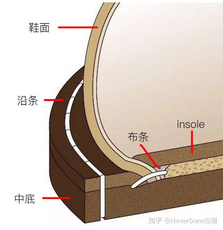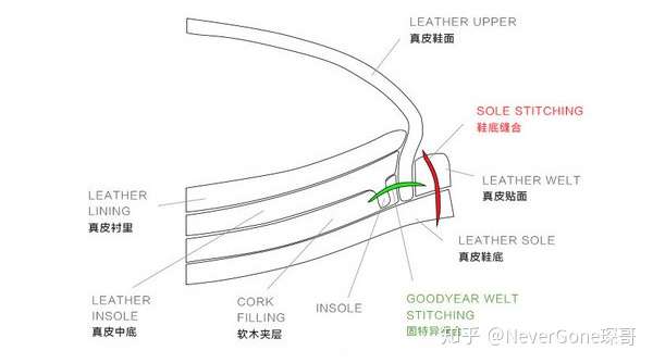 所谓固特异工艺,简单来说就是一条线将insole(内行一般叫中底,但玩家们喜欢叫内底)、鞋面、沿条缝在一起,另一条线将沿条、大底缝在一起。