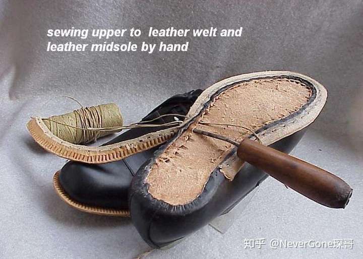 而手工缝制沿条鞋就不会出现这个问题,因为insole是开槽的,直接通过线来和沿条、鞋面缝在一起,没有使用布条,这样就会更加牢固。