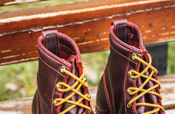鞋带给配的尼龙鞋带,有了这个亮眼的点缀,看起来就更跳脱了。这双是基友买的几年前的版本,因此鞋帮没有使用Wesco 100years的LOGO