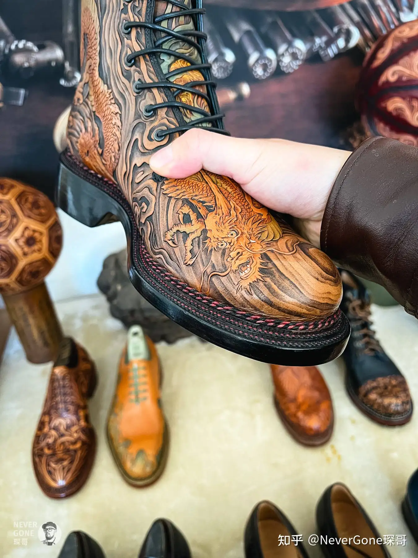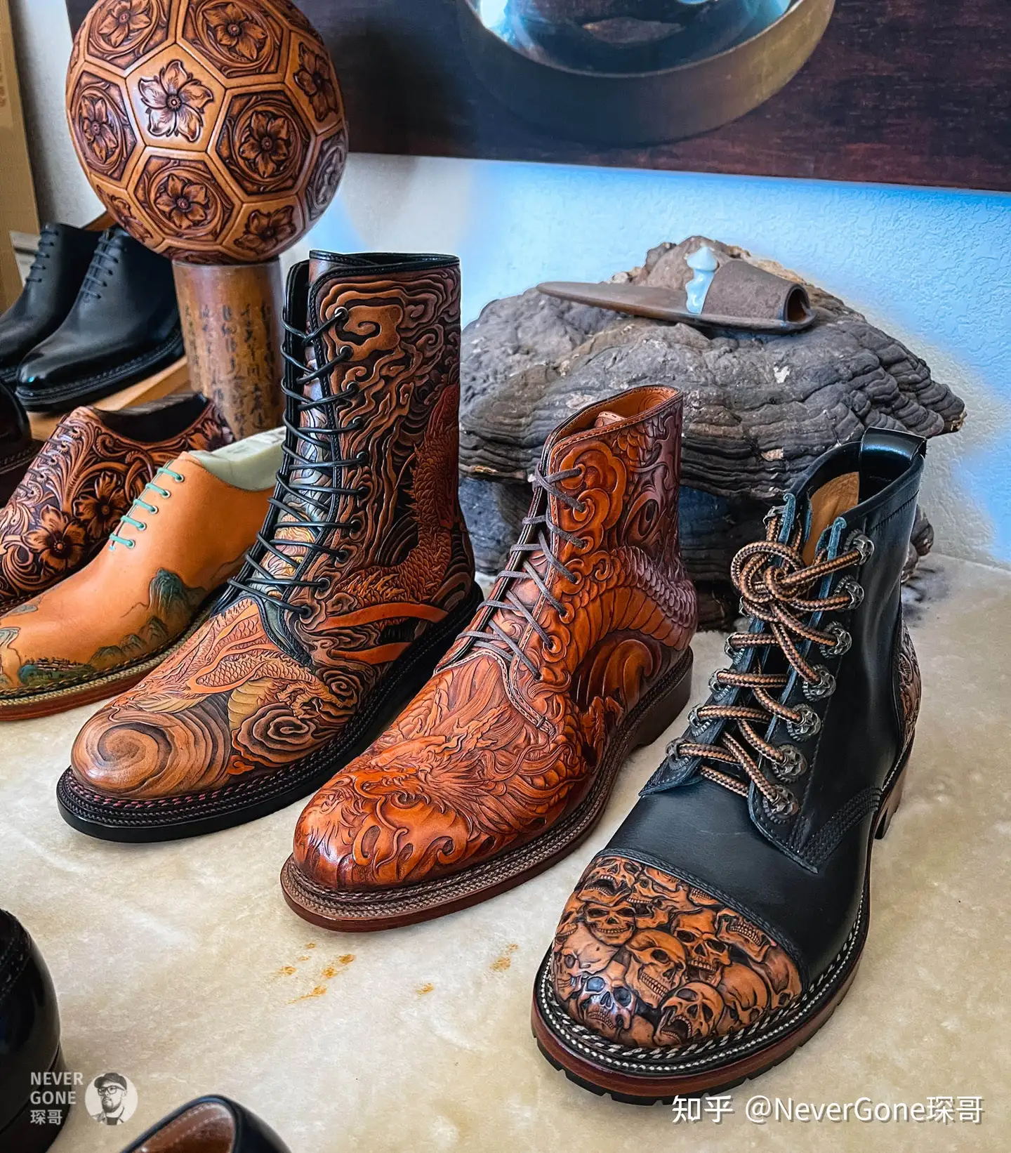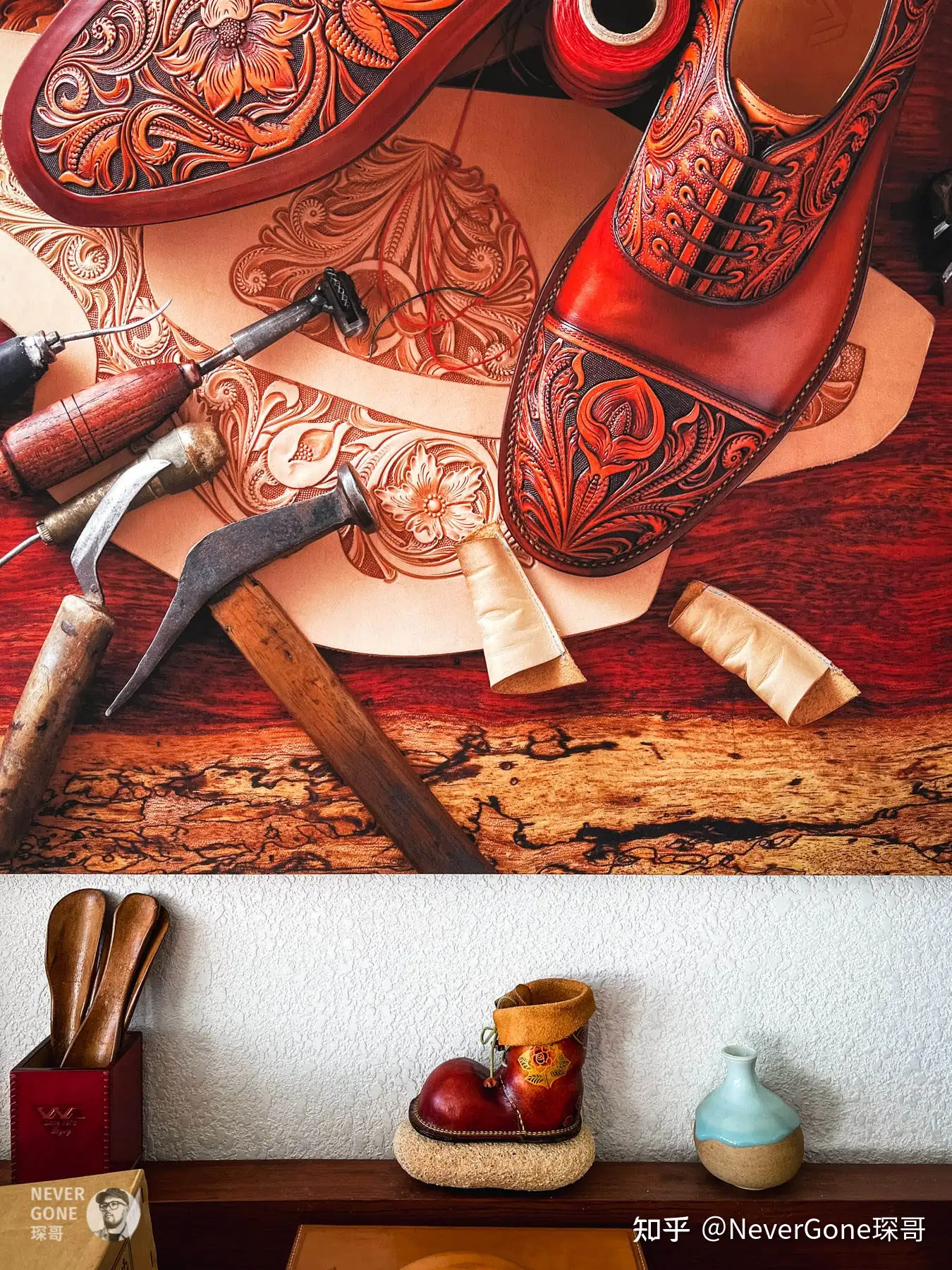 在1978的会客厅,还有更多稀奇古怪的东西,以及各种挑战工艺极限的东西,比如这几双参赛获奖作品,皮雕鞋面非常费时,然后再配上好几道挪威缝