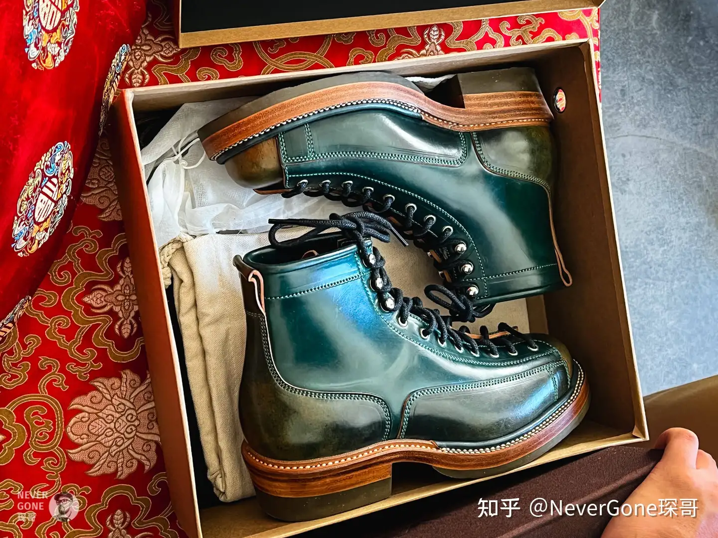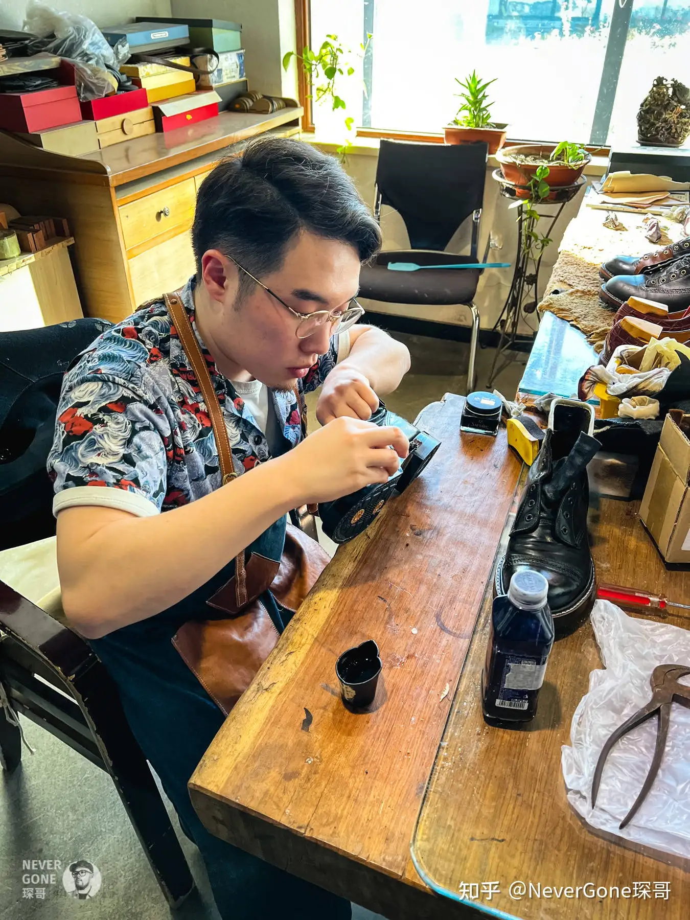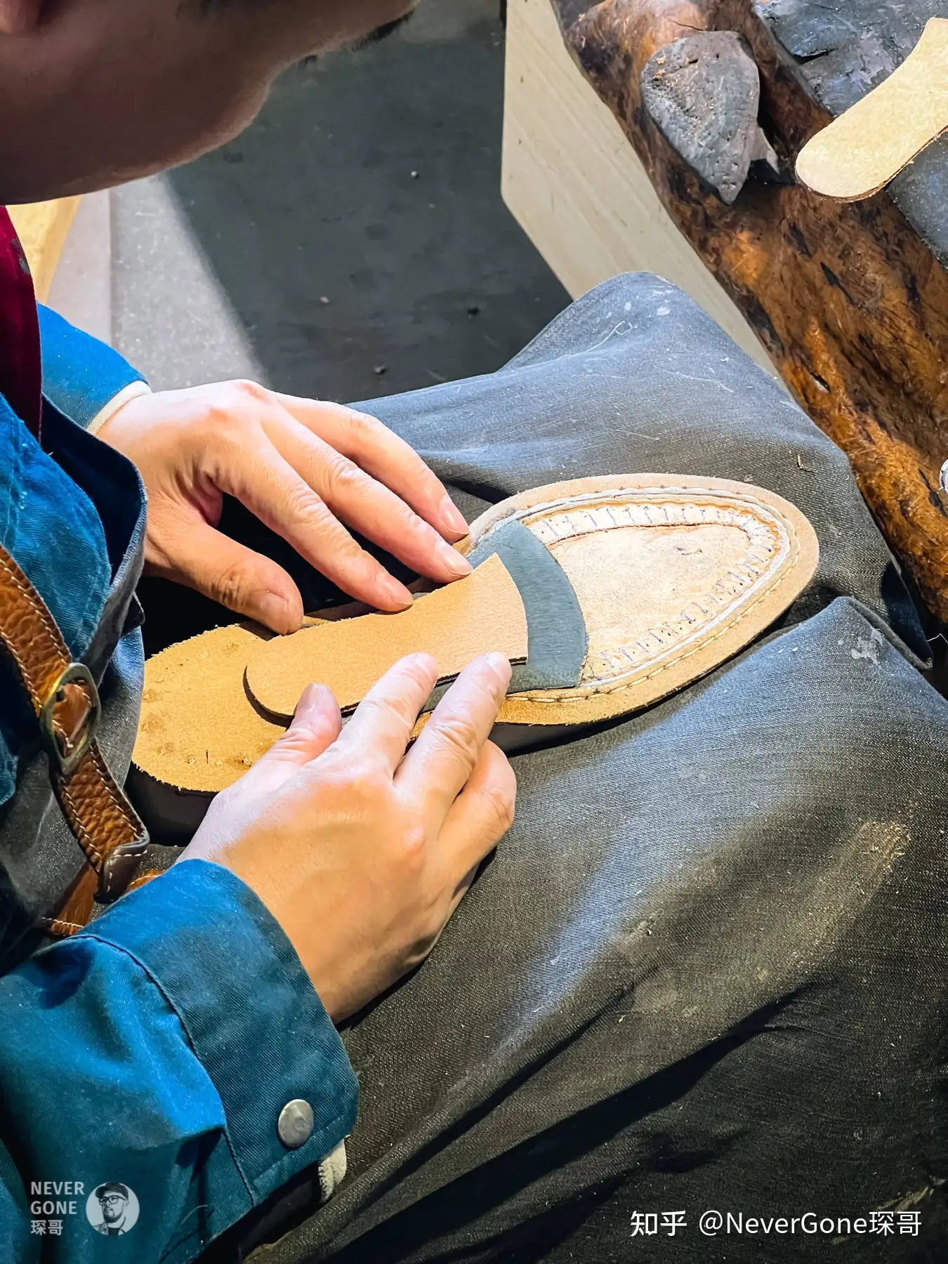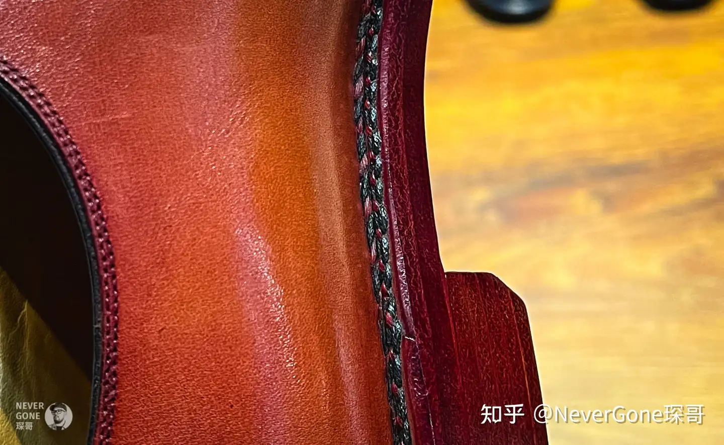 最后的效果就是,这双乍看之下是普通的挪威缝,实际上算是一种精致版的沿条挪威缝,是一双很考验手艺的、结构另类的缝制鞋。关于挪威缝的详细介绍,还请看我刚开公众号时发的这篇挪威缝科普: