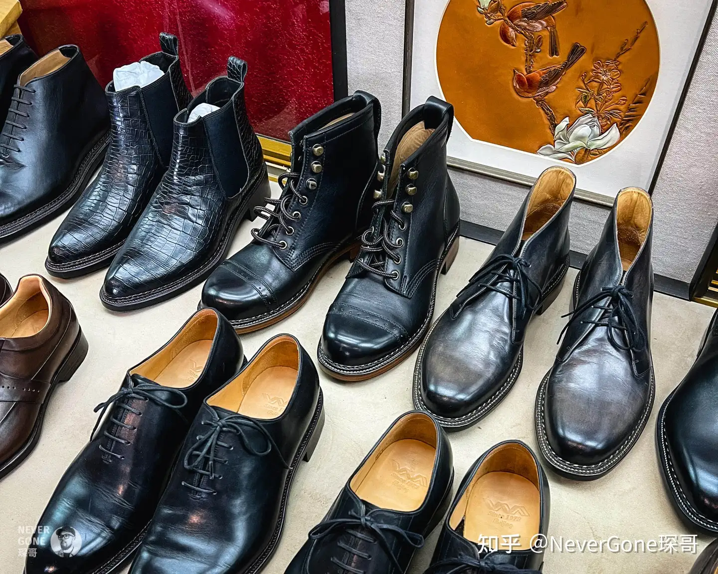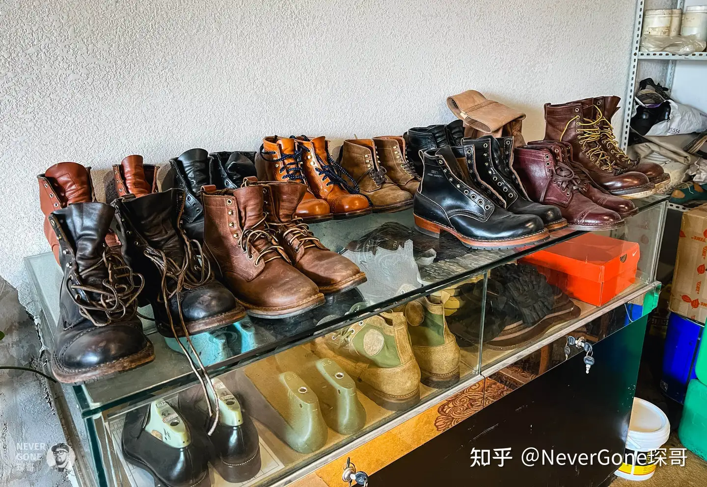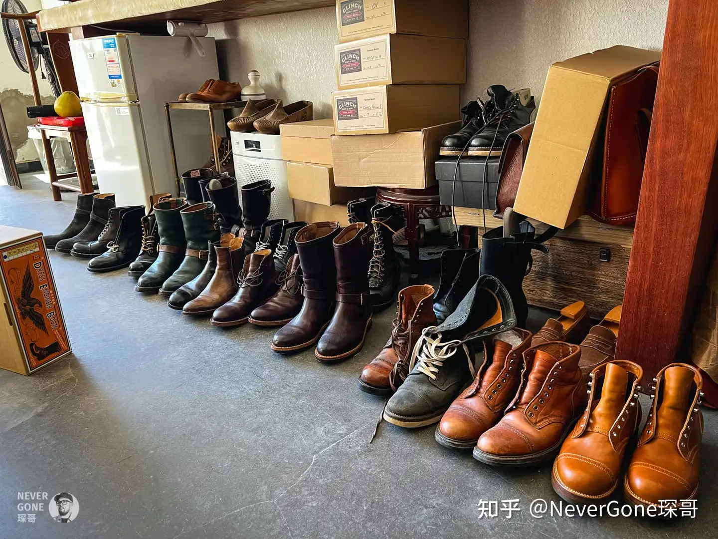 1978这边是以手工正装鞋为主,下面发一些咔叽佬感兴趣的内容吧:在会客厅里有一角,摆满了老刘和老王买的各种工装靴,以高价日产居多,Clinch、Buco、Attractions、Moto、Black Sign啥的都有