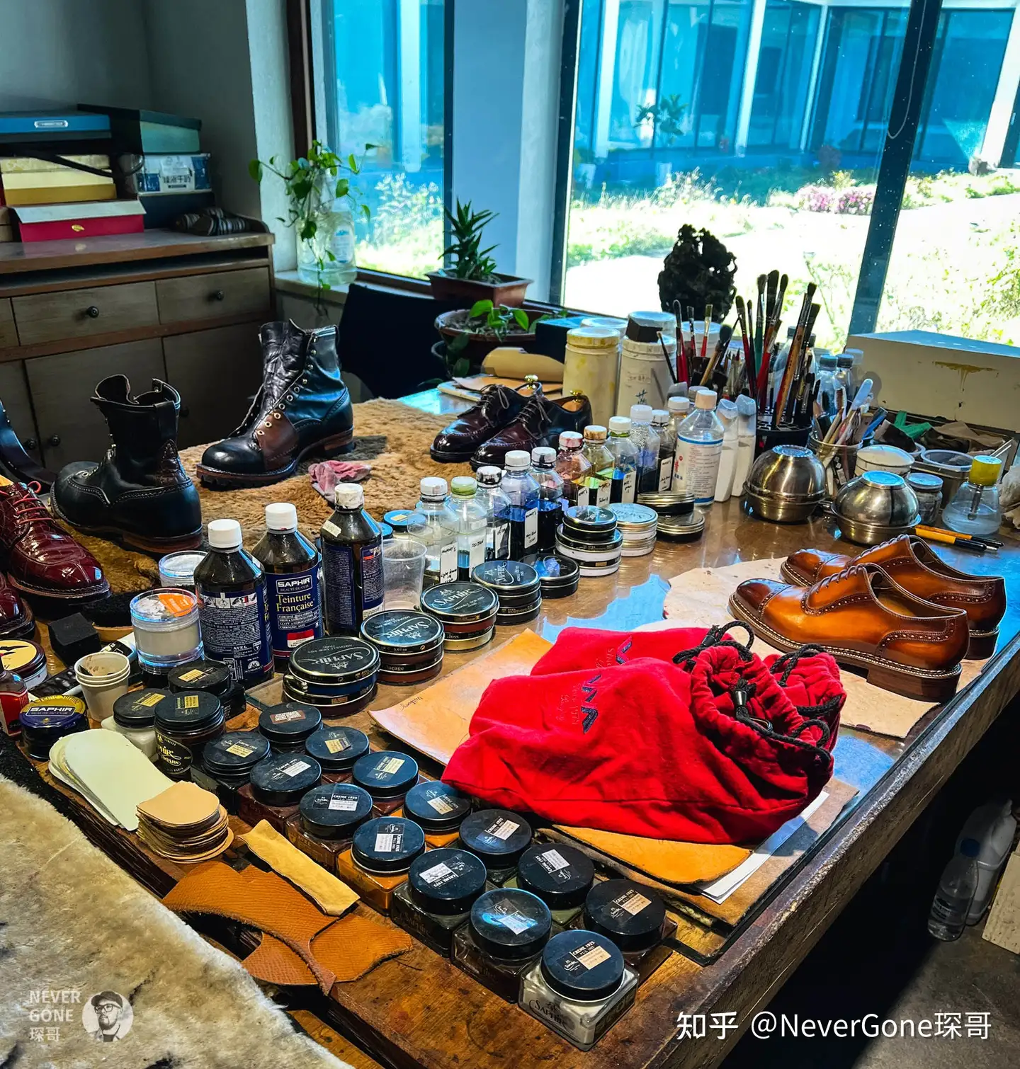 进去后,首先跟着老王来到了改造、保养鞋子的区域,东西真的非常全,这边正装工装都可以操作