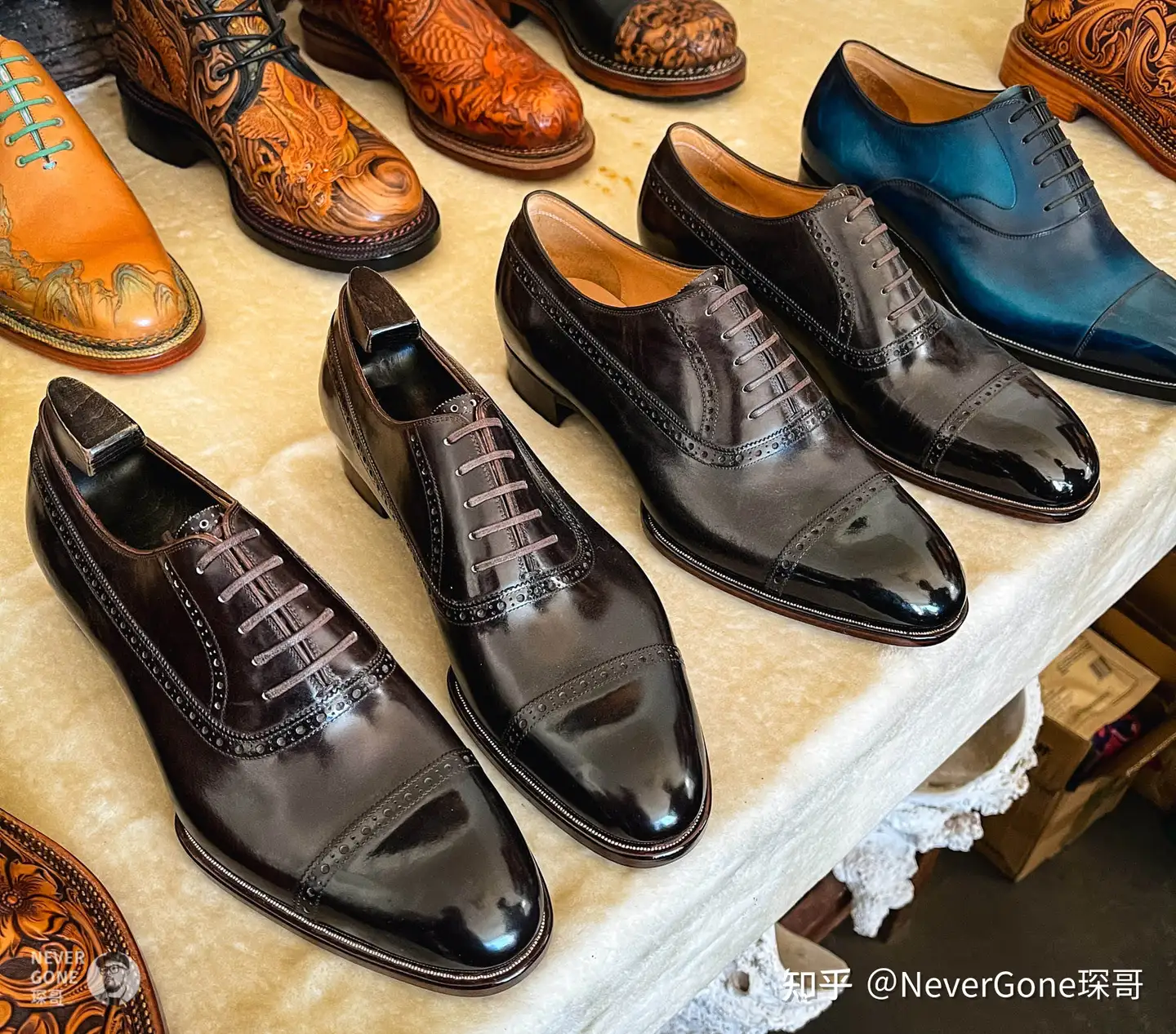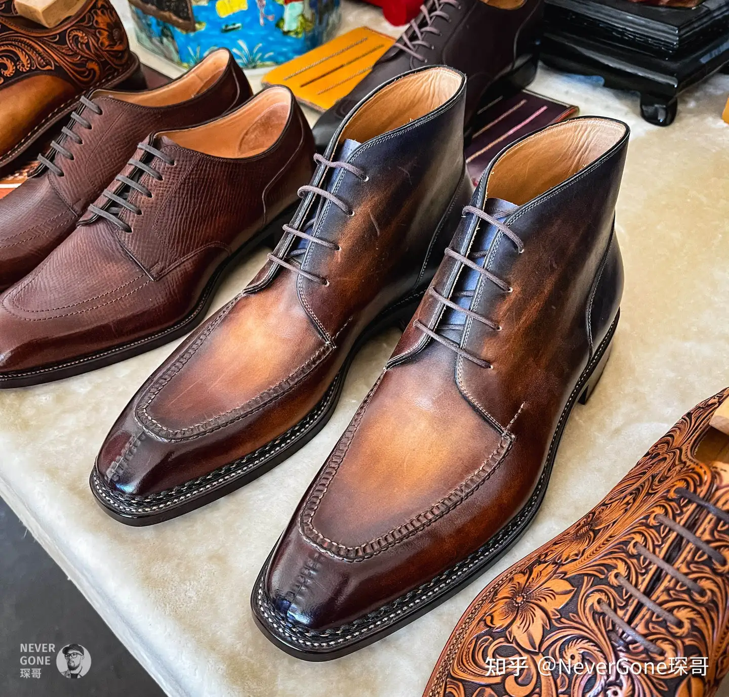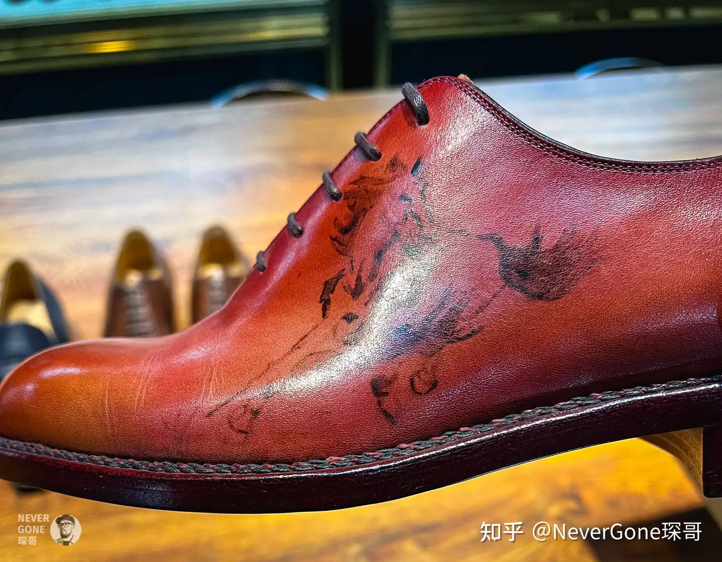 其中有双鞋面手绘的挪威缝非常特别,乍看之下我以为就是普通的外翻挪威缝,但曹总介绍说这个其实是沿条挪威缝。我以前见过的沿条式挪威缝是paraboot那种,像1978这样用一种高难度的方式把沿条挪威缝做的完全不像沿条挪威缝,我真是第一次见了,有一种凡尔赛的味道。。。
