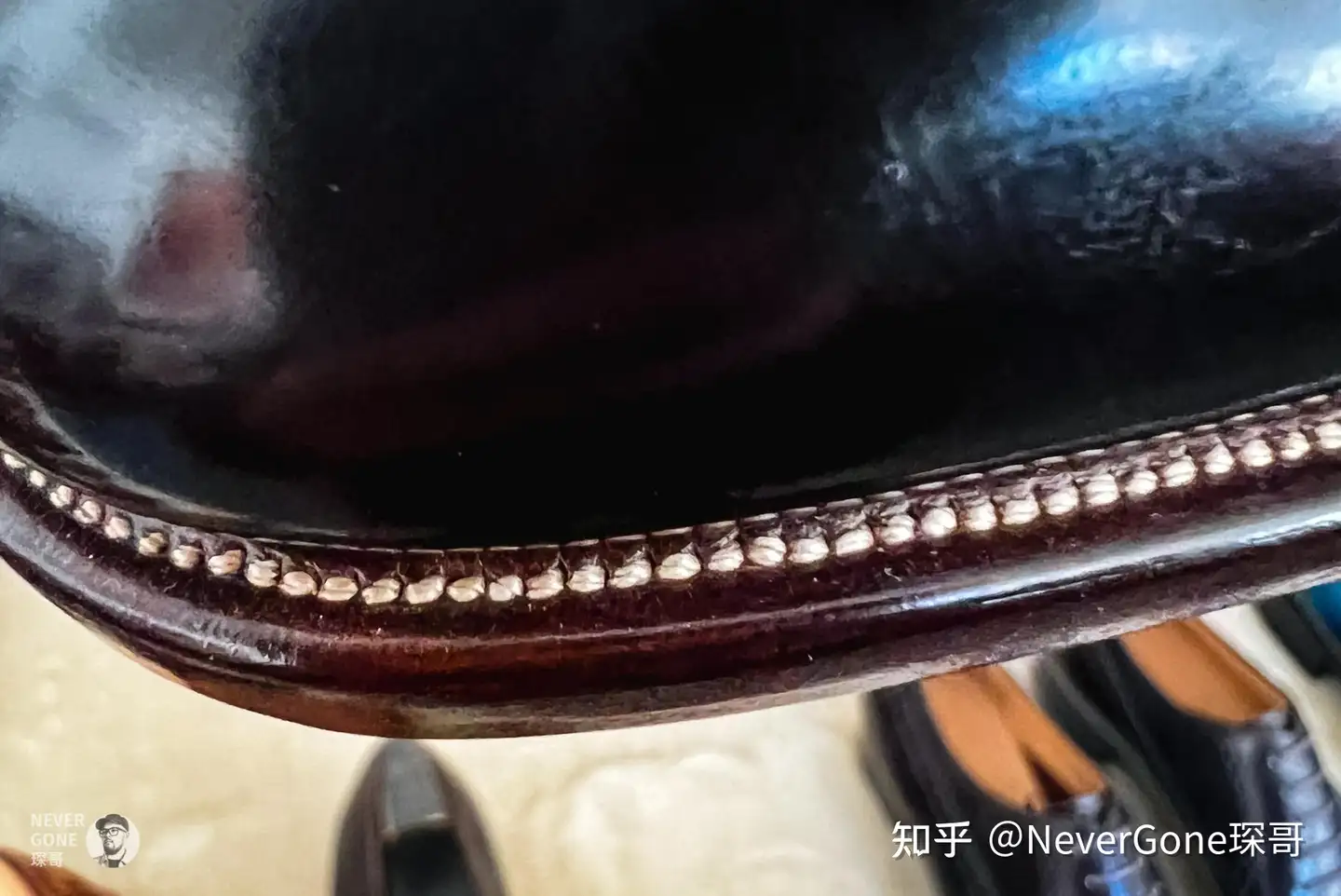具体来说,这种做法是帮面的内线和沿条的内线在同一个槽上,也就是先把鞋面和内底缝上,然后紧贴的这条线再缝手工沿条,同样的位置二次缝线的难度非常高,稍不留神就会扎断另一条内线,所以这双工艺比普通挪威缝更繁琐