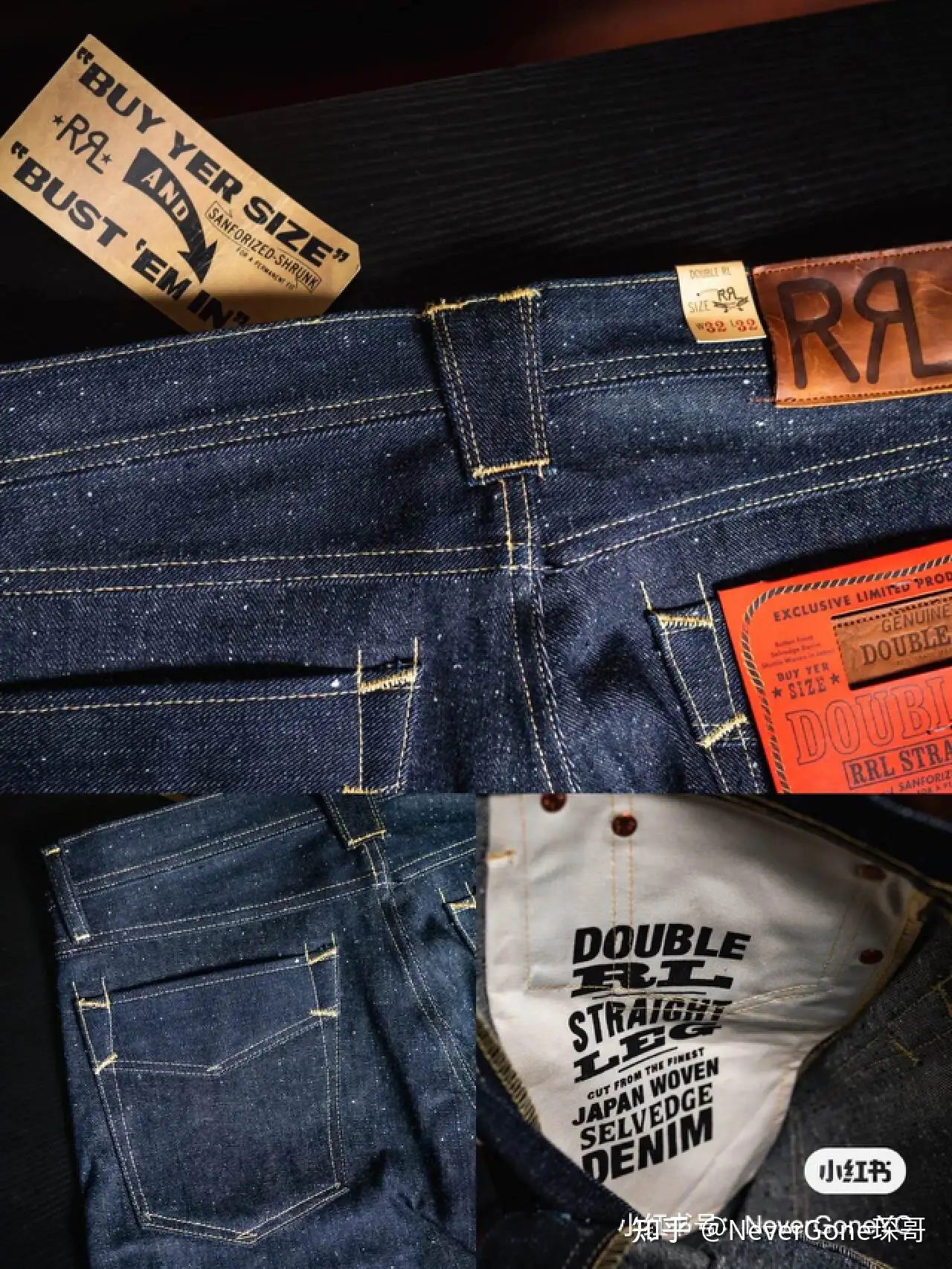 这条裤子,裤型是中腰直筒,灵感来自 1950 年代的工作裤,五口袋西部风。袋花非常普通,约等于没有。正面最引人瞩目的就是口袋下方的西部风装饰了。纽约设计,限量生产。口袋布反面有一些说明,表明日产棉结牛仔布,字体风格跟其他RRL原牛一致