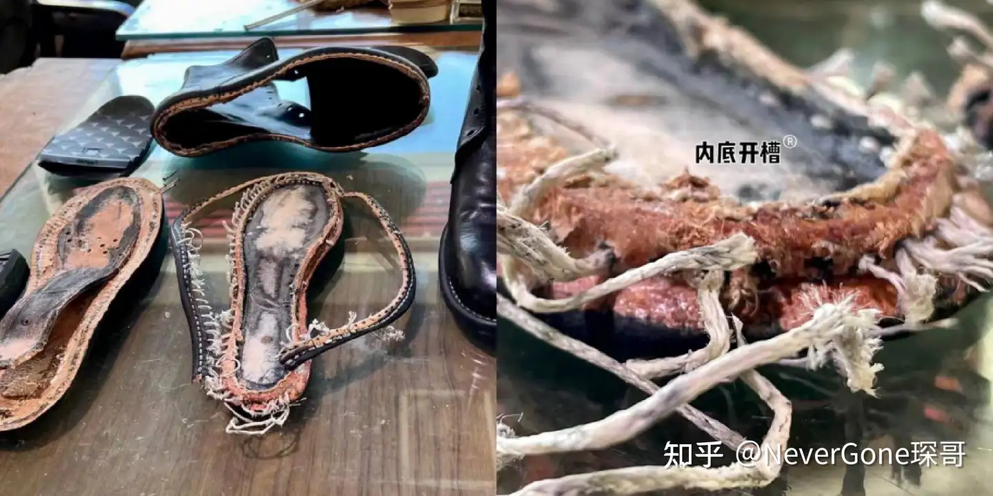 之前有大佬@伽利略Hodor拆过Guidi,鞋子的大部分部件都尽可能的使用了真皮,比如港宝和填充物。再就是内底进行了起墙开槽,没有像固特异那样贴布条,所以正常穿着的话Guidi的耐用度不用担心。但是这个皮真的比较薄,意外的大力我觉得是有可能搞破的