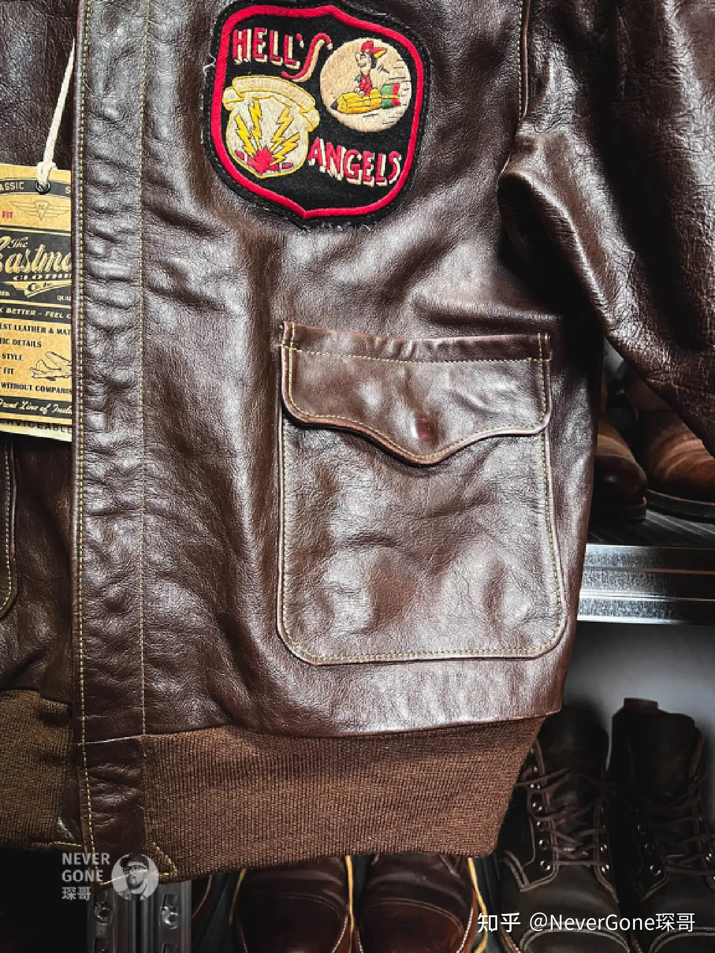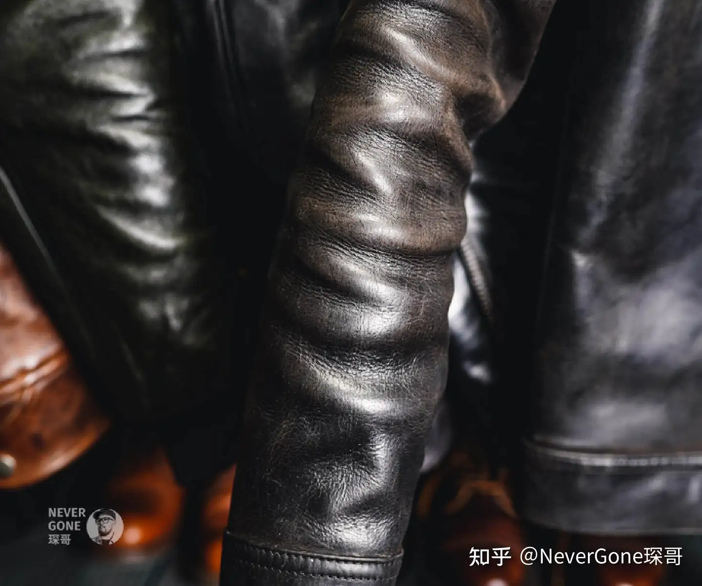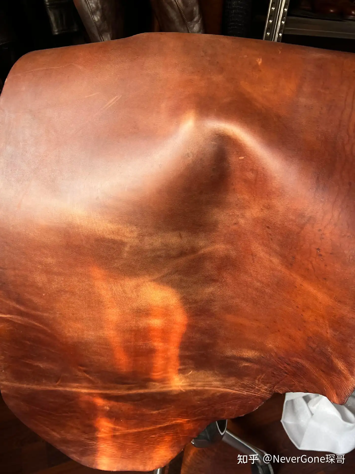 Eastman包括地狱天使在内的背画款,一般都是用的植鞣Vintage Warhorse战马皮,而擦色大逃亡使用的是不带Vintage前缀的战马皮。简单来说区别就是背画款的选皮更加放飞自我,啥部位都给用,所以经常碰上大腩/大松面/大纹路/粗大褶