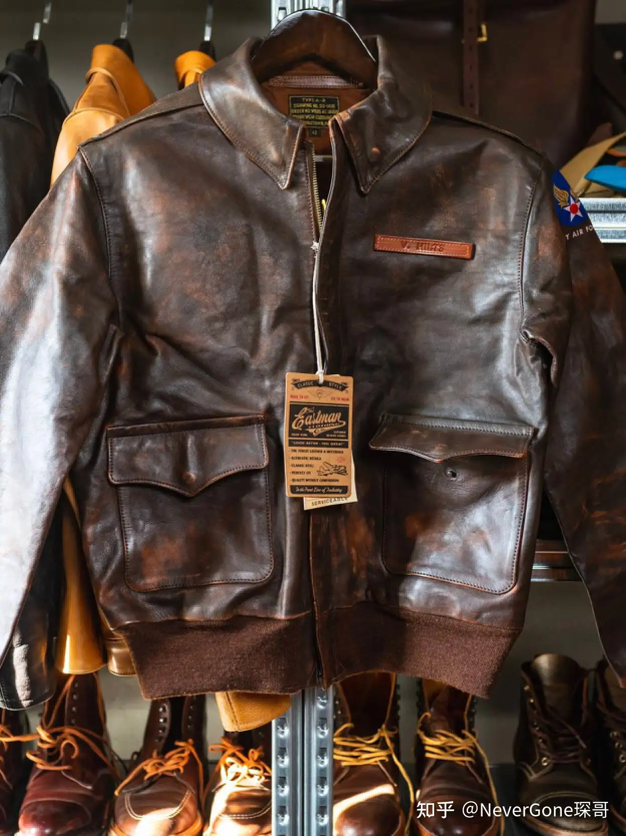 对此,Eastman官方的解释很直白:这款皮革的特点和手感让人欲罢不能,因为它表现出了复古原件上经常出现的粗糙特征。它本质上是衣服中的艺术,人们可以穿,也可以挂起来展示,是对那些令人难以置信的勇敢的飞行员的致敬和记忆的维护,他们无数次把自己的生命置于危险之中,使我们今天都有更好的生活