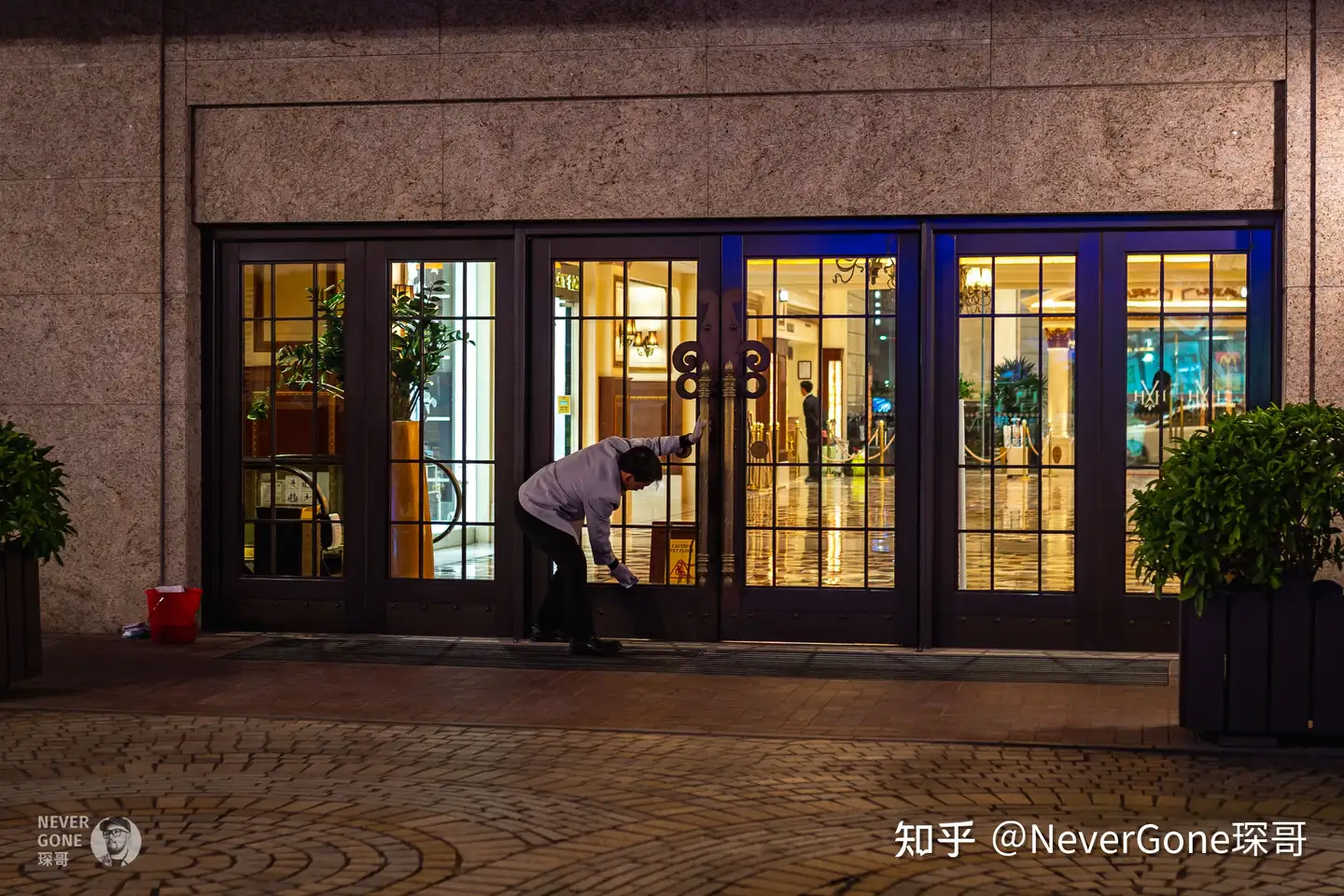 澳门很多建筑的幕墙、玻璃门也都很干净,背后是辛勤的工作人员