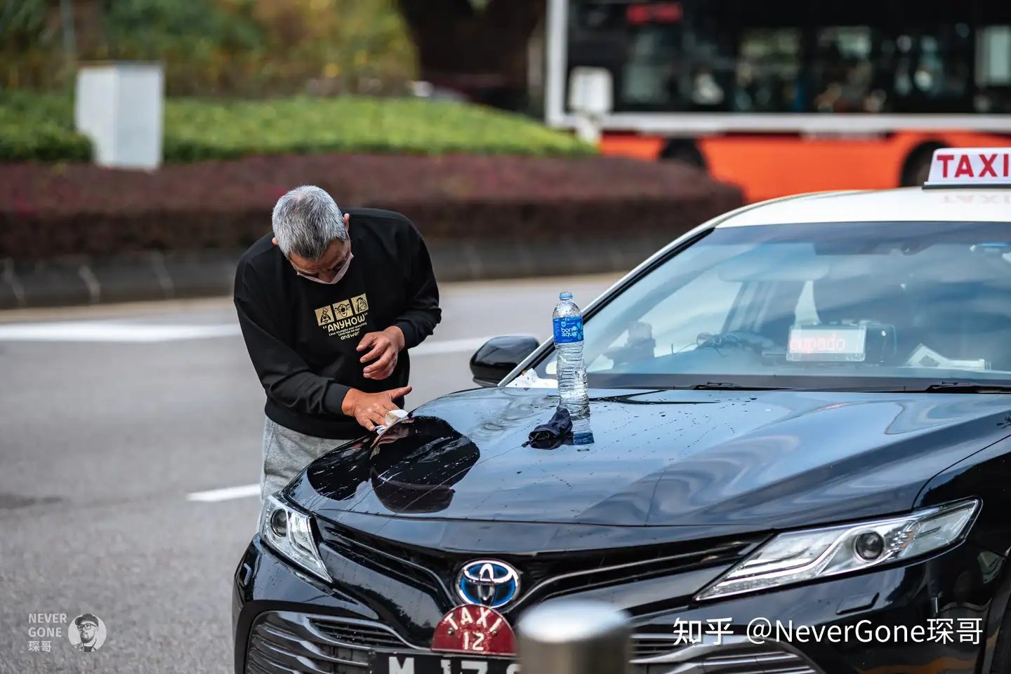 后面正好拍到一张的哥擦车的照片,确实很仔细,佩服