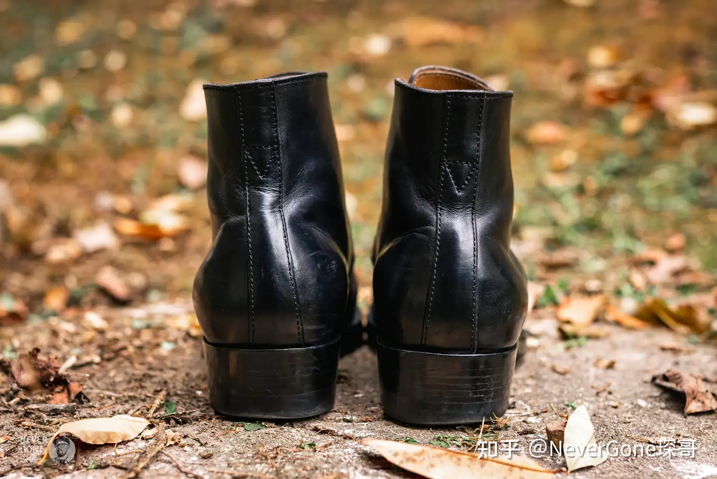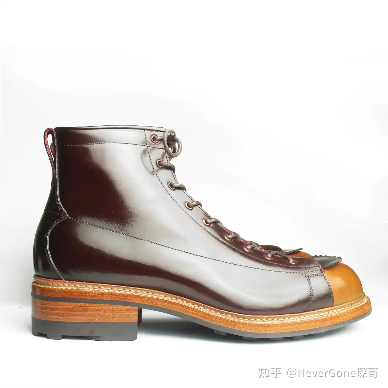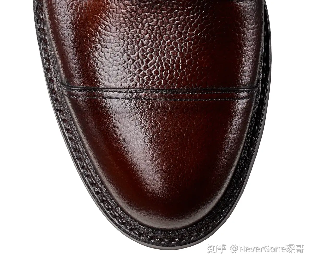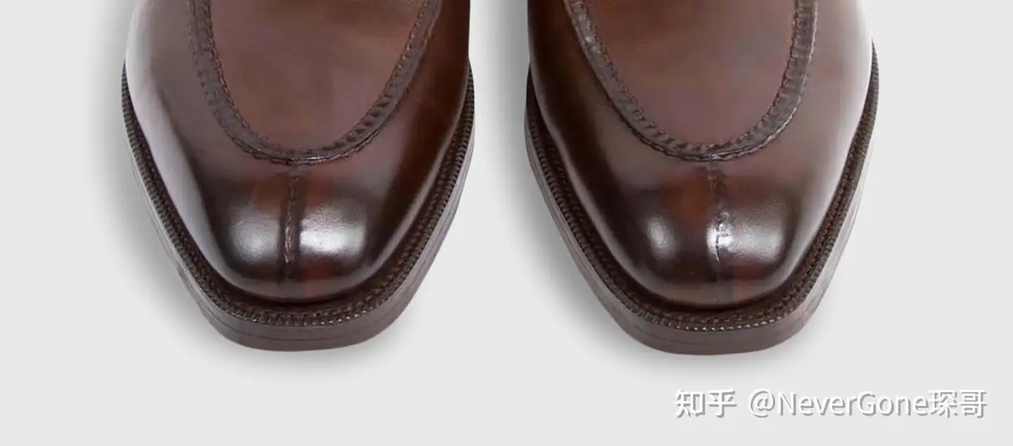 盖头。一块附在鞋头最前面的圆弧形皮革,像是给鞋头戴了帽子。最初是用在纯工装鞋上,提供额外的保护和耐久度,鞋头磨坏了直接换个Toe Cap就行,不用再买新鞋了。但后来成为了一种装饰,很多正装鞋靴也用。真正的Cap鞋头是双层面皮,会显得鞋头很厚,放在工装上没问题但是正装风格就不和谐了。所以现在的正装鞋以及Alden Viberg这类中间地带的鞋子并没有用双层皮,而是在Toe Cap这里拼接一下,英文叫Faux Cap,也就是假盖头。