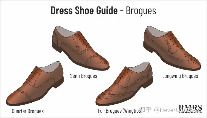 布洛克雕花有许多种类型,比如Full Brogue, Half/Semi Brogue, Longwing Brogue, Quarter Brogue