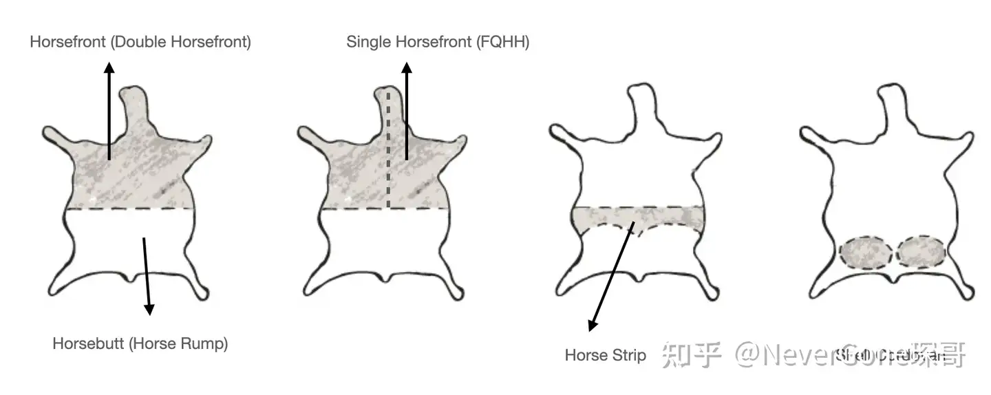 马臀皮,音译为科尔多瓦。区别于Horsebutt(虽说机翻都是马屁股),真正的马臀是马科动物屁股皮面下方的那层致密的纤维结缔组织,一般从肉面切削,把这层组织暴露出来,再经过压平、染色、抛光后处理等方式,最终成为各位熟悉的马臀皮。马臀皮纤维是纵向排列的,会形成大波浪折痕,但是不会产生那种很细的褶皱。生产周期长,成本高,很耐磨耐用,但是抗撕裂能力不强,做成鞋子的话,有些穿久了会在主要受力部位的针孔附近裂开。