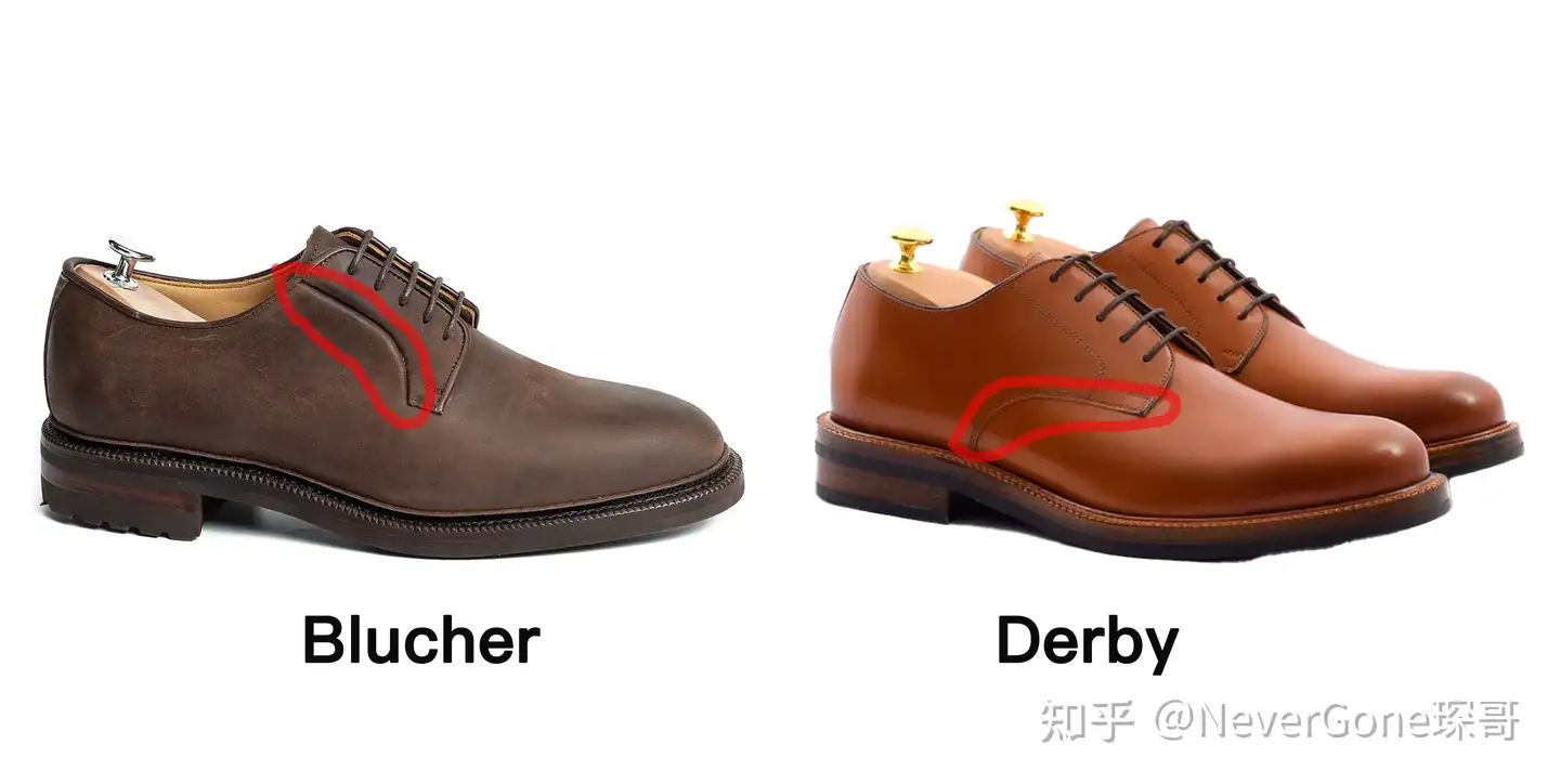 两者的区别在于,Derby的鞋耳与鞋面是连着的,面积更大,并且一直延伸到鞋底。而Blucher的鞋耳面积较小,没有延伸到鞋底。弄明白这些东西的最好方法就是多看图片,我已经圈出区别之处了。一般来说Blucher鞋面缝线更少看起来更简洁,因此通常被认为是更正式的鞋子。
