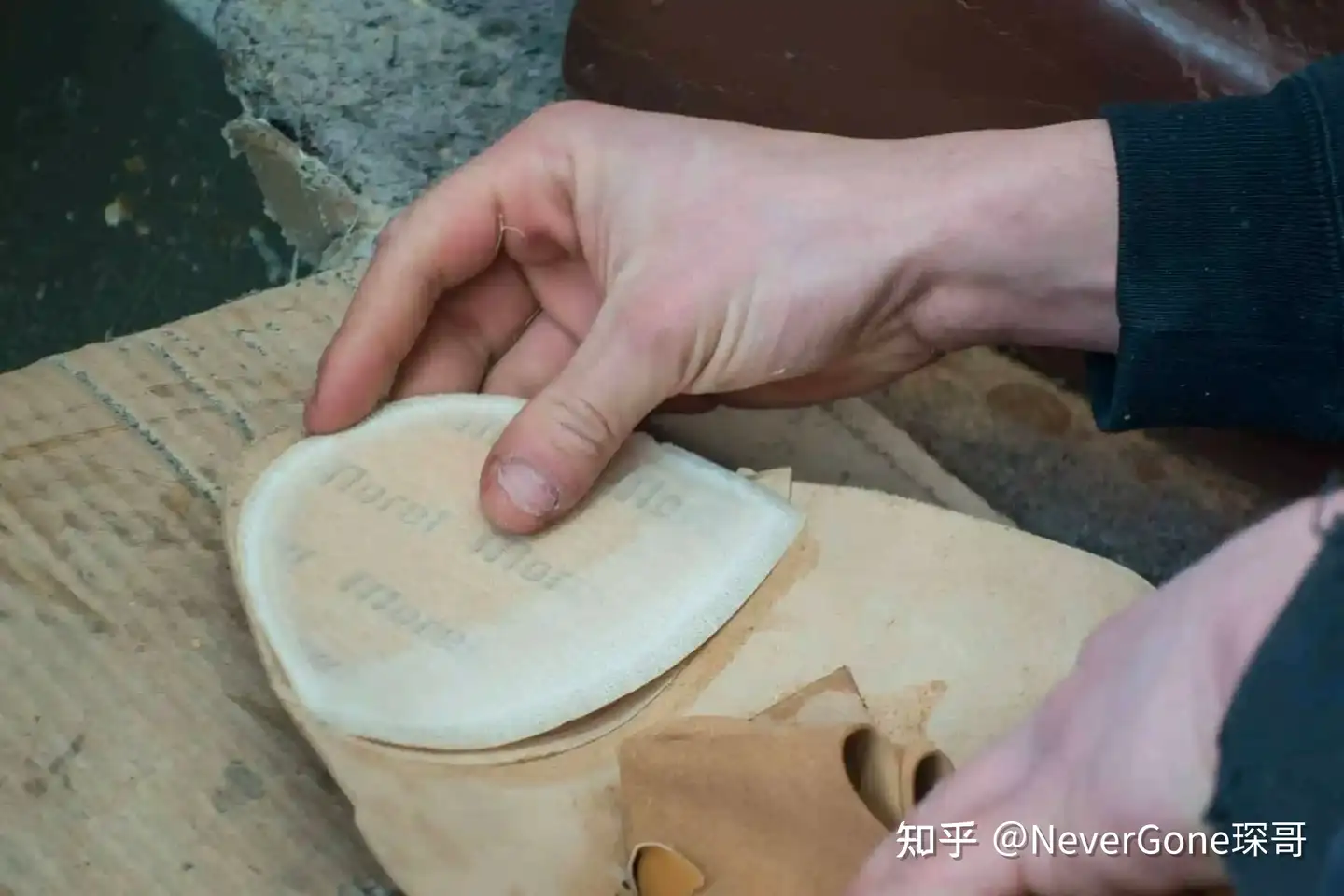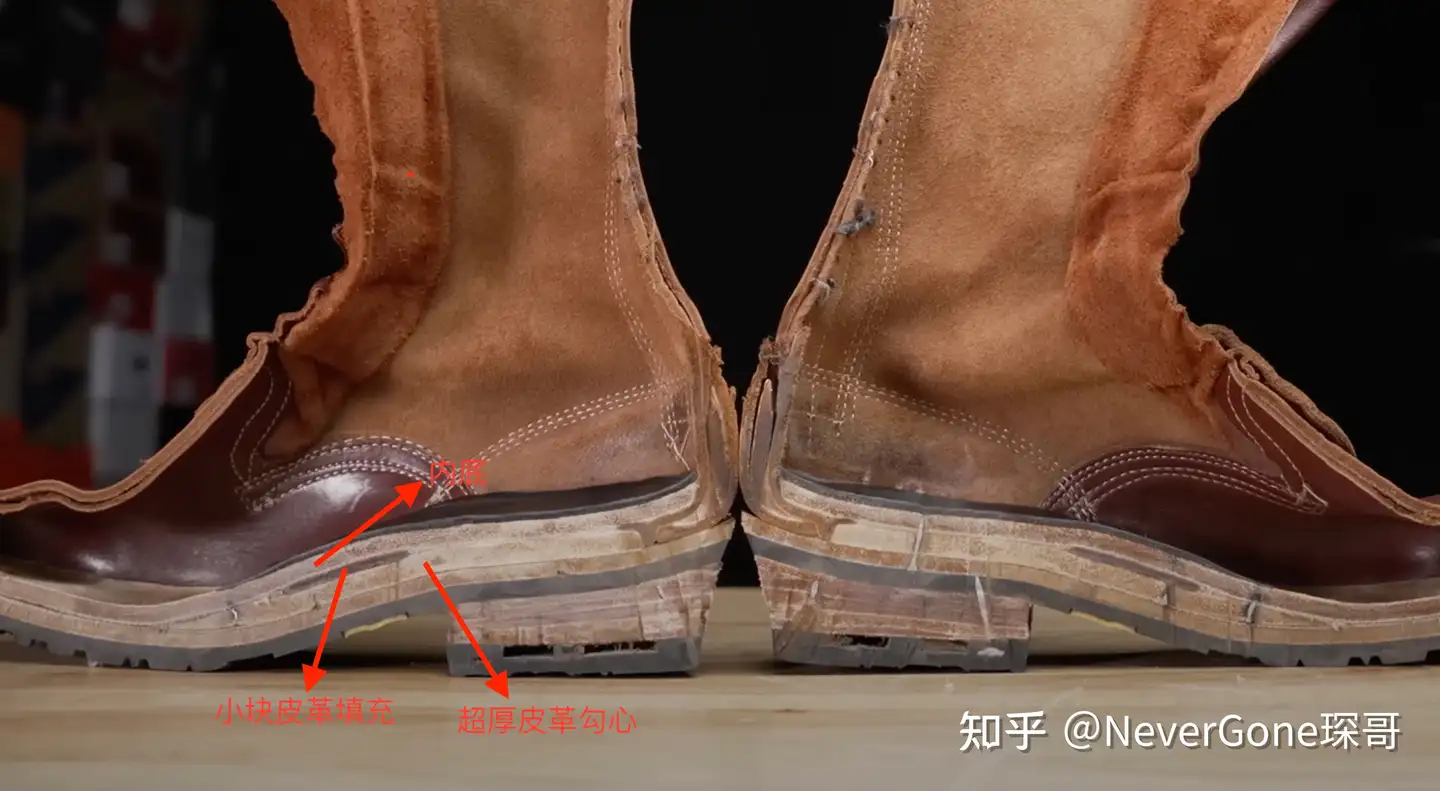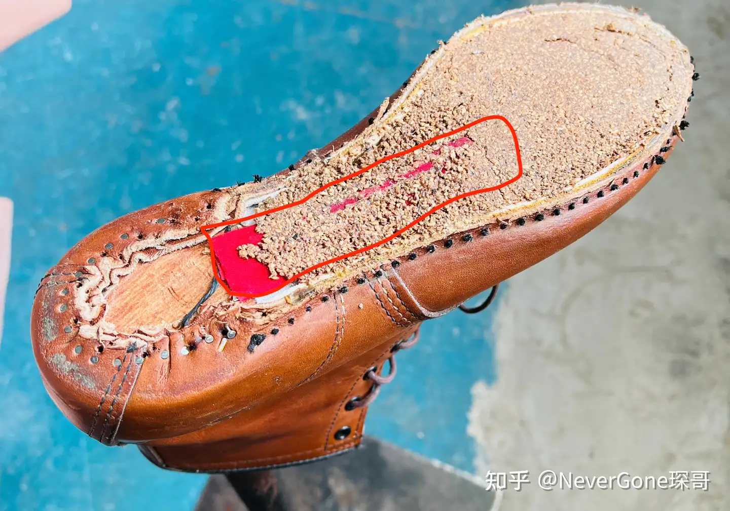足弓支撑,通过处理鞋子的内底,让内底中央区域隆起突出,由此来给足弓提供支撑。当然,内底下方也需要填充更有力的支撑物才行,比如White’s Boots填充的皮革,图片来自Rose Anvil