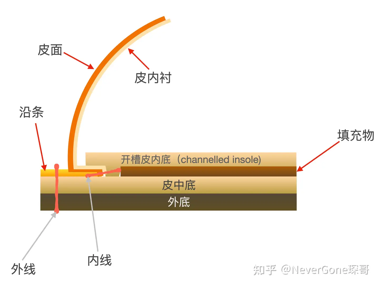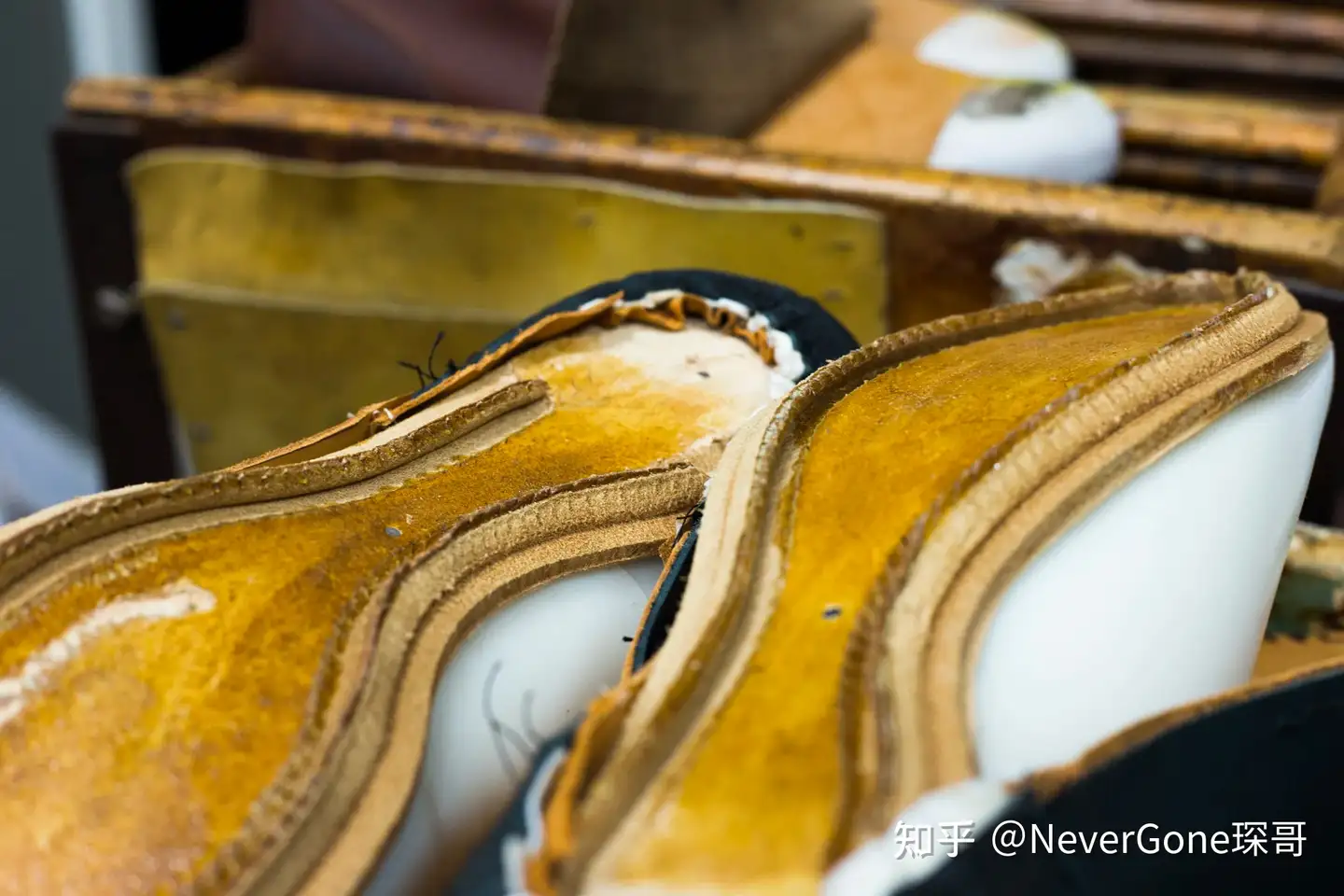 工艺结构。一般指鞋子的底部结构。缝制鞋上常见的结构有固特异、挪威缝、手缝沿条等等,这些工艺本文都会做具体的名词解释。就目前的市场现状来看,缝制鞋里面大部分是固特异。需要记住的是,工艺结构是为整体效果服务的,不要本末倒置了。