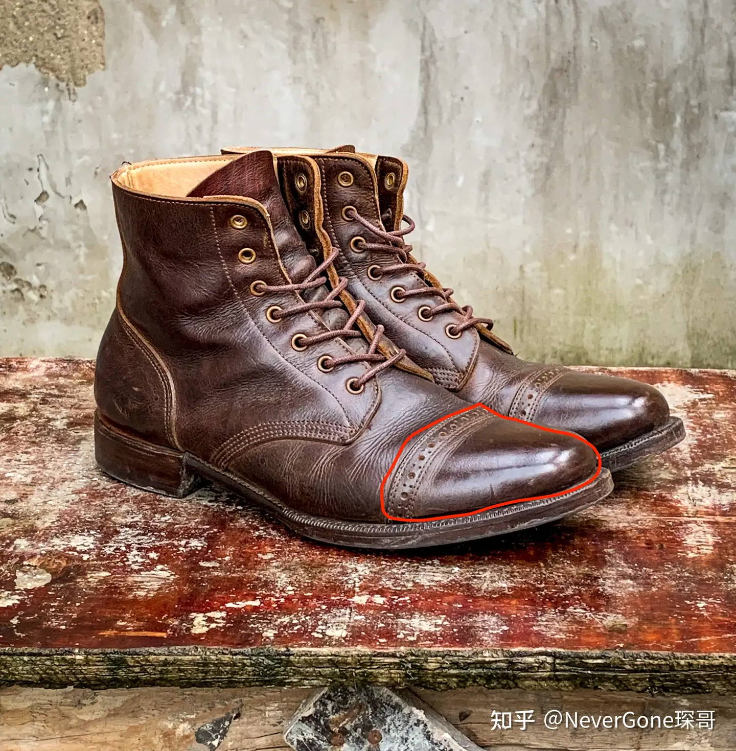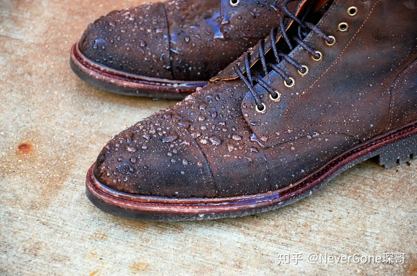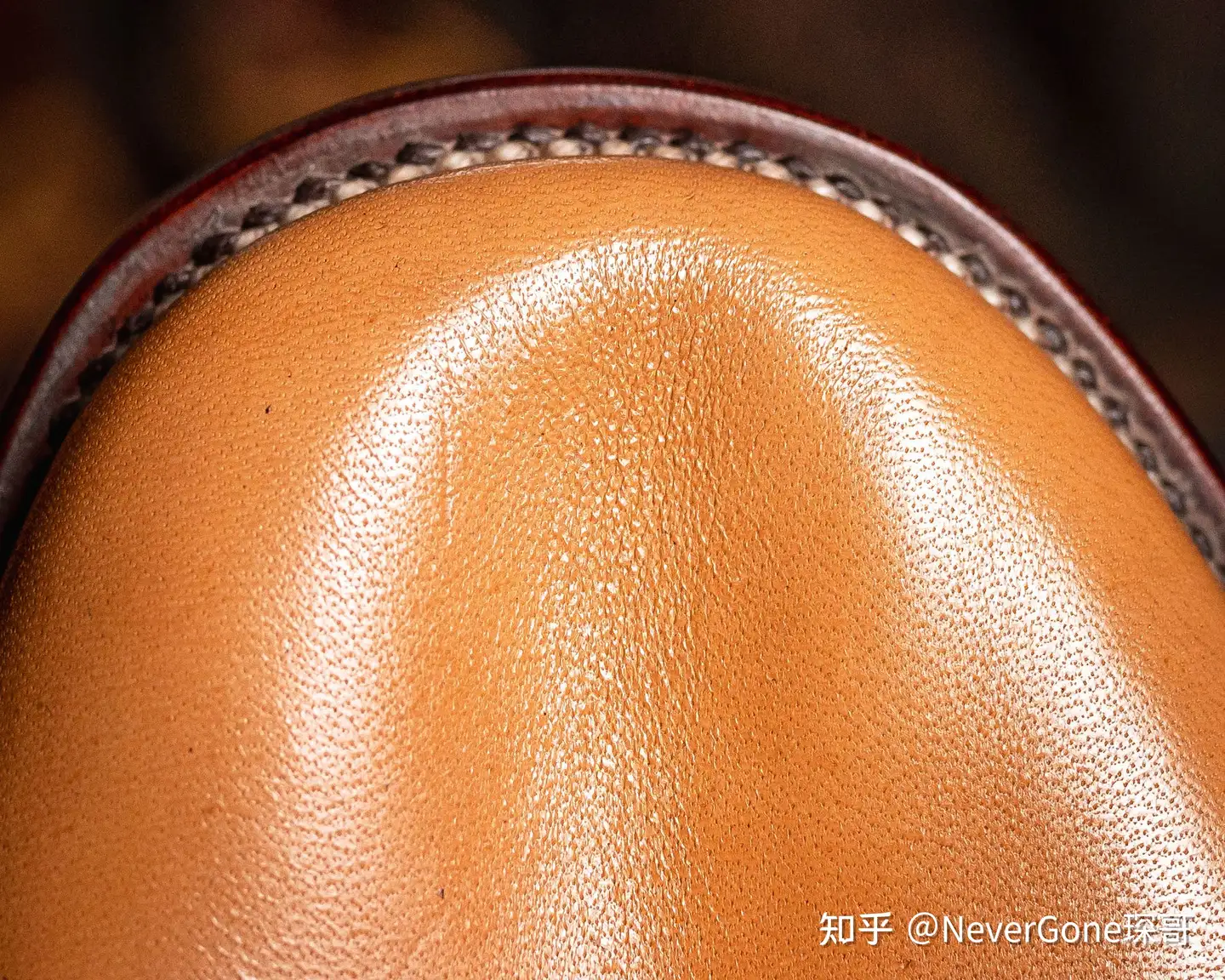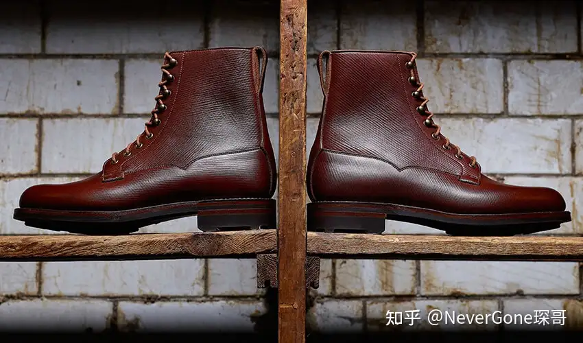 第二种是把粒面打磨掉一些再打蜡,比如Cfstead的Rambler和Waxy Commander,是保留了75%粒面部分。也有一些Nubuck等皮革会磨掉更多粒面