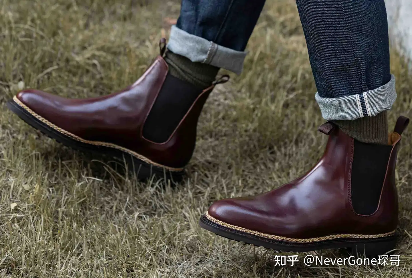 切尔西靴。一种非系带靴,使用两侧的弹力松紧带来固定脚。几乎所有的切尔西都有提环(有的在前有的在后)。一般来说,鞋面拼接越少的越难做,看起来越高档,所以可以看到一片式的切尔西一般卖得更贵。而马丁那种切尔西看起来就不怎么高级,但是卖得也不便宜。