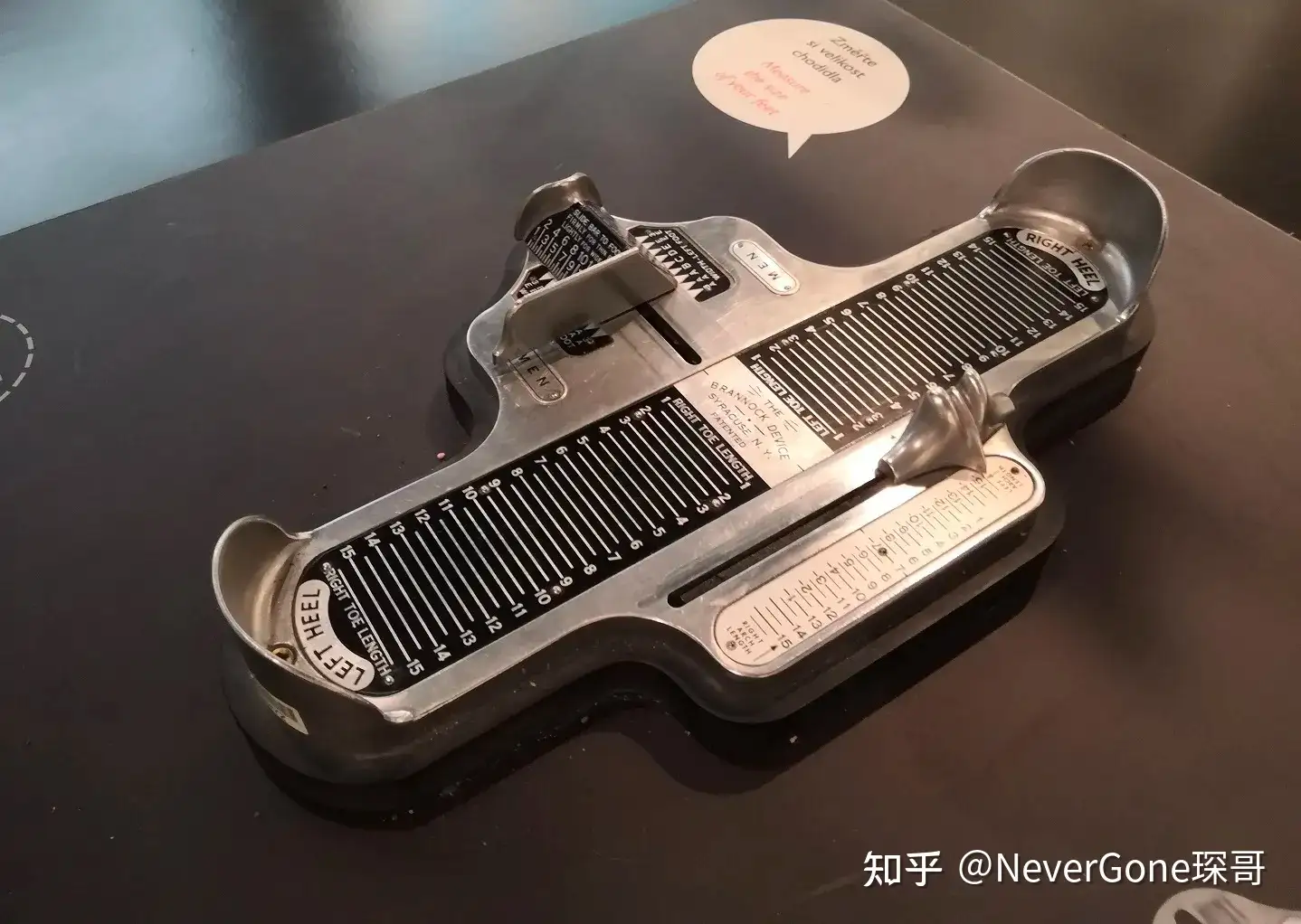 量脚器。美国人发明的机器,站上去可以测量脚长脚宽足弓长度等数据,很多传统缝制鞋品牌都会根据测量数据给到尺码建议。当然,也可以看我之前发布的尺码指南视频,那个更详细,基本可以解决一切尺码问题了。