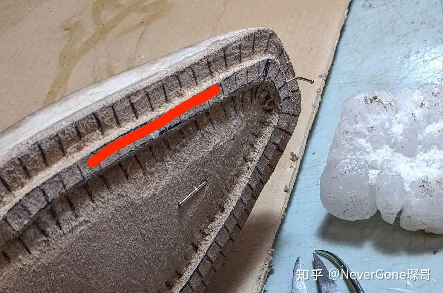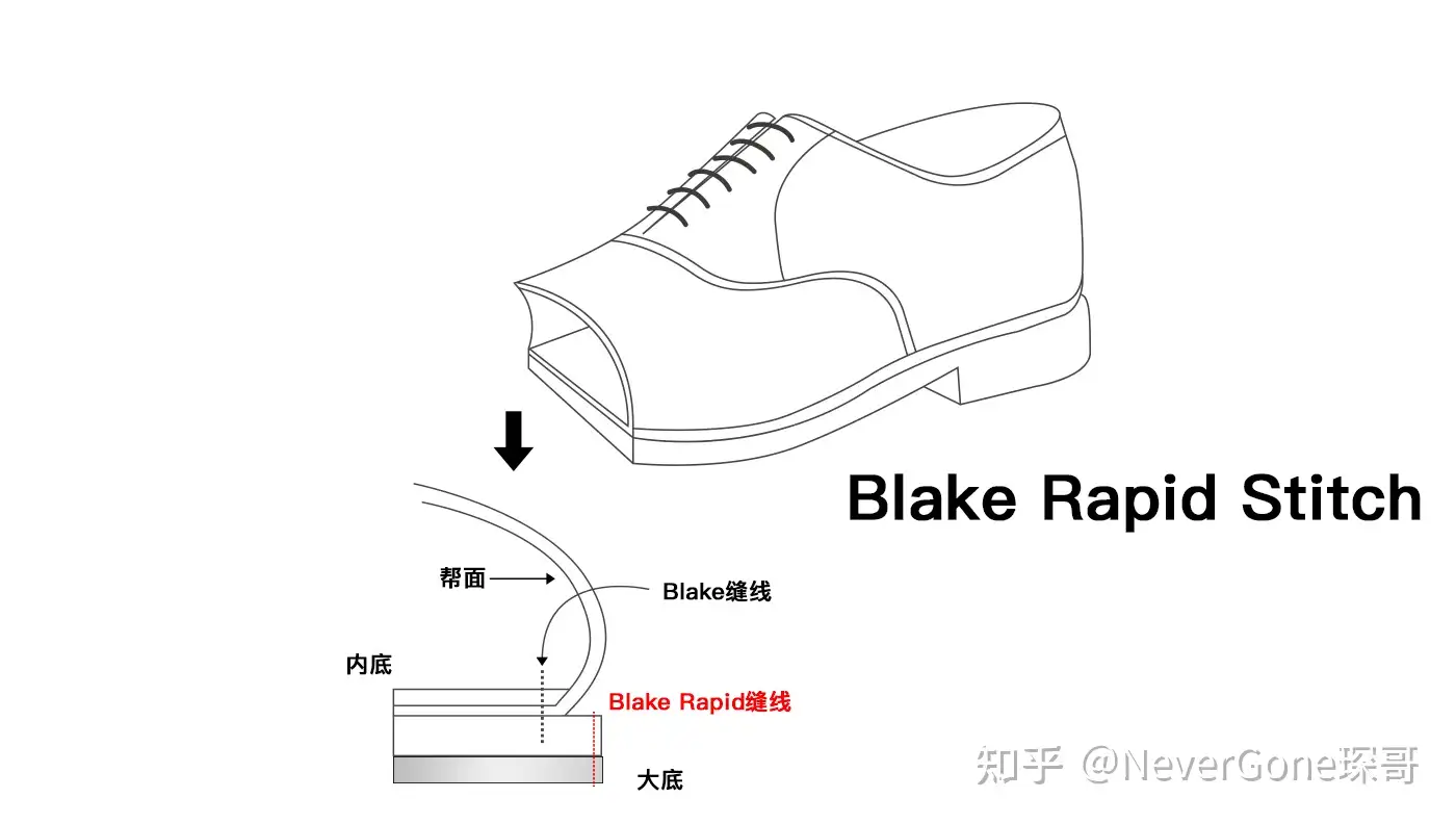 Blake Rapid外线工艺,与上一条的Blake Stitch Construction类似,但是加了一层底,并且用Rapid缝线与外底缝在一起(相比上面的Blake Stitch多了一道外圈缝线),所以国外文章中常见的Rapid Stitch其实就是外线的意思,缝这道线的机器就是外线机。这个工艺使得鞋子更容易换底,但会增加额外的厚度,外观看起来也更像固特异。实际上,只看图的话,Blake Rapid可以做到外观跟固特异沿条一模一样。