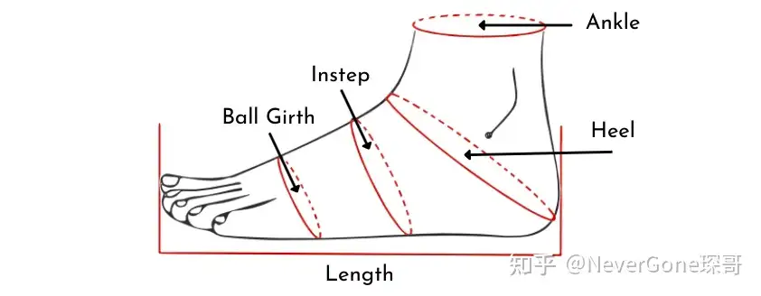 这里用White’s Boots小白贴吧置顶表格来举例,这里的数字都是绕脚特定位置一圈的围度,而不是平面的宽度。