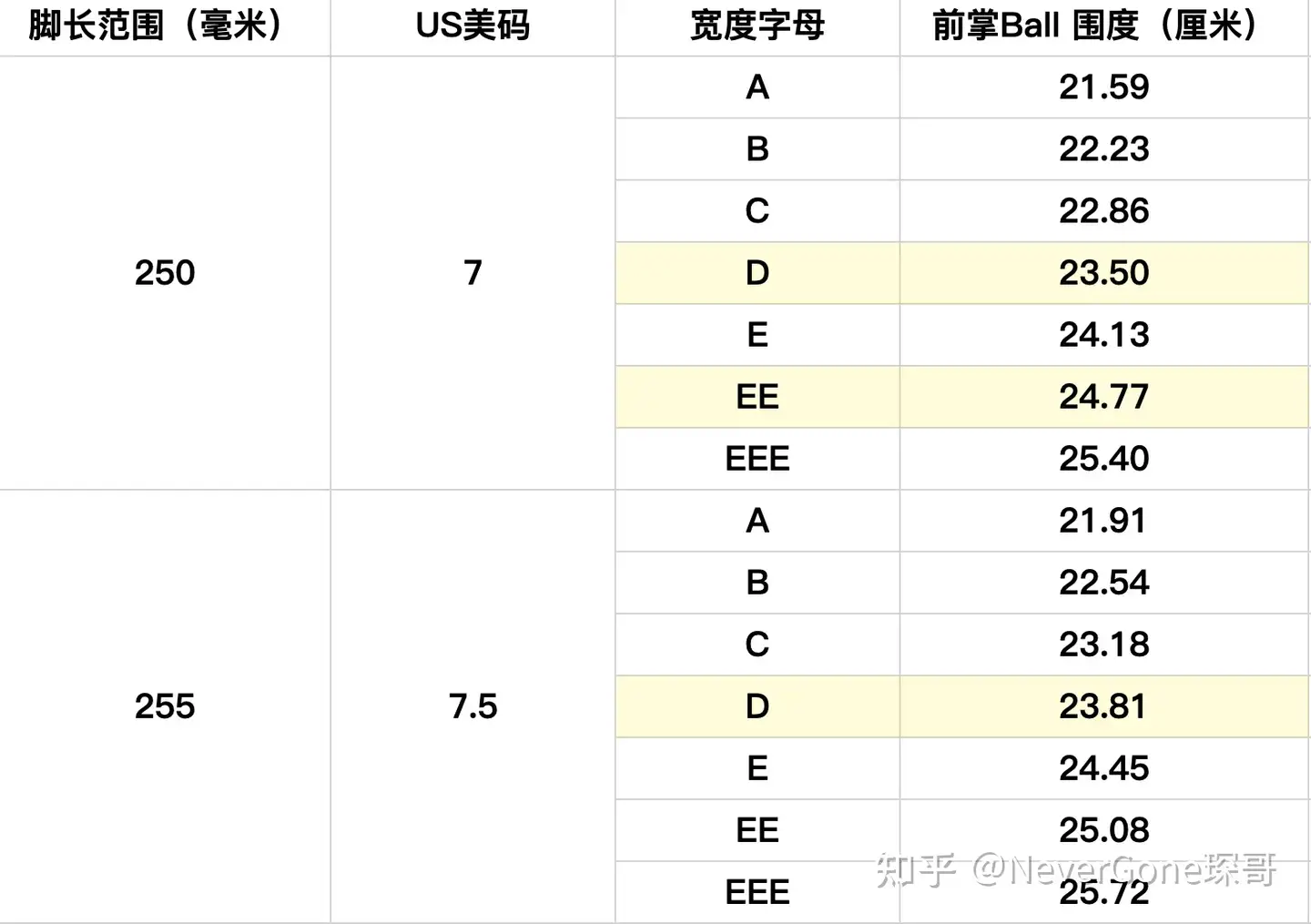 宽度。在美码尺码体系中,一般用AAA, AA, A, B, C, D, E, EEE, EEEE 来表示,而英码体系一般是用CDEFG。对于英美码体系来说,字母越靠后则围度越大。长度相同时,每个字母之间(比如D和E,E和F)或者每多一个字母(比如E和EE,EE和EEE),围度相差为6.35mm。所以F=EE,FF其实是F的围度+6.35mm,相当于EEE,然后FFF=FF+6.35mm,以此类推