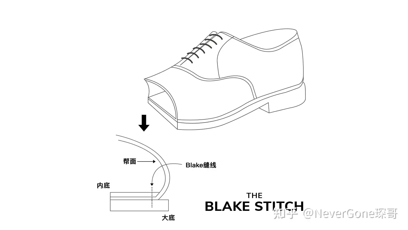 布雷克缝线工艺。这是一种直接将鞋面与外底缝合的技术,需要使用特定的机器。Blake工艺做出的鞋子比固特异更轻便,鞋边也可以更窄,当然强度也会低一点。它以发明者Lyman Reed Blake的名字命名,他后来将专利出售给了Gordon McKay,所以Blake Stitch有时被称为McKay Stitch。Blake的鞋子可以换底重建,但是很多鞋匠没有这种机器,所以只能手工重建