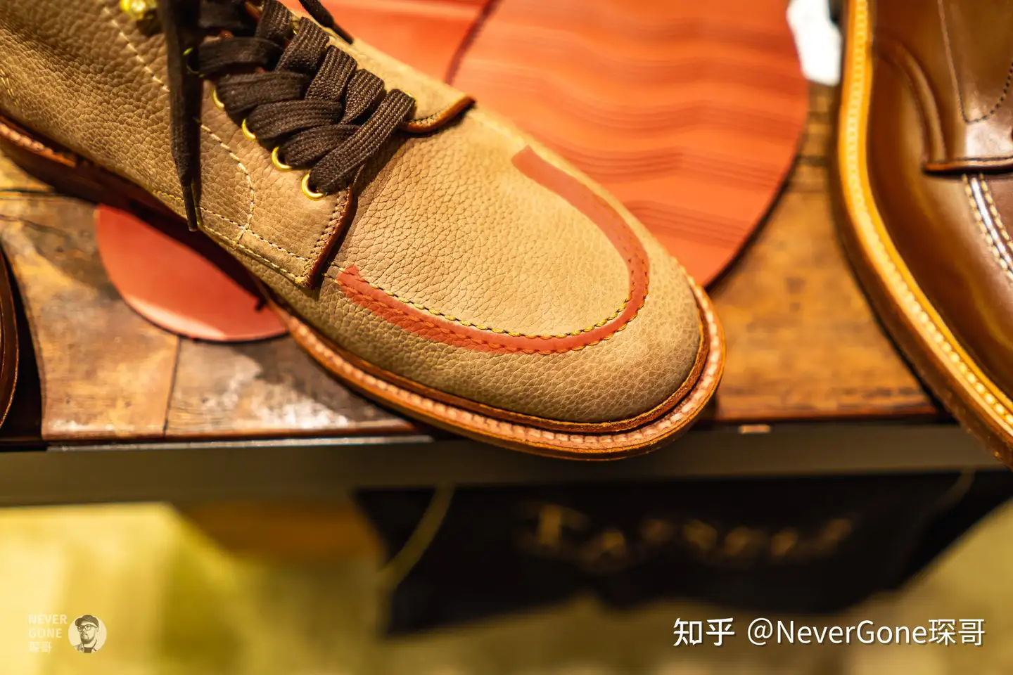 于是我进去直接问他有啥创新,是新的construction还是craftmanship,他告诉我目前的改变是Alden用了一台新机器来缝Apron鞋头,也就是我标出的这一圈线。好吧,跟我想的“创新”定义不太一样。。。