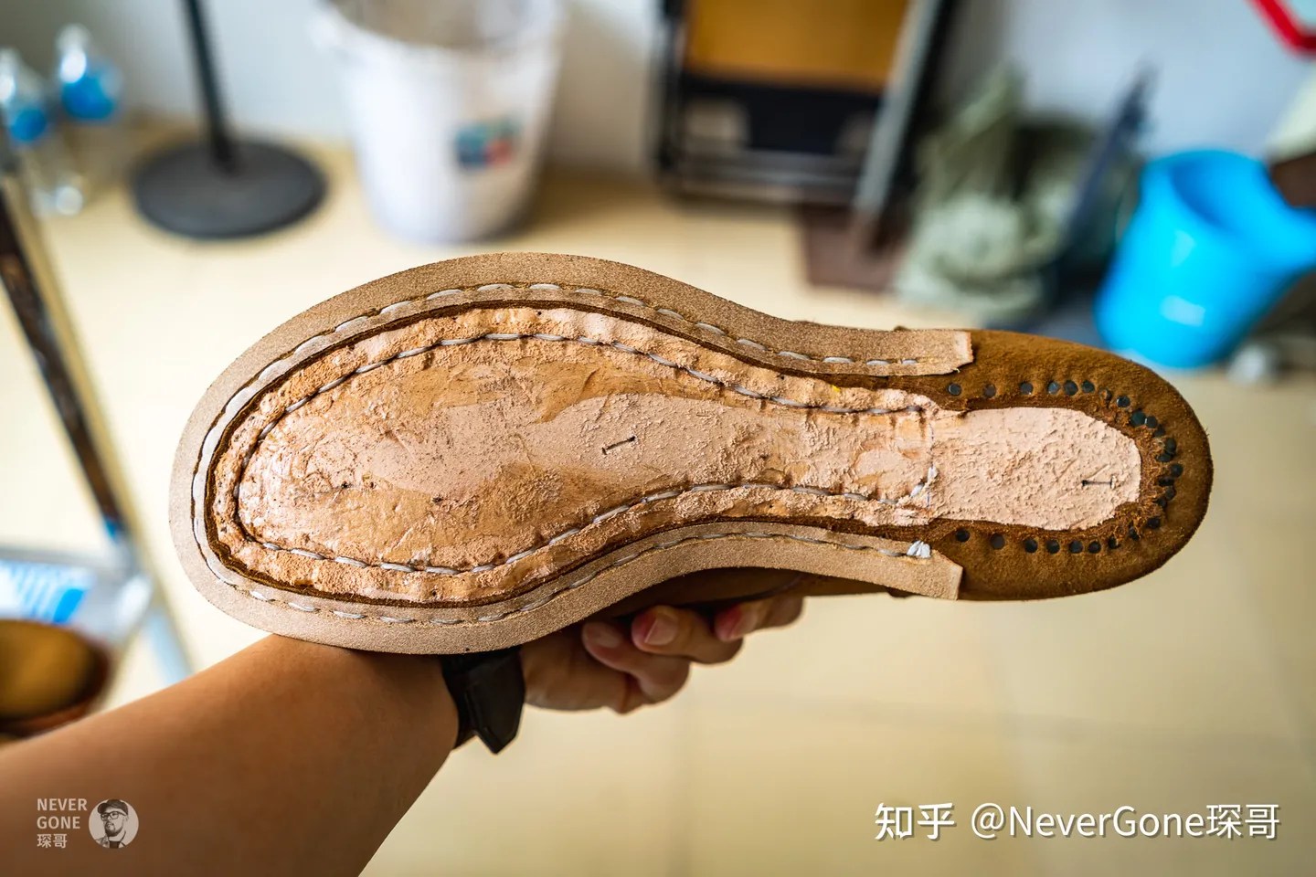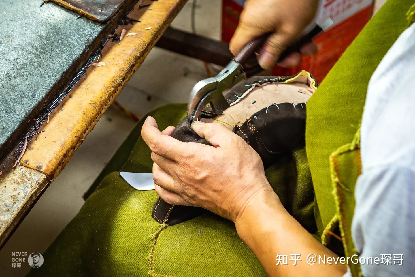 铁履手工程度非常高,手工绷楦,手缝沿条内线,做的挺规整的