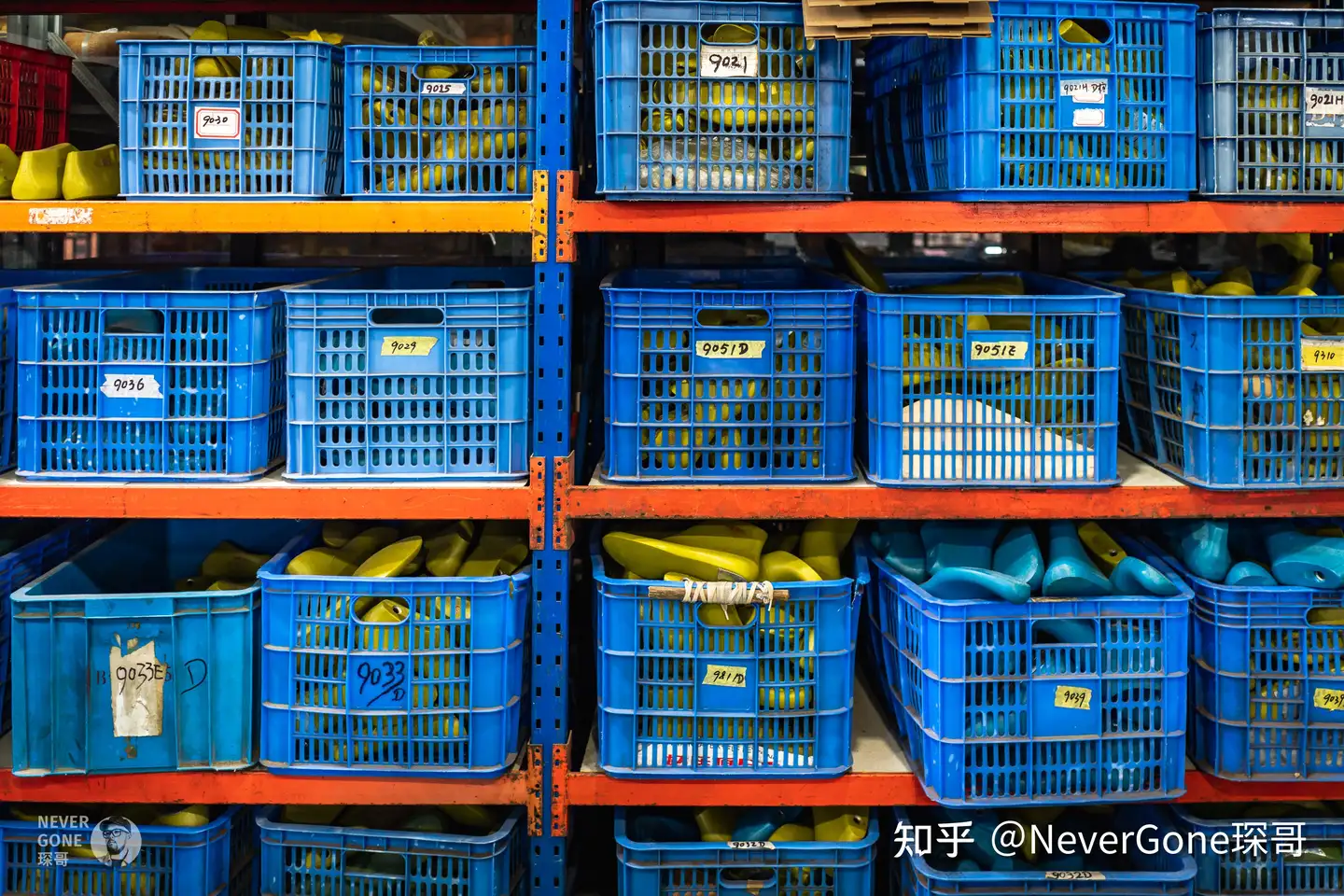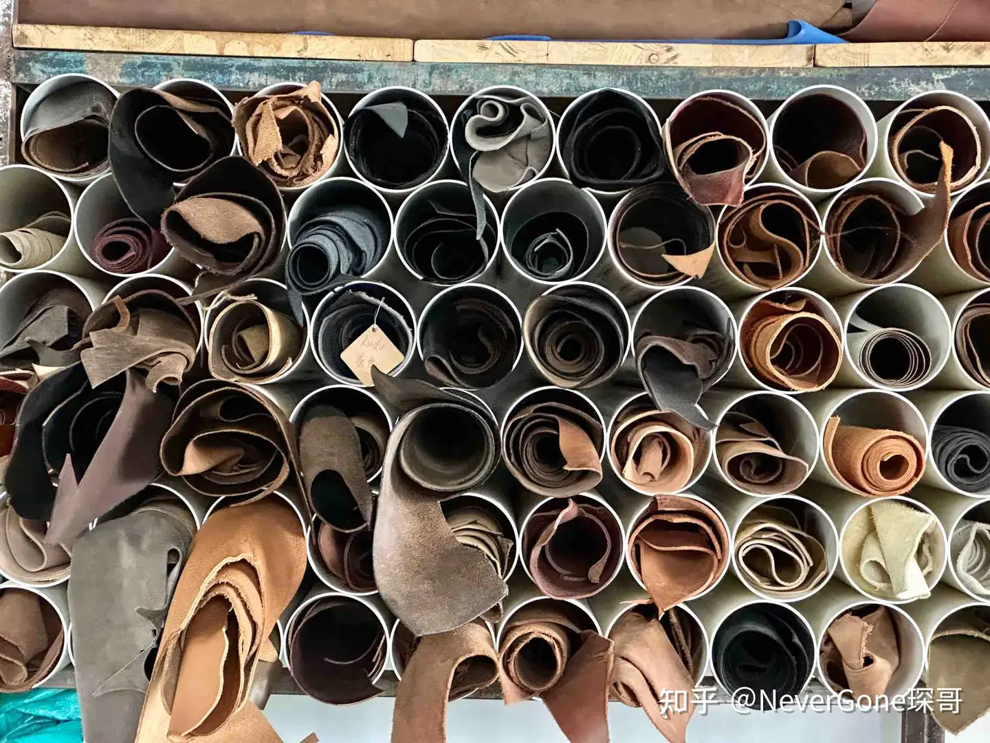 这边是放皮料的货架,这种圆筒状的分隔方便拿取