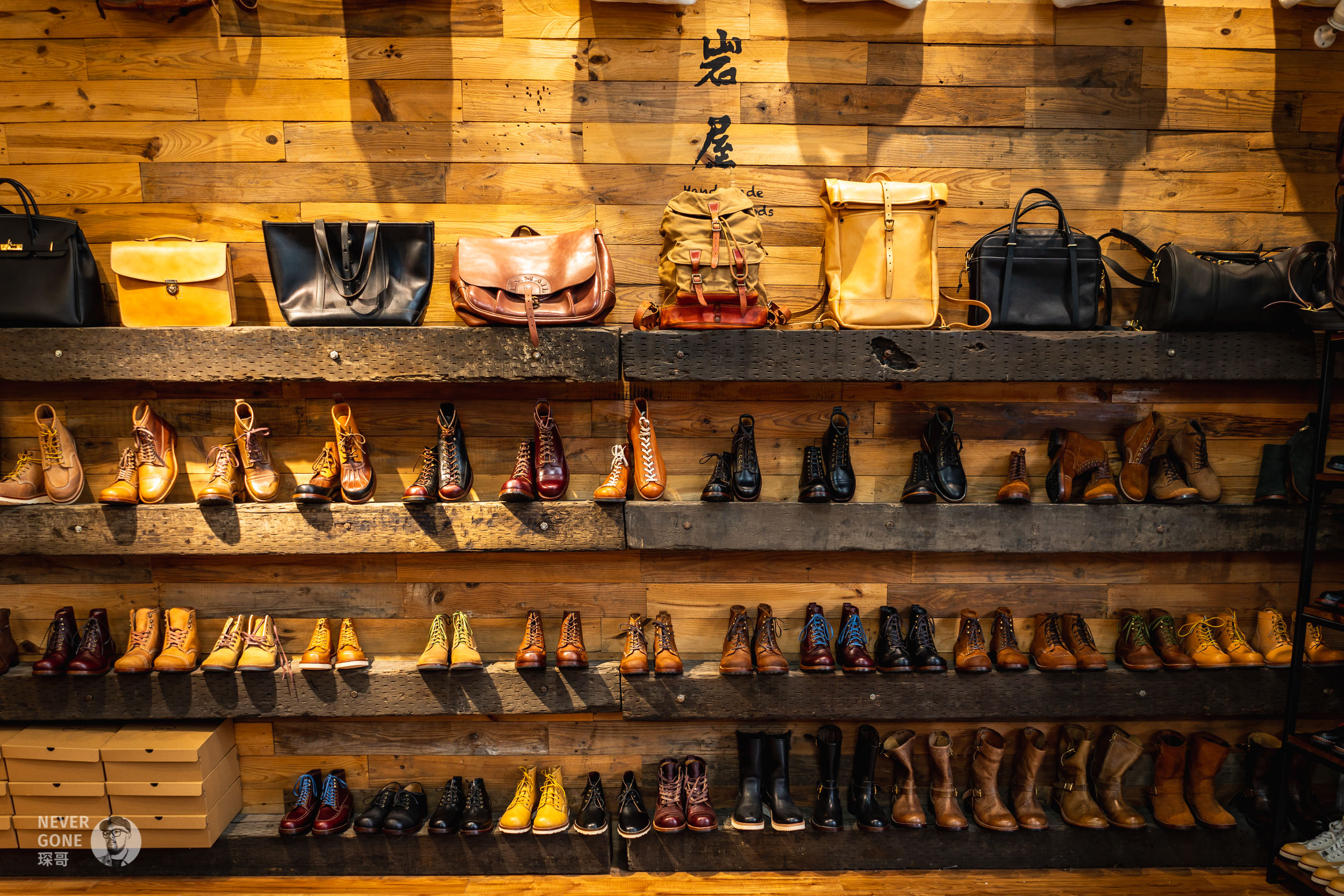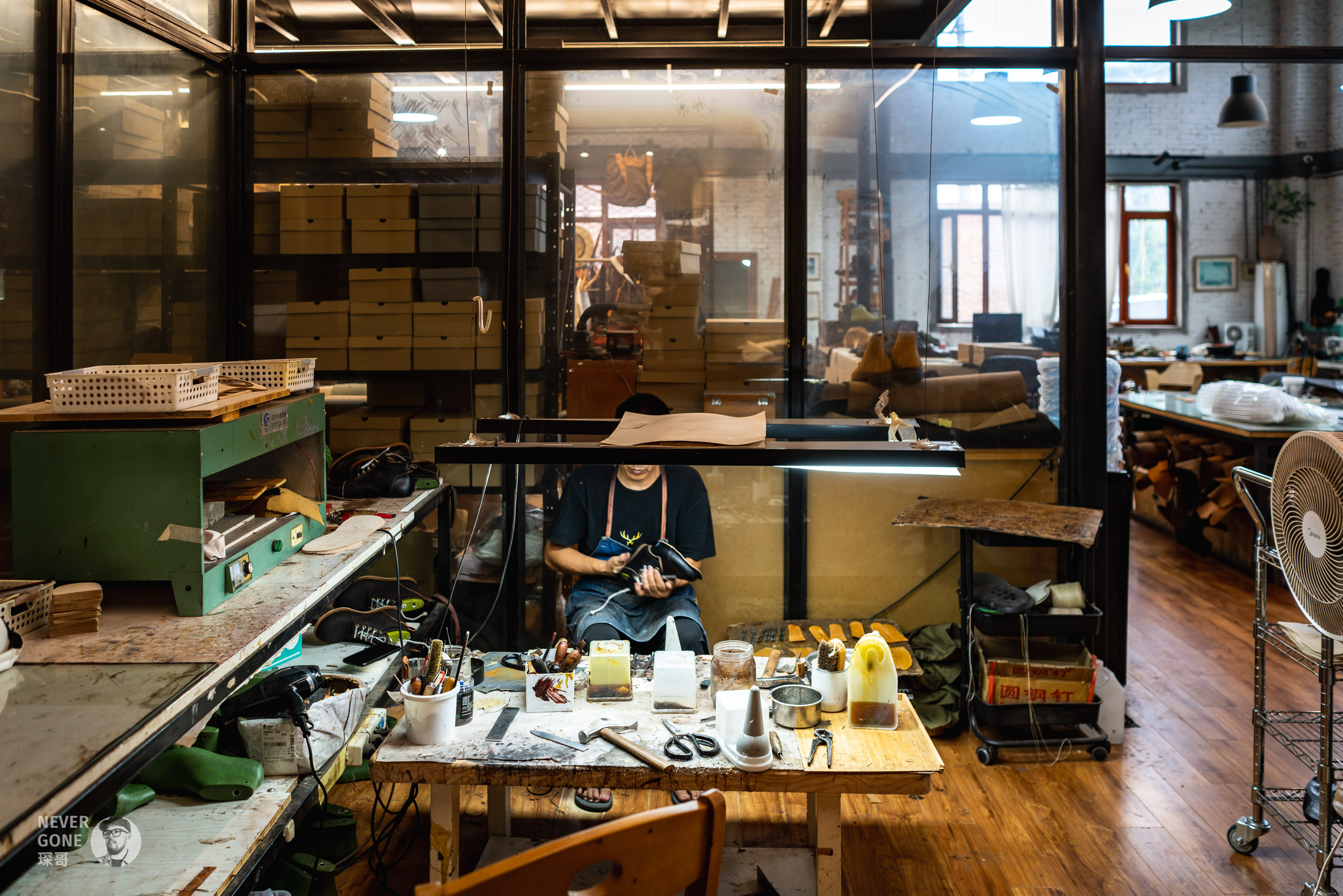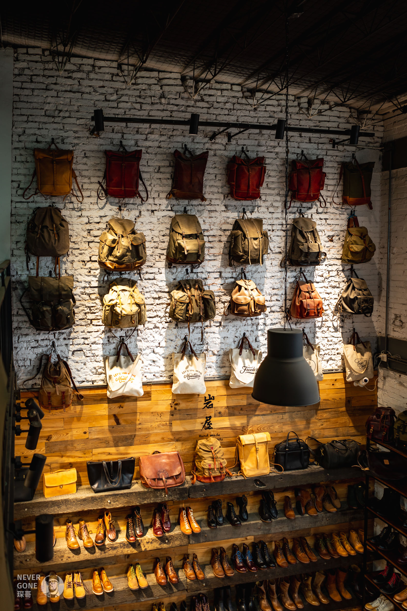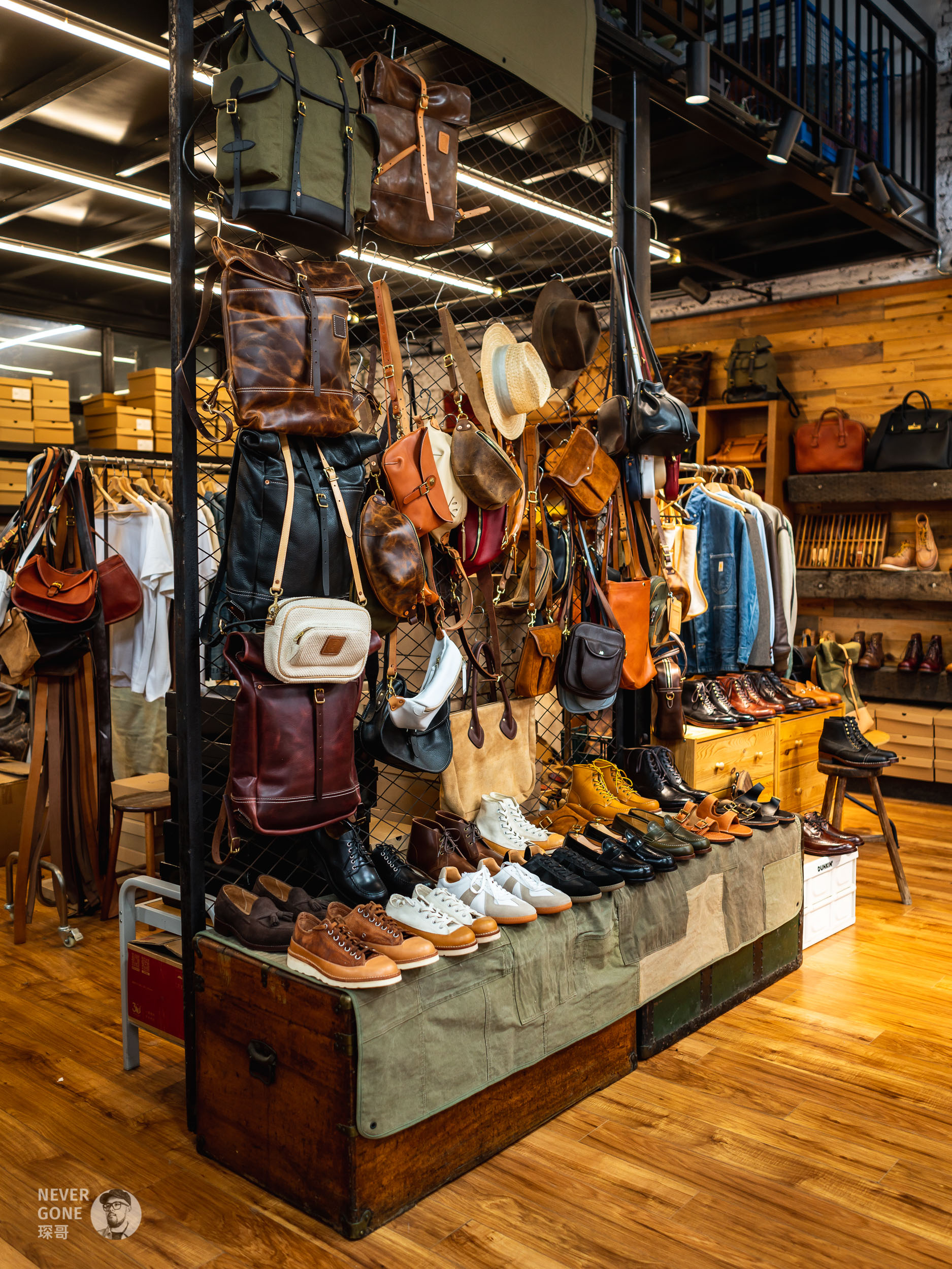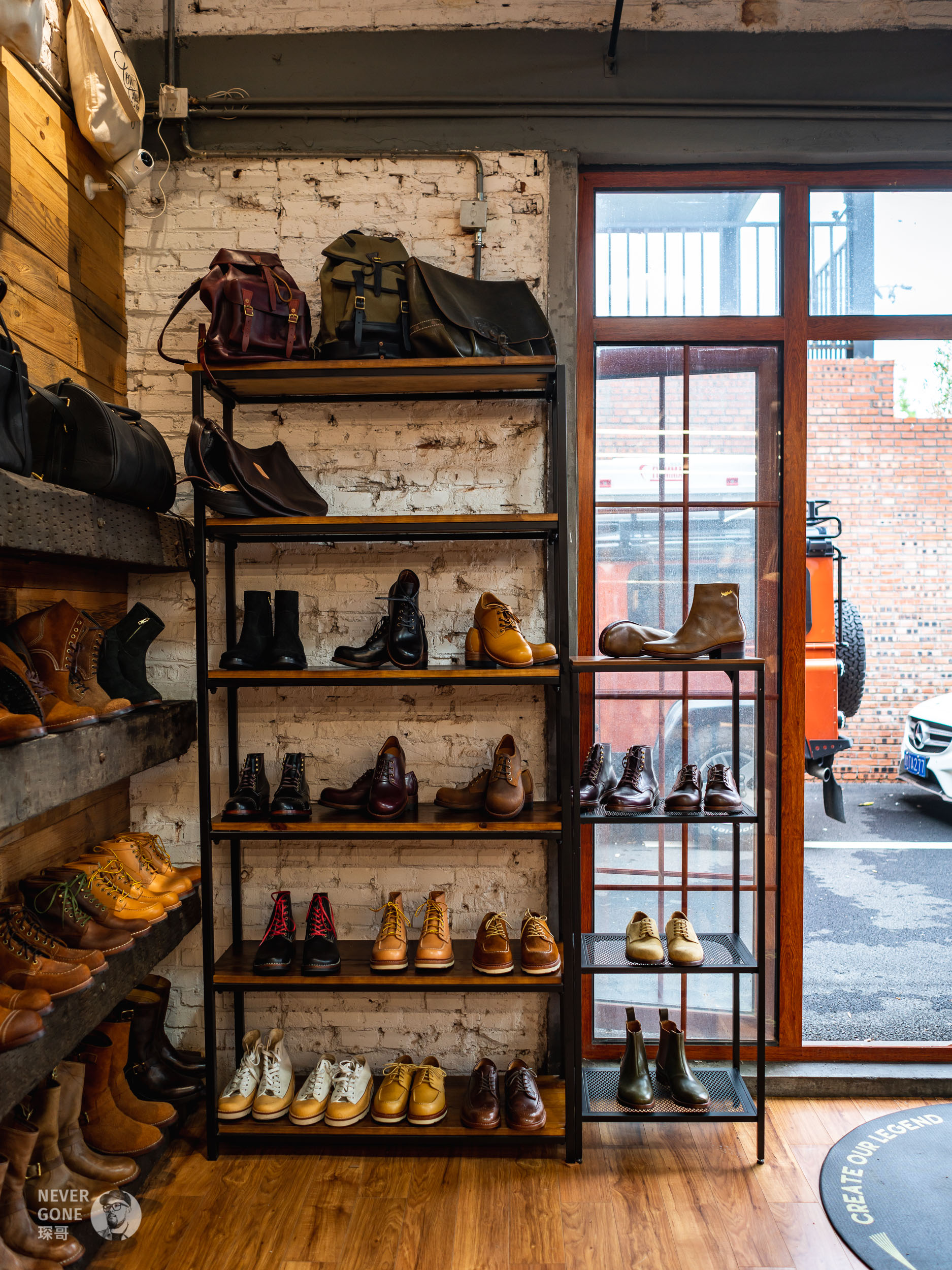 这个地方是前店后坊,一共有2层楼,地方挺大的,每层将近200平米,一楼是成品+工坊,2楼是仓库。整体弄的非常不错,挑高很高显得很大气,随手一拍就很出片。首先,一进去就是一面墙的靴子与包