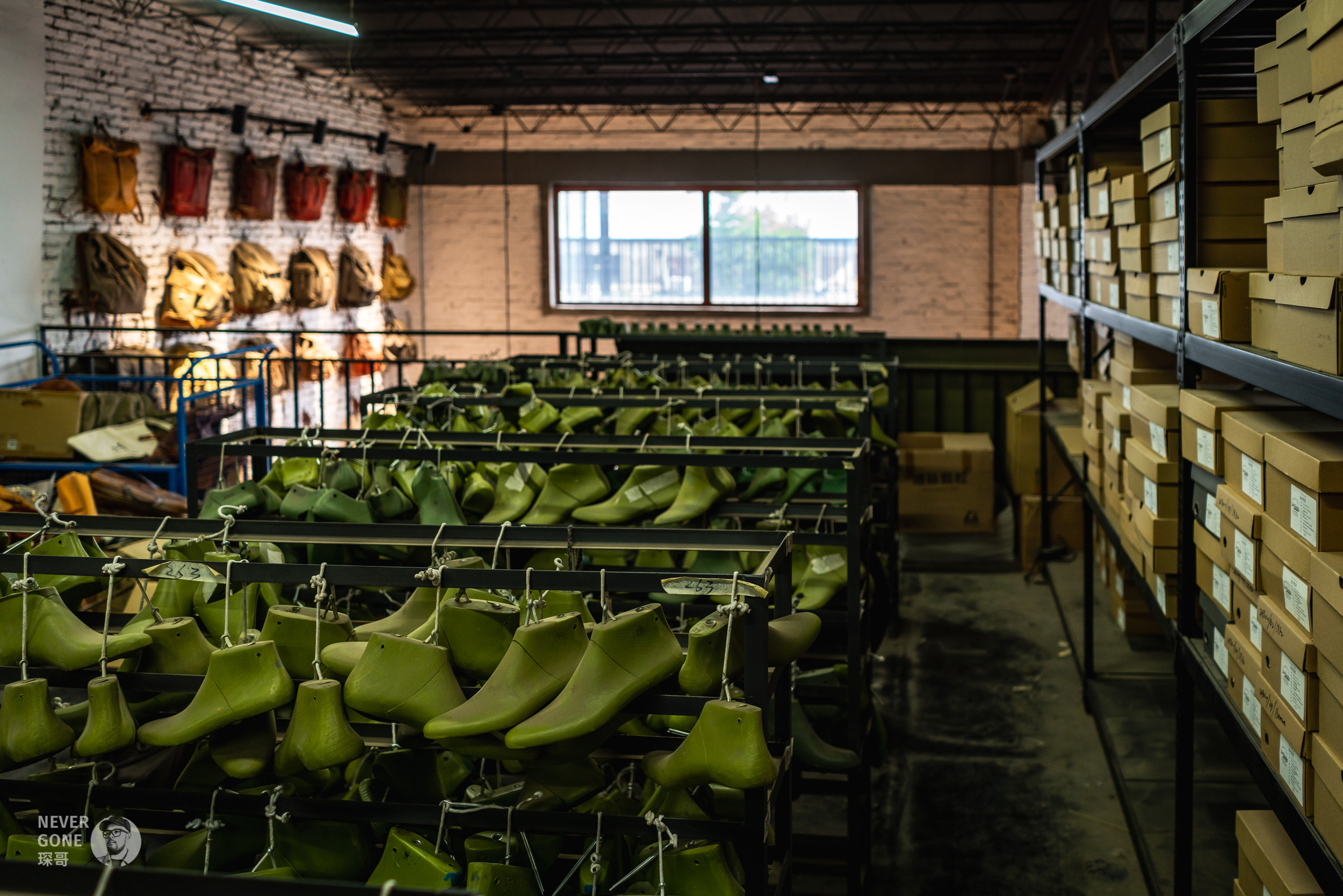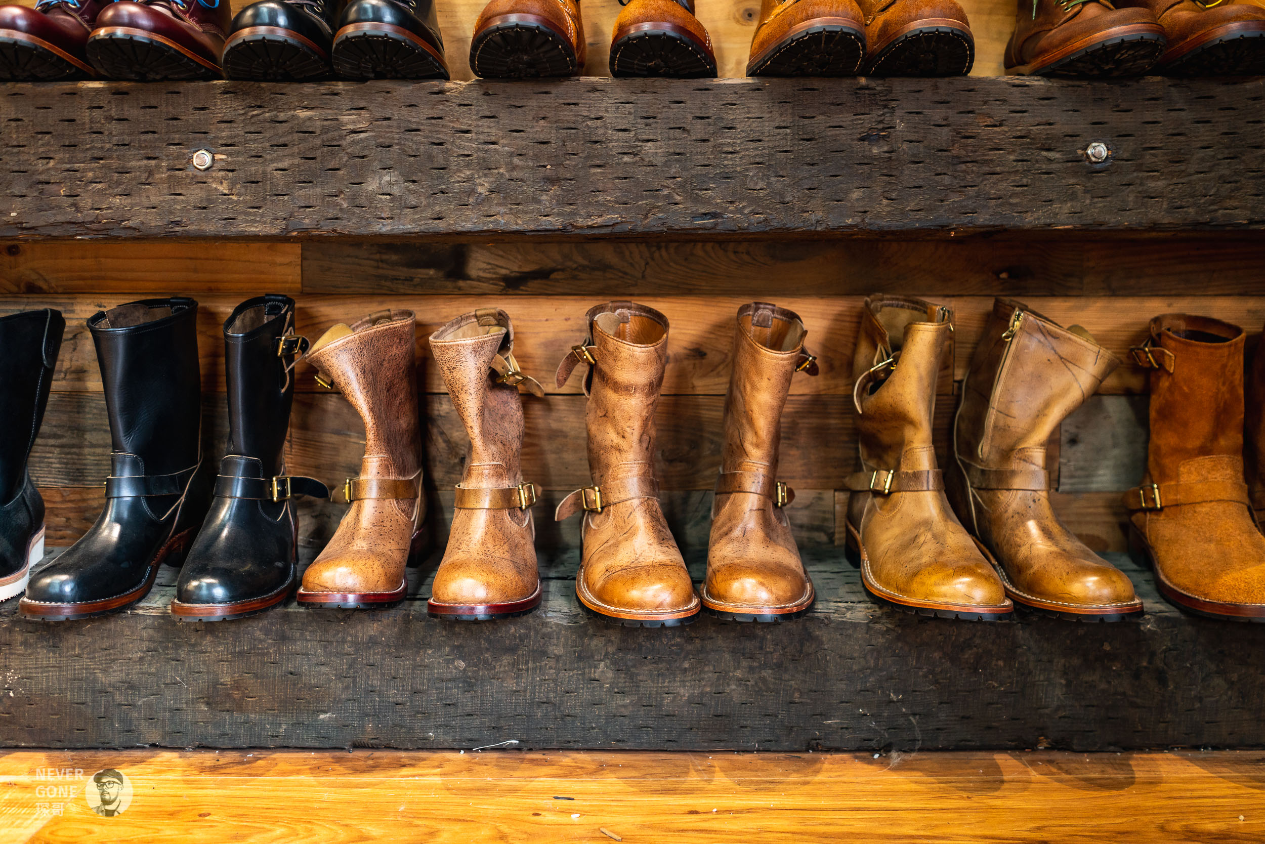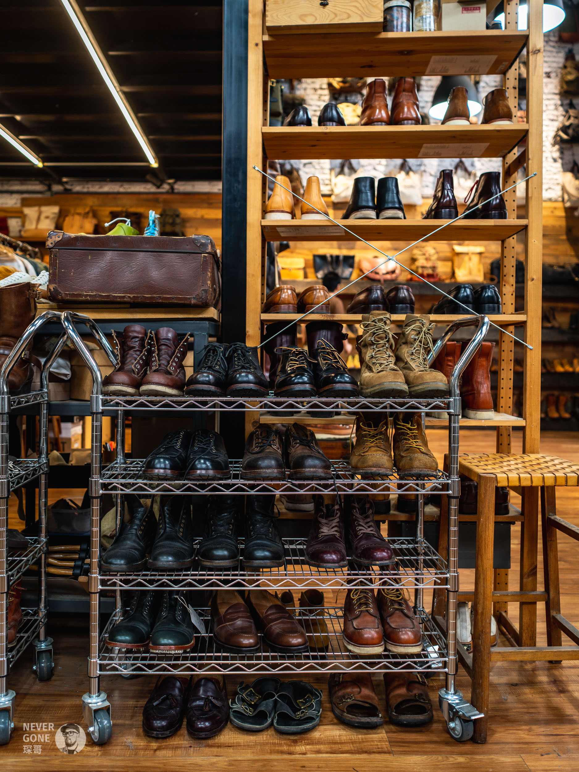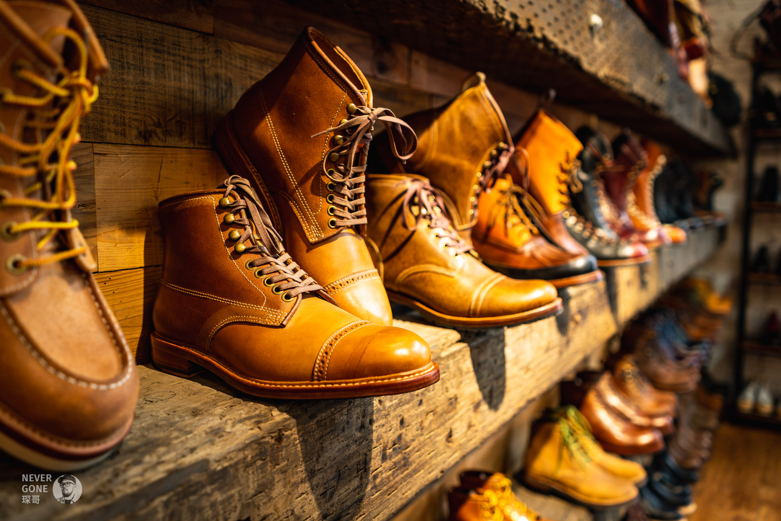 这个地方是前店后坊,一共有2层楼,地方挺大的,每层将近200平米,一楼是成品+工坊,2楼是仓库。整体弄的非常不错,挑高很高显得很大气,随手一拍就很出片。首先,一进去就是一面墙的靴子与包