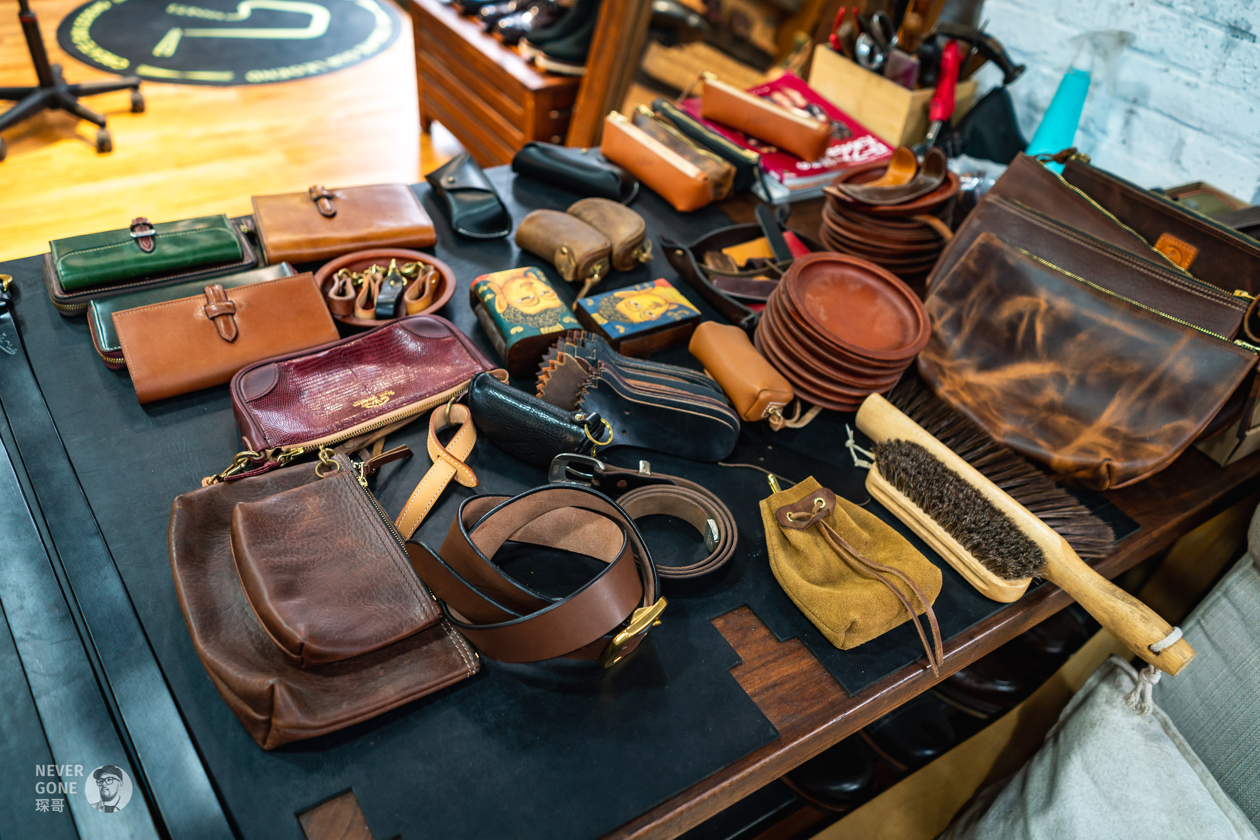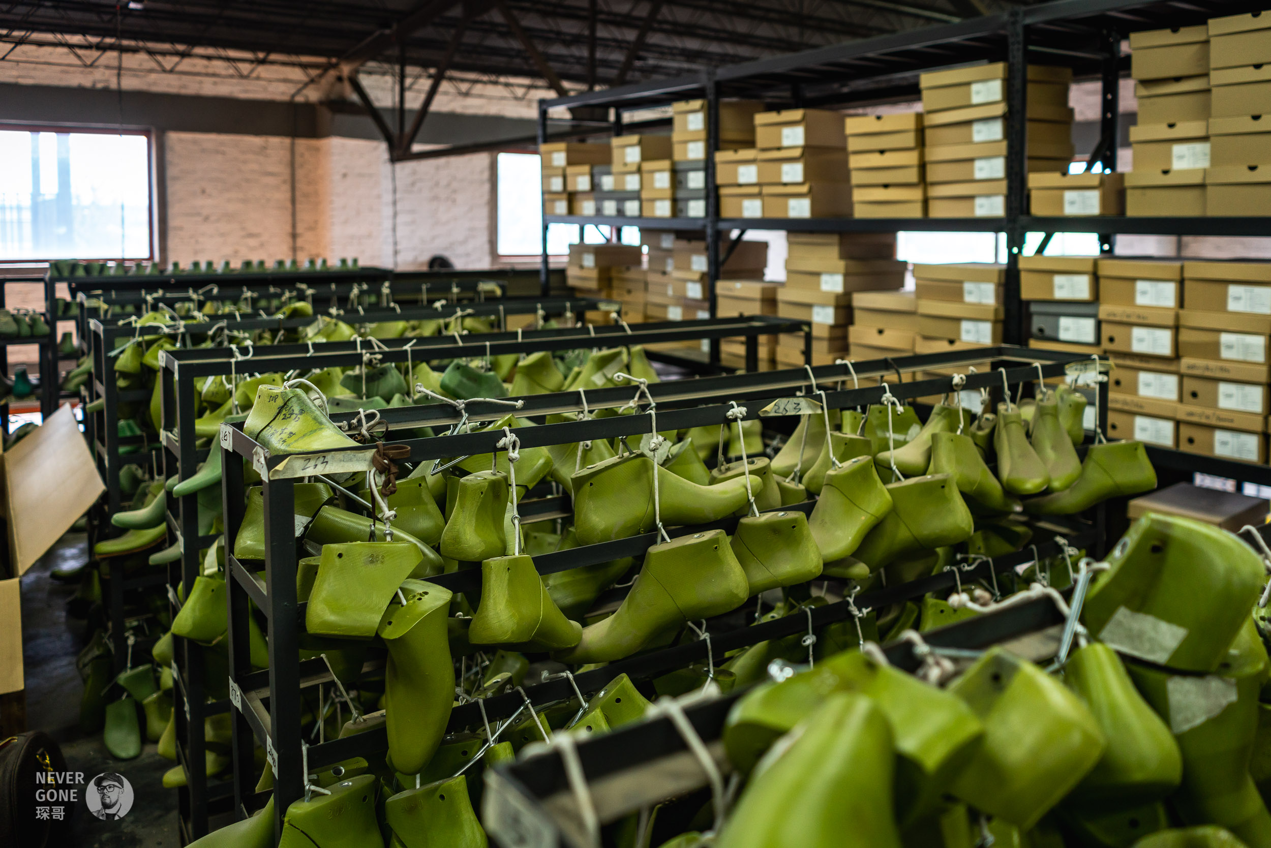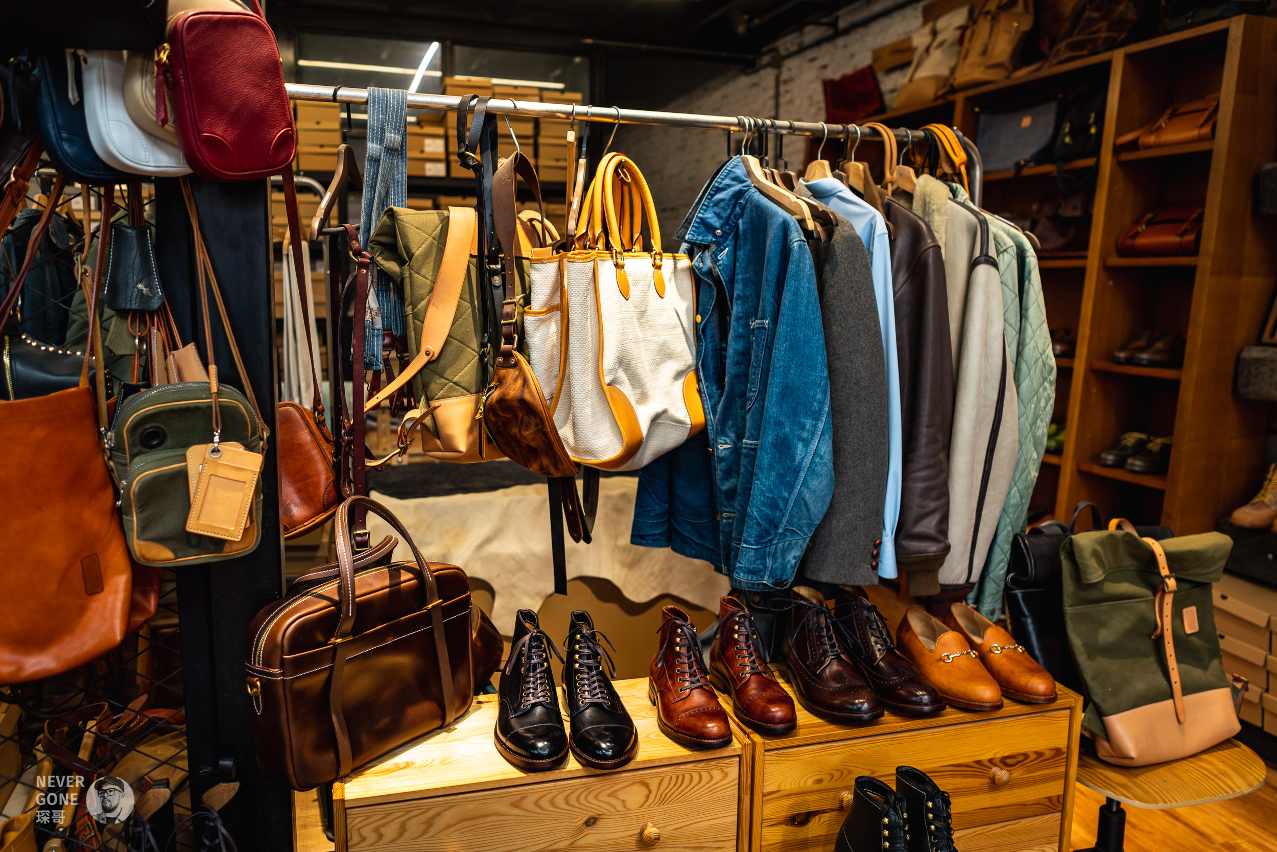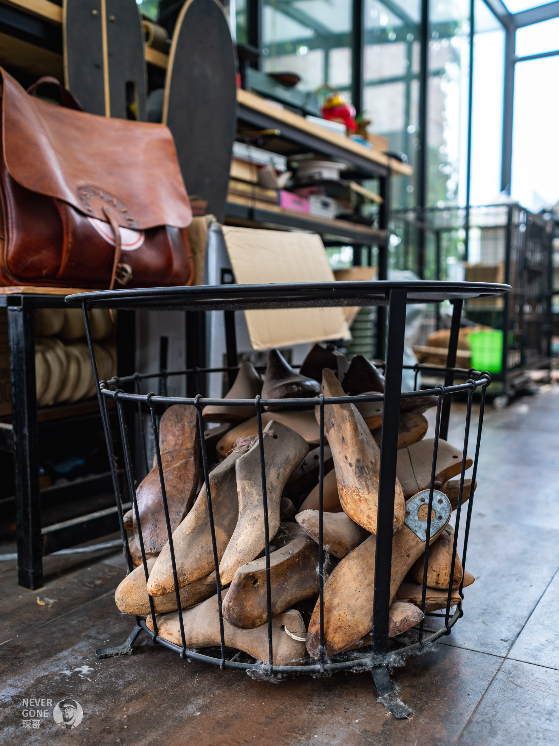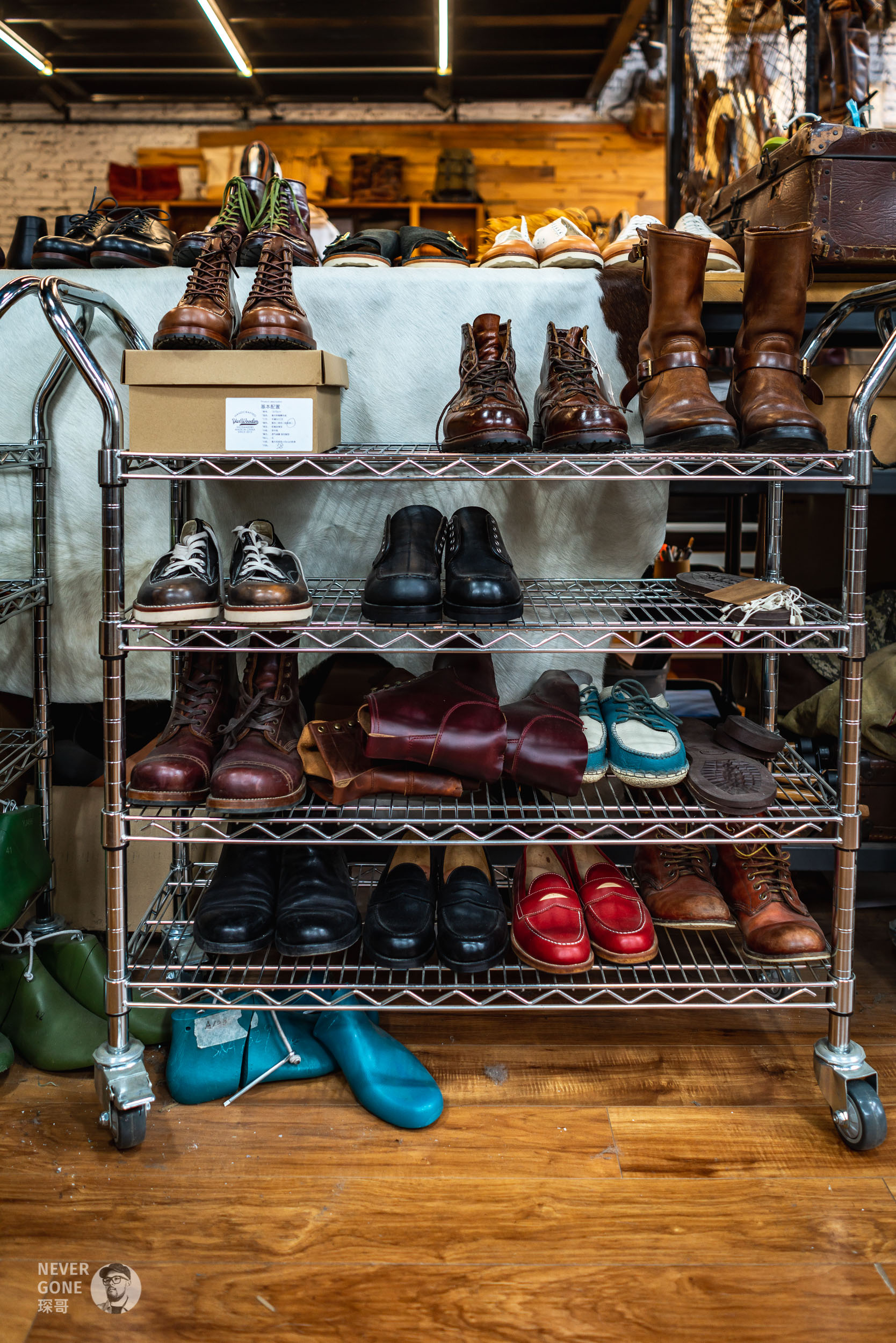 这个地方是前店后坊,一共有2层楼,地方挺大的,每层将近200平米,一楼是成品+工坊,2楼是仓库。整体弄的非常不错,挑高很高显得很大气,随手一拍就很出片。首先,一进去就是一面墙的靴子与包