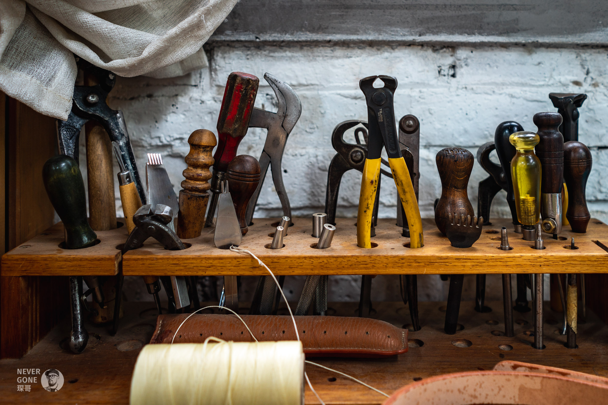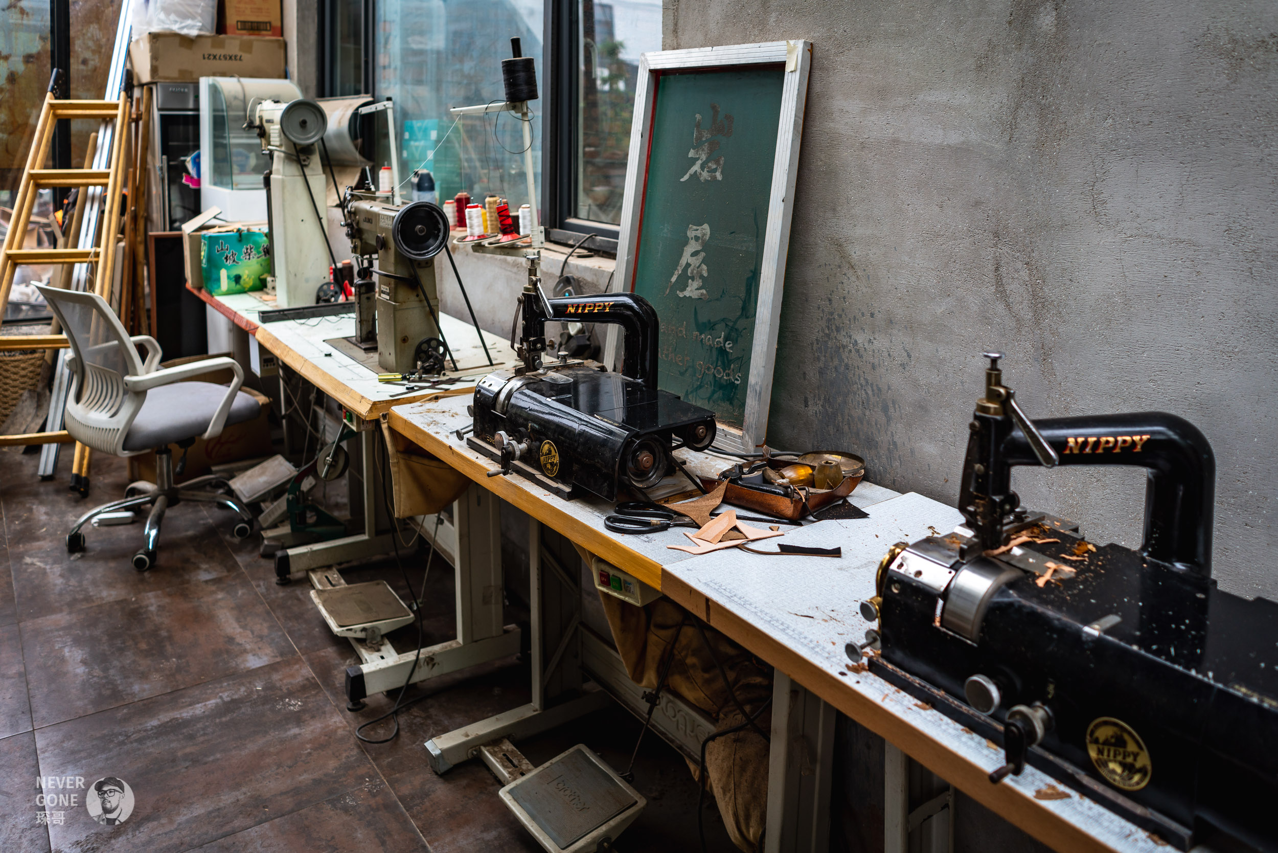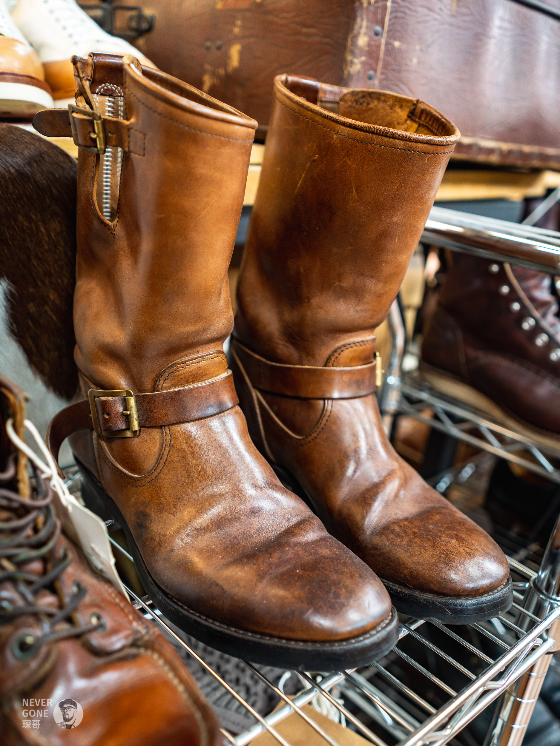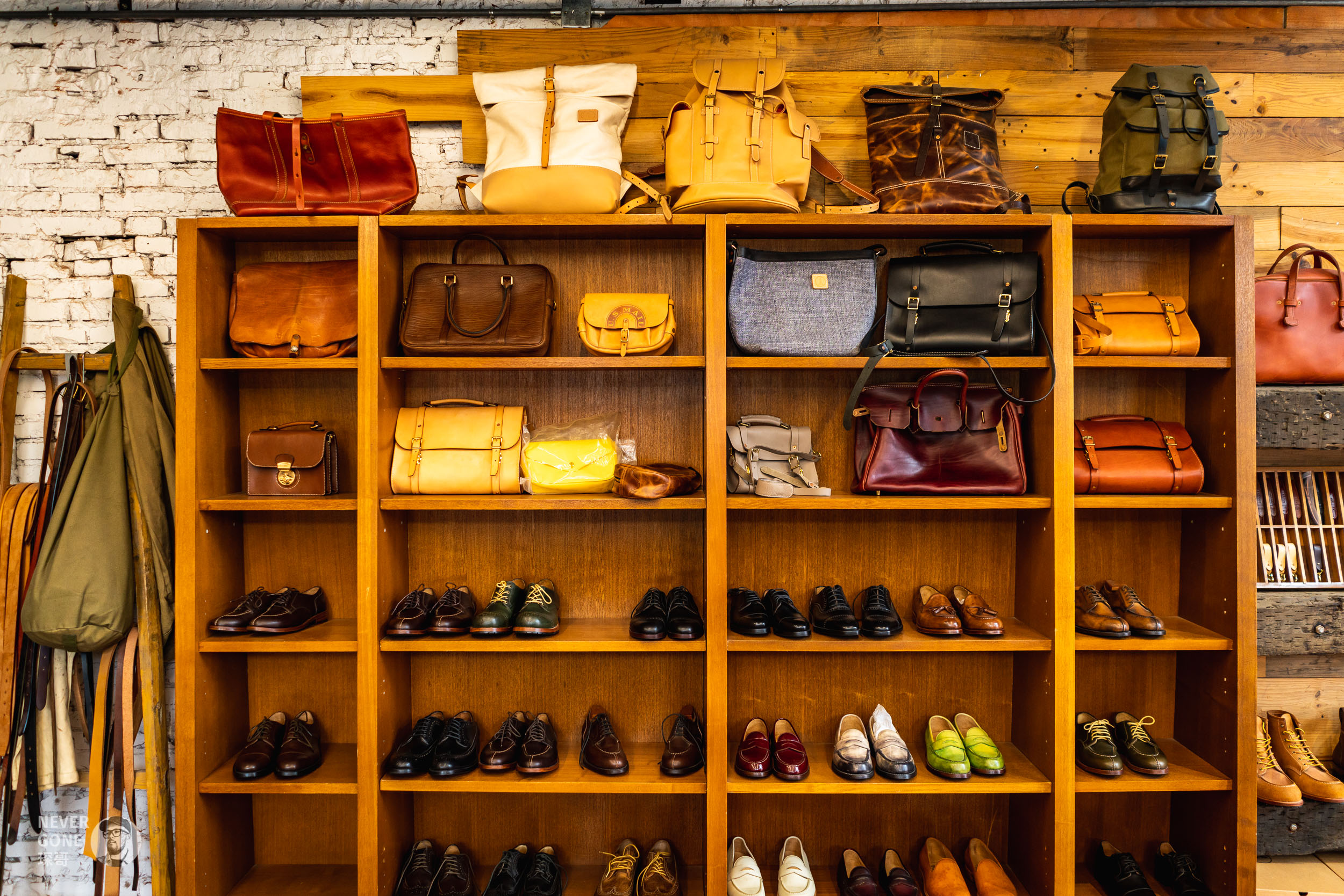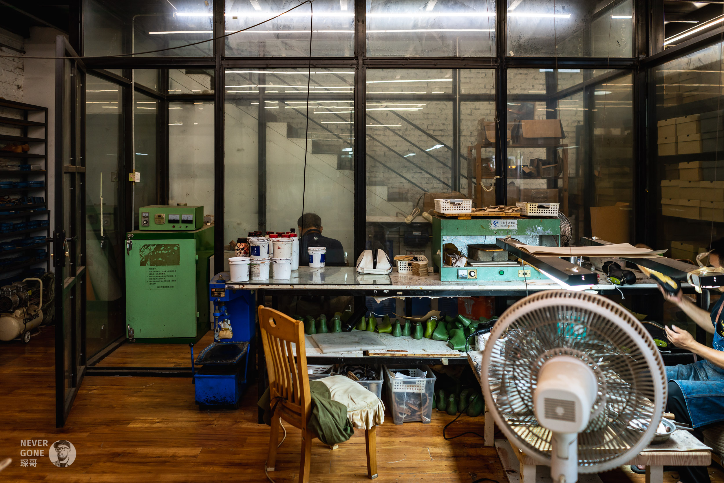 这个地方是前店后坊,一共有2层楼,地方挺大的,每层将近200平米,一楼是成品+工坊,2楼是仓库。整体弄的非常不错,挑高很高显得很大气,随手一拍就很出片。首先,一进去就是一面墙的靴子与包