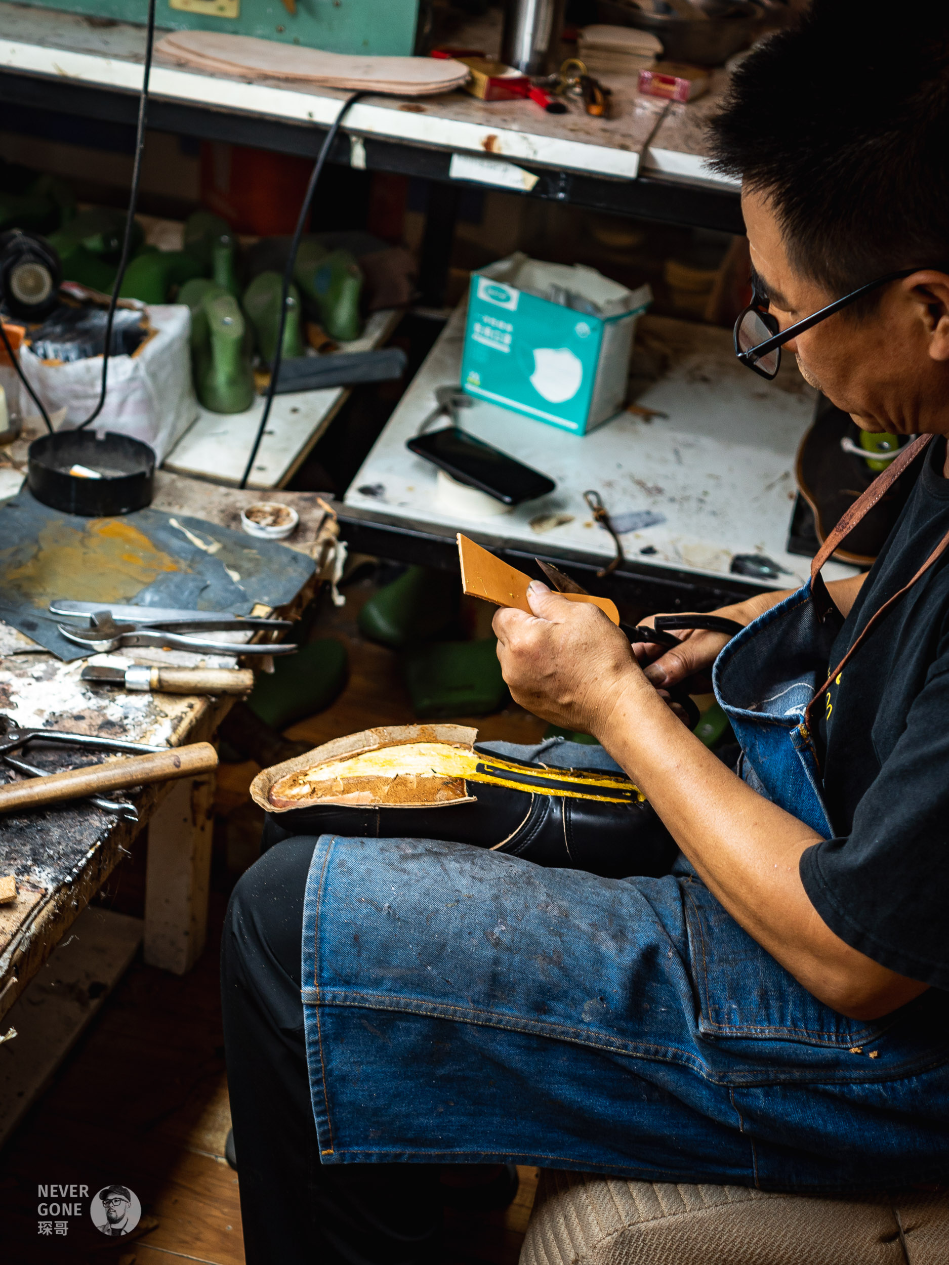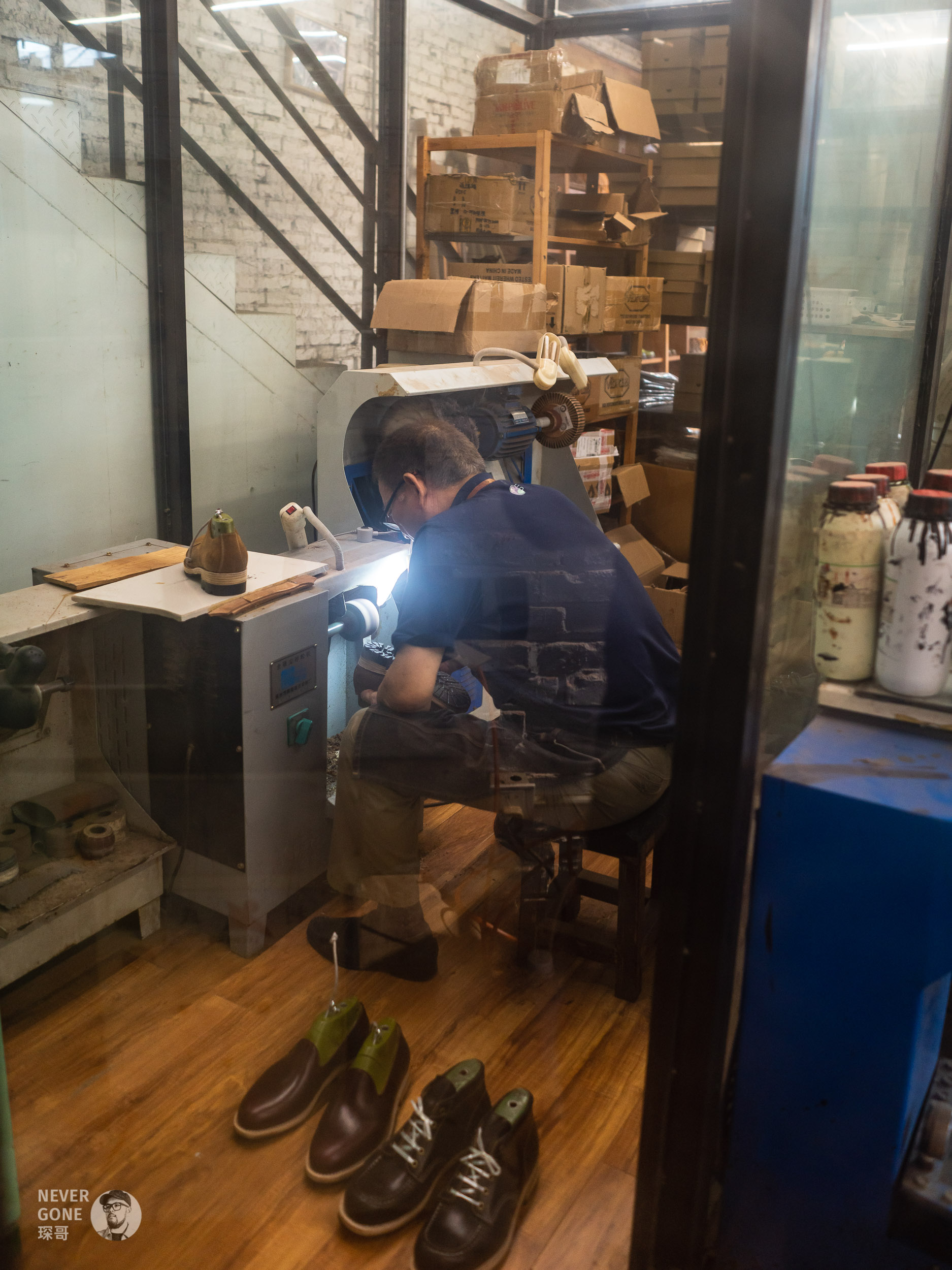 这边是底部区域,岩屋的鞋手工程度很高,沿条鞋是手缝沿条、手缝外线,外翻鞋也是手缝外线