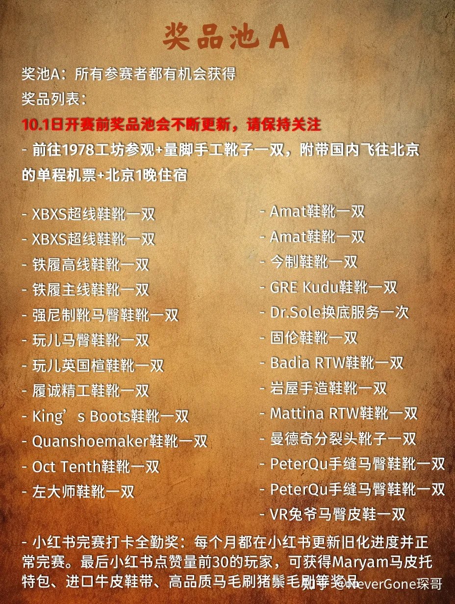 感谢强尼对本次旧化大赛的支持,目前总奖池已经突破了50双鞋靴,可以说获奖率会非常惊人了,假如最后500人完赛,获奖率可以达到10%。如果再算上丰富的其他奖品,获奖率就更高了,下面是部分奖品列表,欢迎大家参赛~