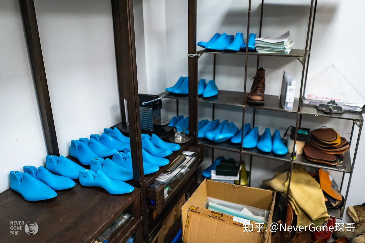 接下来到了底部区域,一进门就是做好的鞋面和鞋楦,左边是绷鞋机