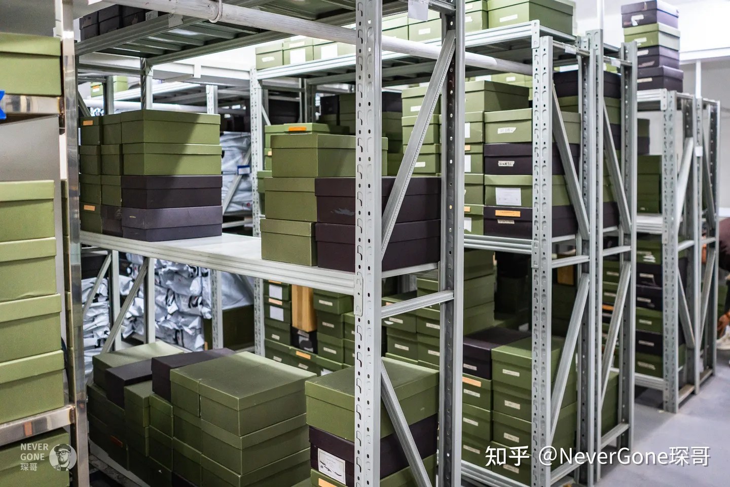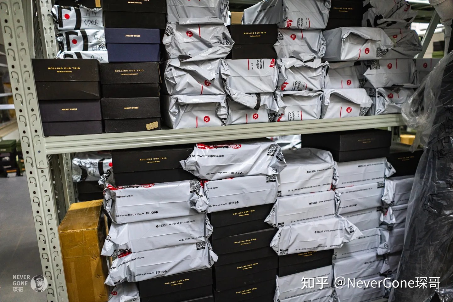 最后我们来到打包发货区,位于办公区的二楼,发货区紧挨着仓库,陈列着各类强尼的鞋款,以及部分德永盛也。