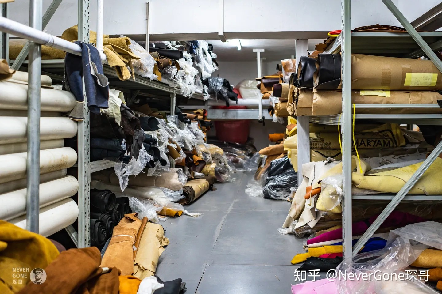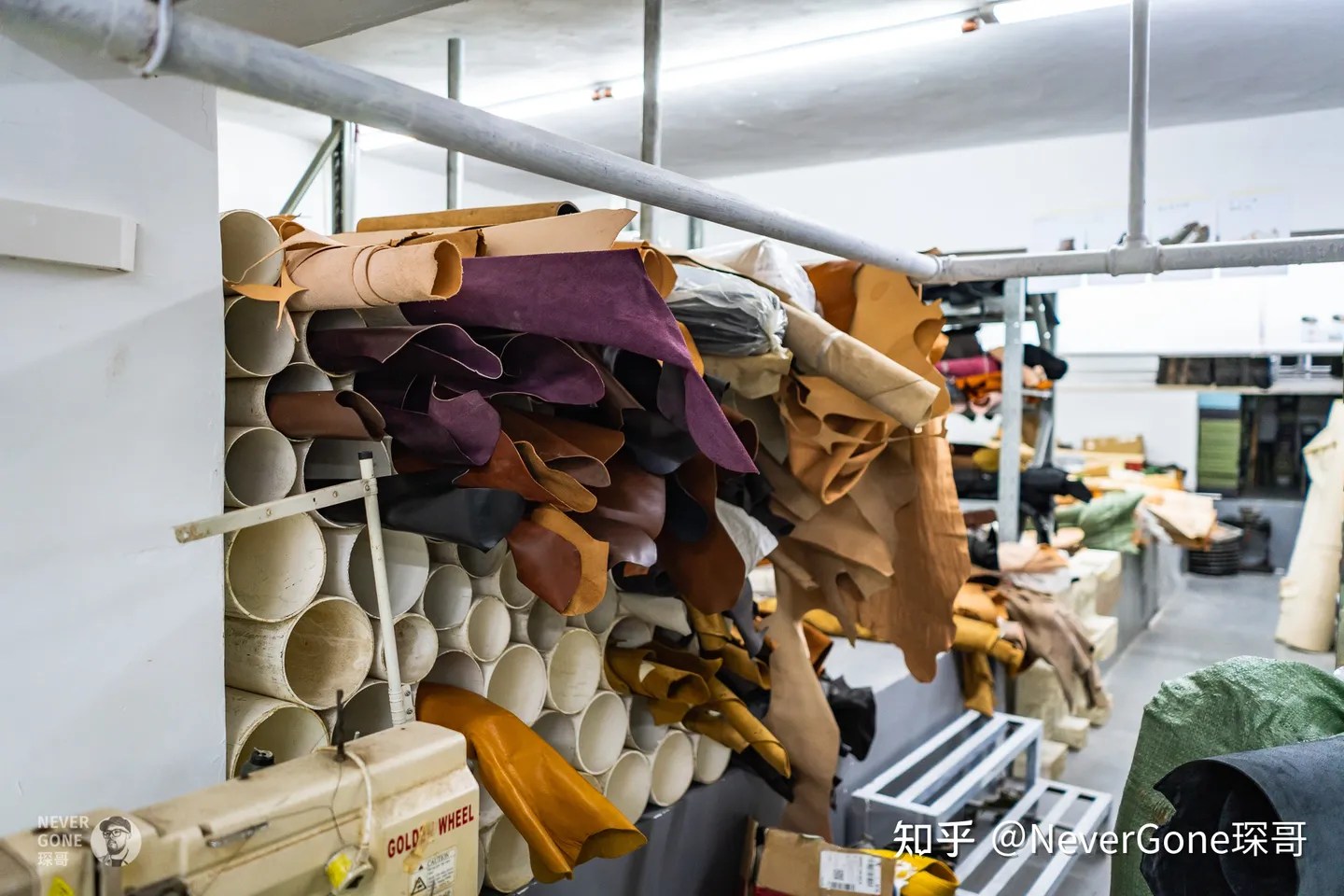办公的区域到此就算结束了,接下来就是生产部分的参观,首先参观的就是皮料存放区,位于办公区的二楼,可以看到有各式各样的皮料。