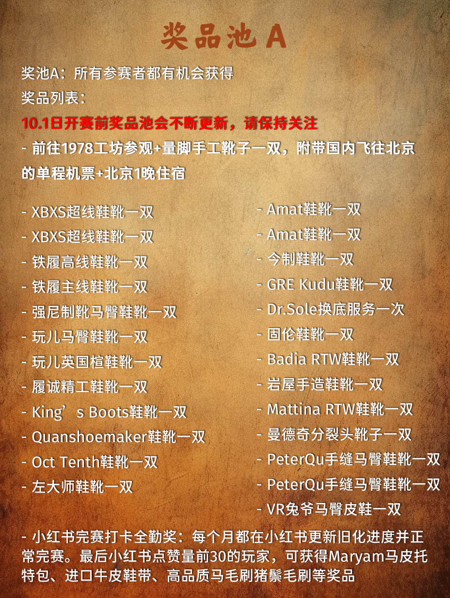 最后是旧化大赛日常宣传,目前总奖池已经突破50双鞋靴了,比我当初预想的30双实在要高出太多,其他奖品数量也非常夸张,具体请查看chen-ge.ⓒⓞⓜ