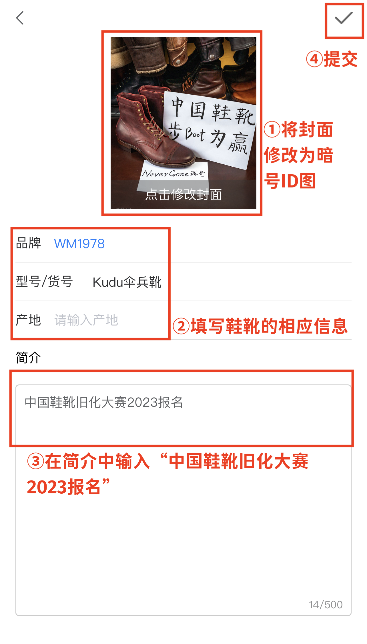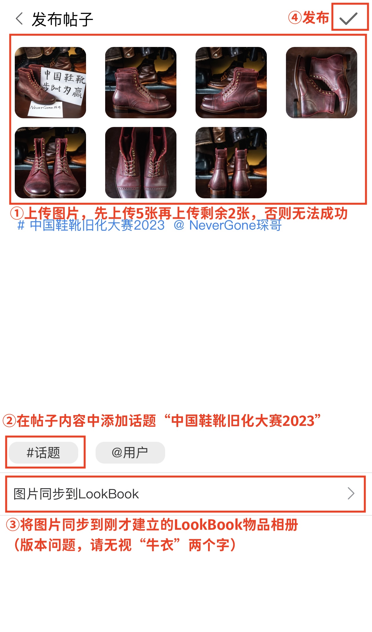 在简介中输入“中国鞋靴旧化大赛2023报名”,然后右上角提交。注意,LookBook物品相册提交后无法编辑只能删除,所以请按照指南进行操作。创建相册后,请不要从相册直接上传图片,而是必须发帖的时候传图片