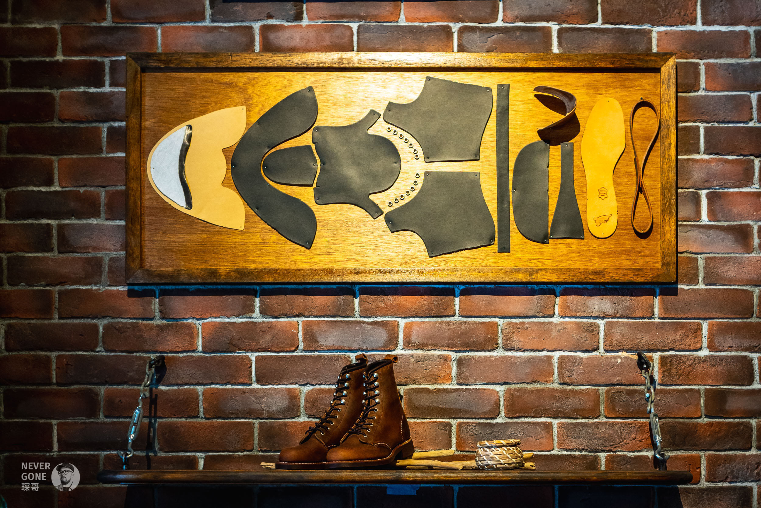 墙上这个装饰很不错,能一览鞋面裁片、五金、前后港宝等等,有点像那种iPhone零件解剖标本展示框