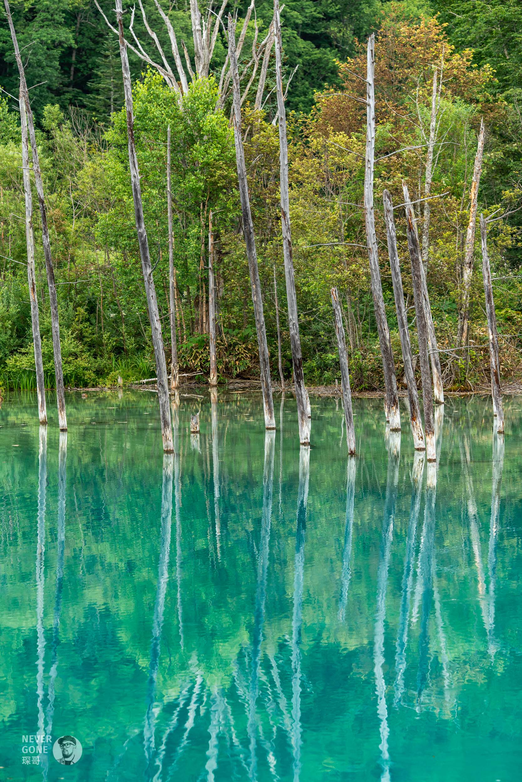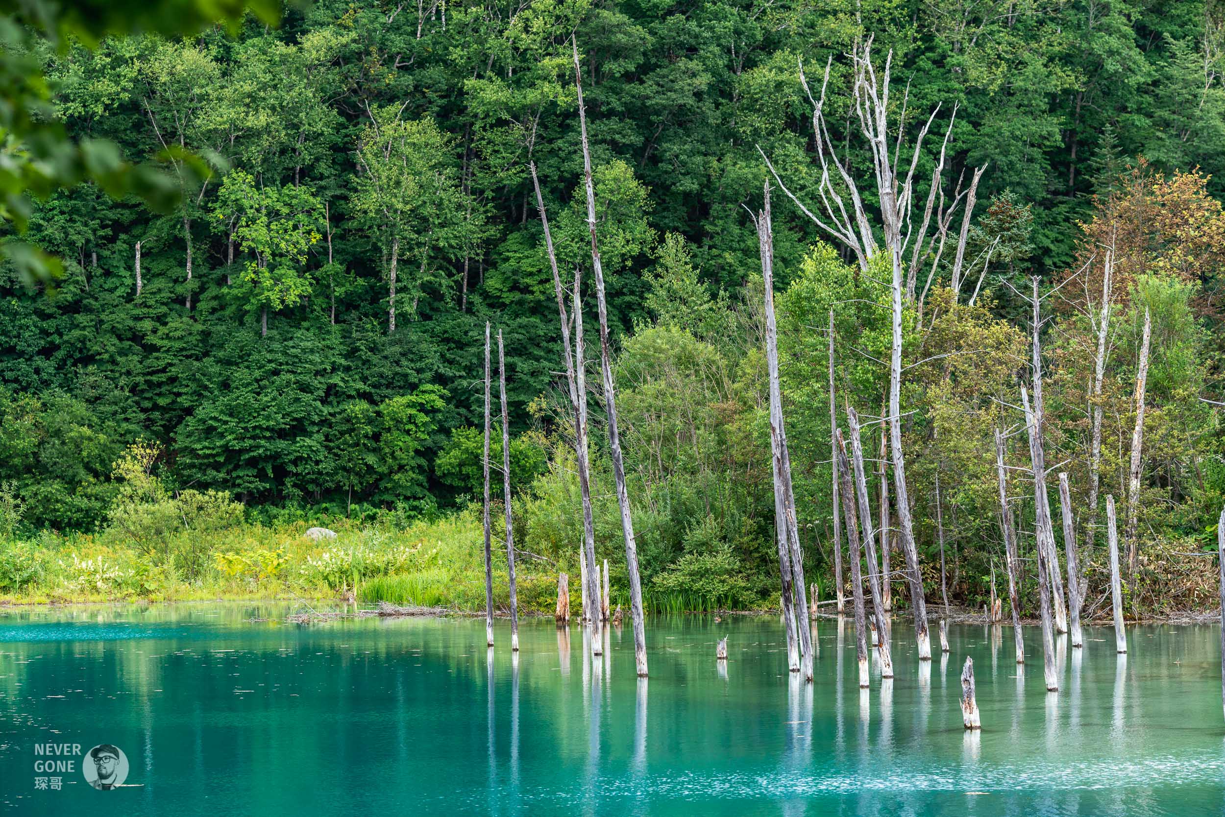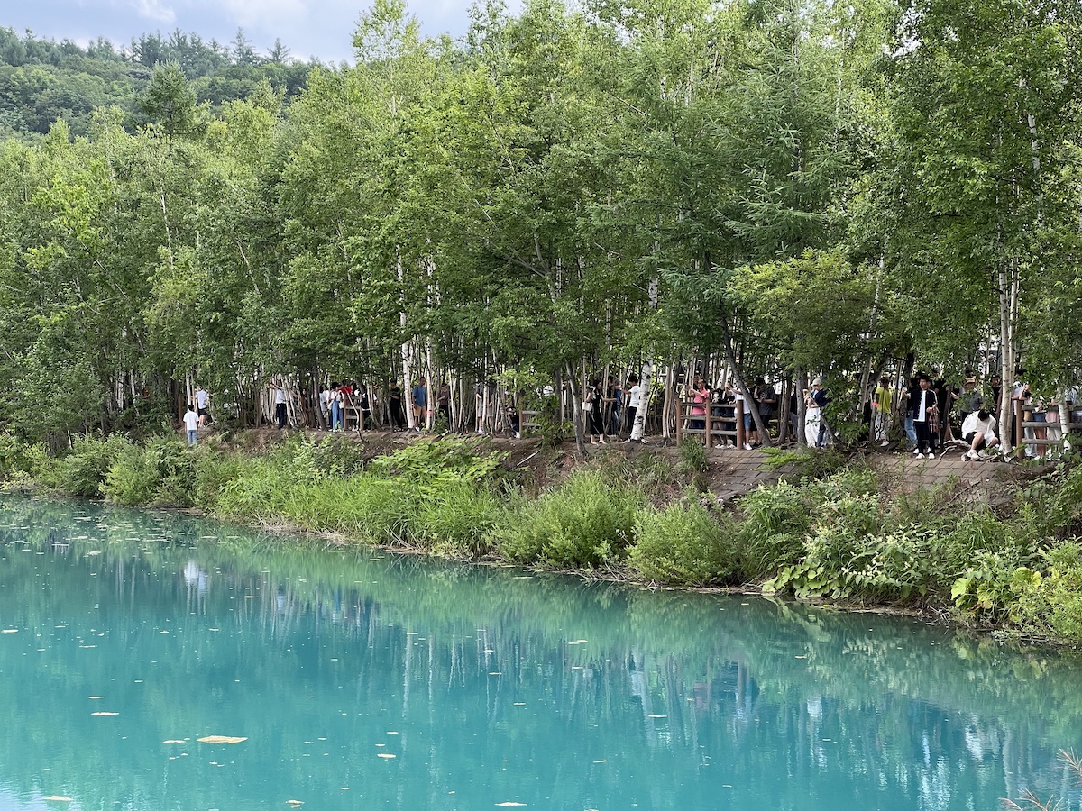 然后前往下一个景点:美瑛清池。美瑛清池位于北海道美瑛川左岸,因拦截火山岩浆修建的水坝截流而成,在阳光下池水会反映出青蓝色,故而得名。按照我们通俗的理解,可以一句话概括为“小九寨沟”