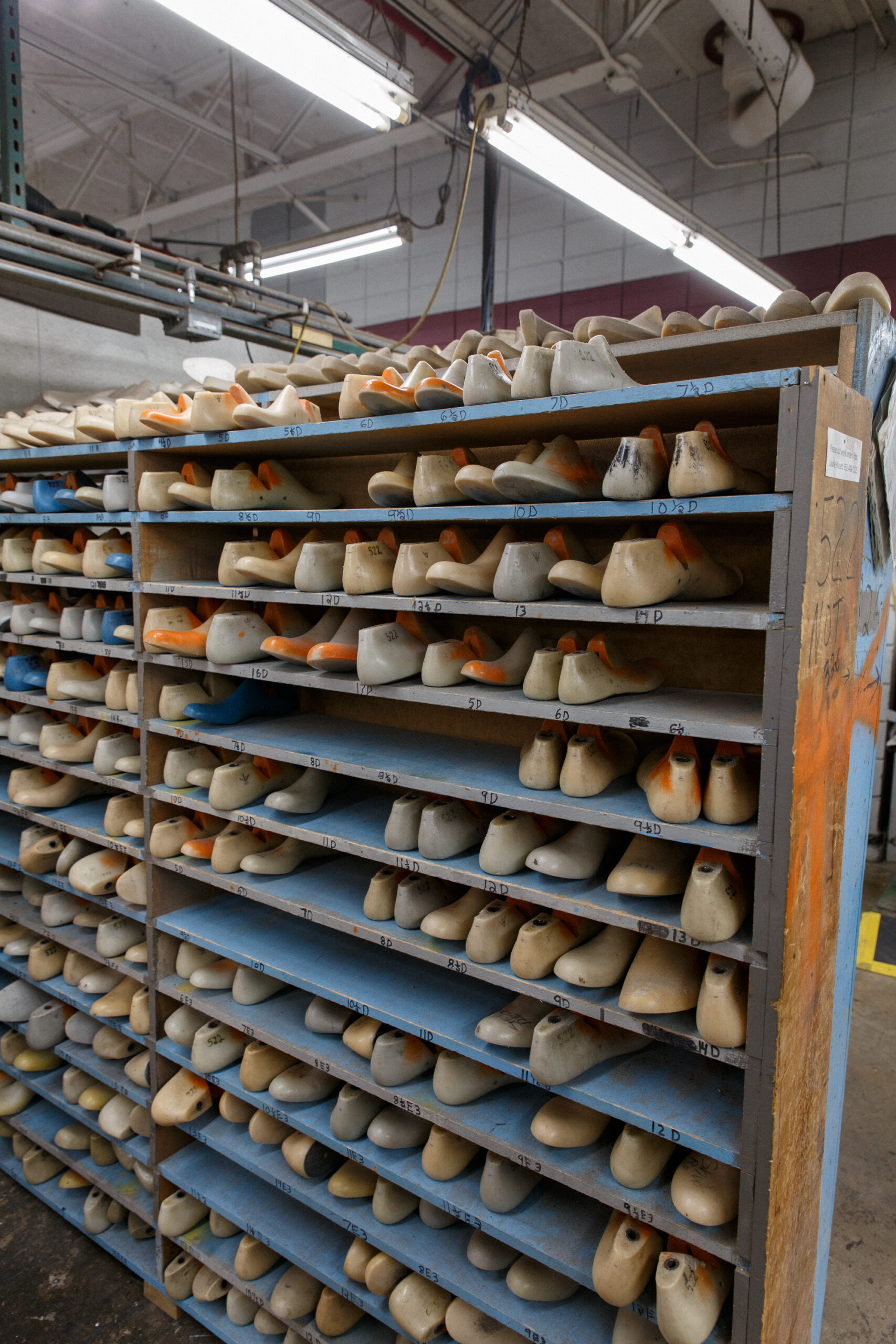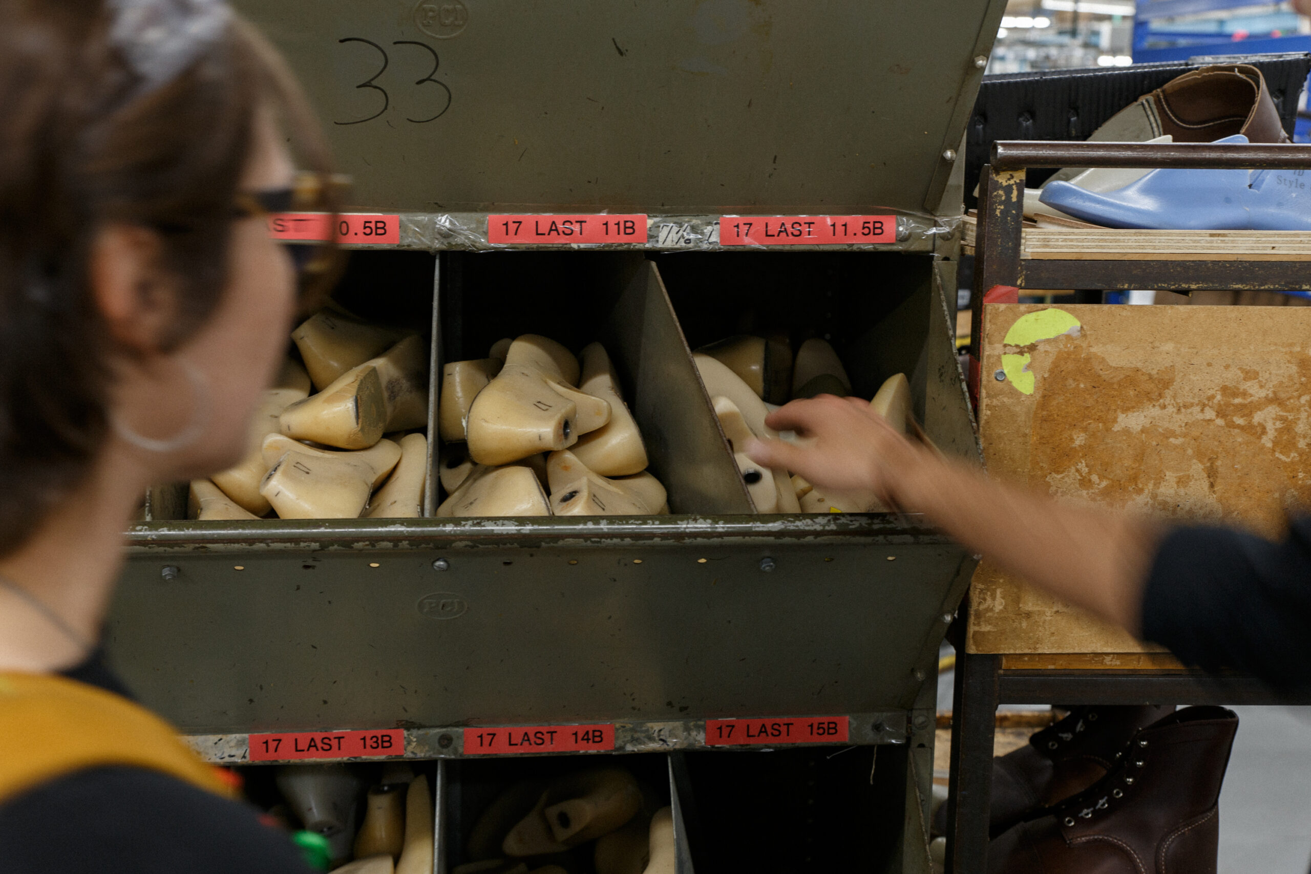 我们参观了 Red Wing 的大型鞋楦库。迈克解释说,许多鞋楦已经使用了几十年。为了演示,他从其中一个垃圾箱里随意拿出一个楦头–上面的铭文显示它是 1989 年制造的。看起来,它还能在厂里继续用上好多年。