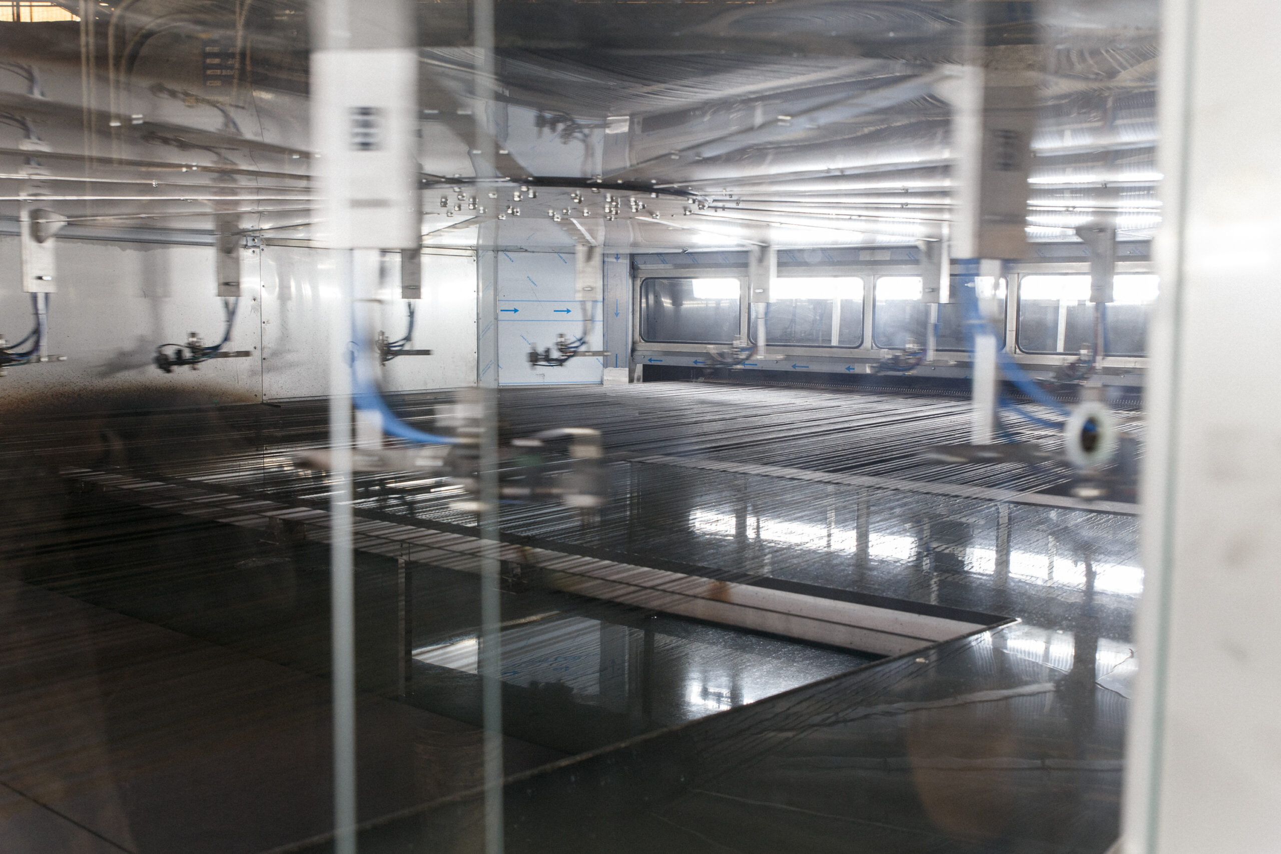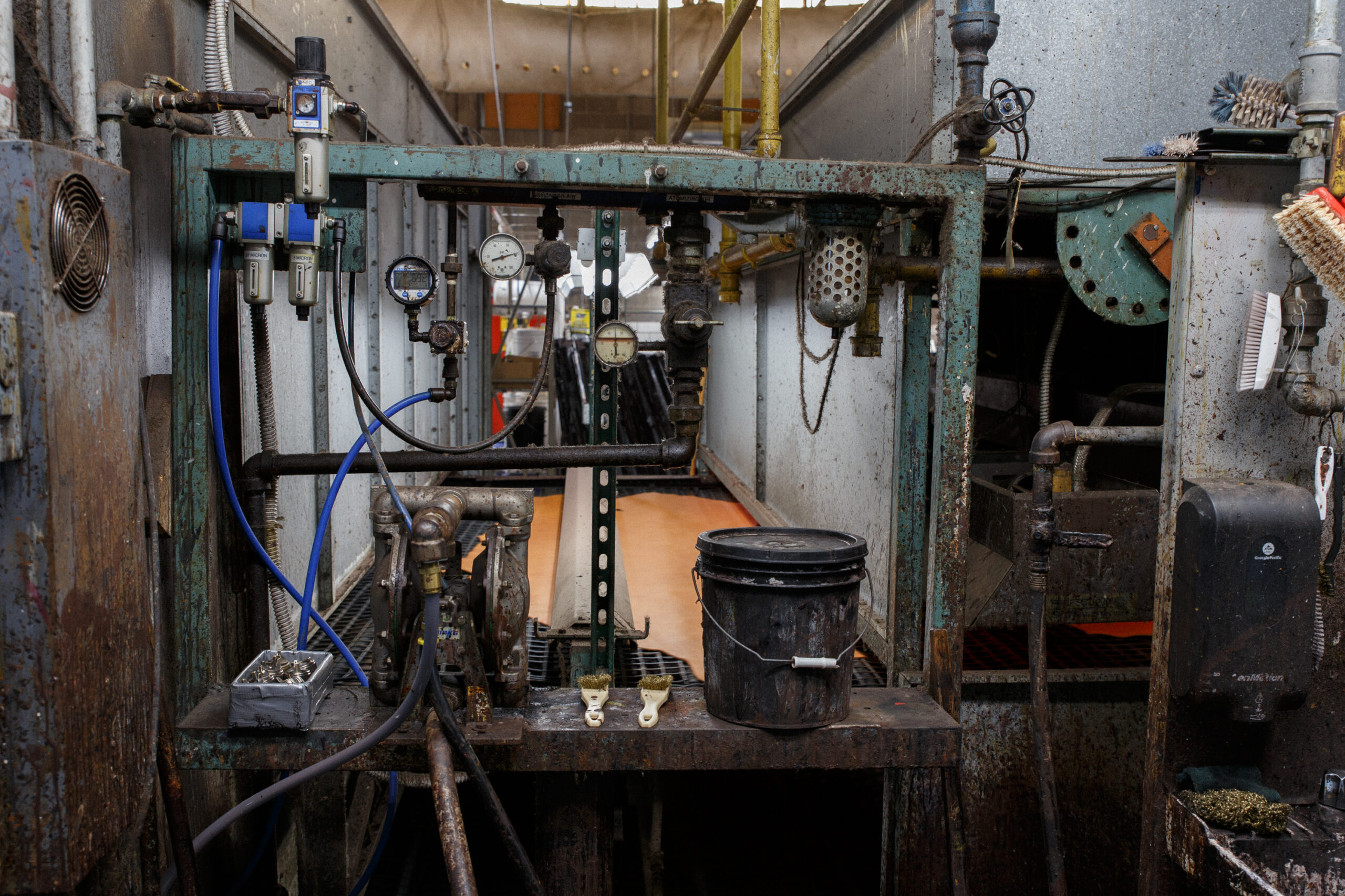 这里有两排平行的喷漆室,它们是老旧设备如何逐渐被新设备所取代的明显例证。一边是老式主力喷漆室,它们仍在不停地运转,工业用的灰色金属板上溅满了几十年的染料和机油。另一边则是喷涂技术公司(Spraytech)生产的一套新式设备,喷头带有电子眼,可以 “看到 “皮革的边缘,从而在每块皮革上均匀地喷涂染料。
