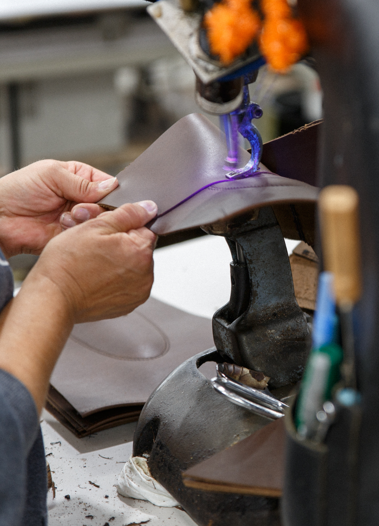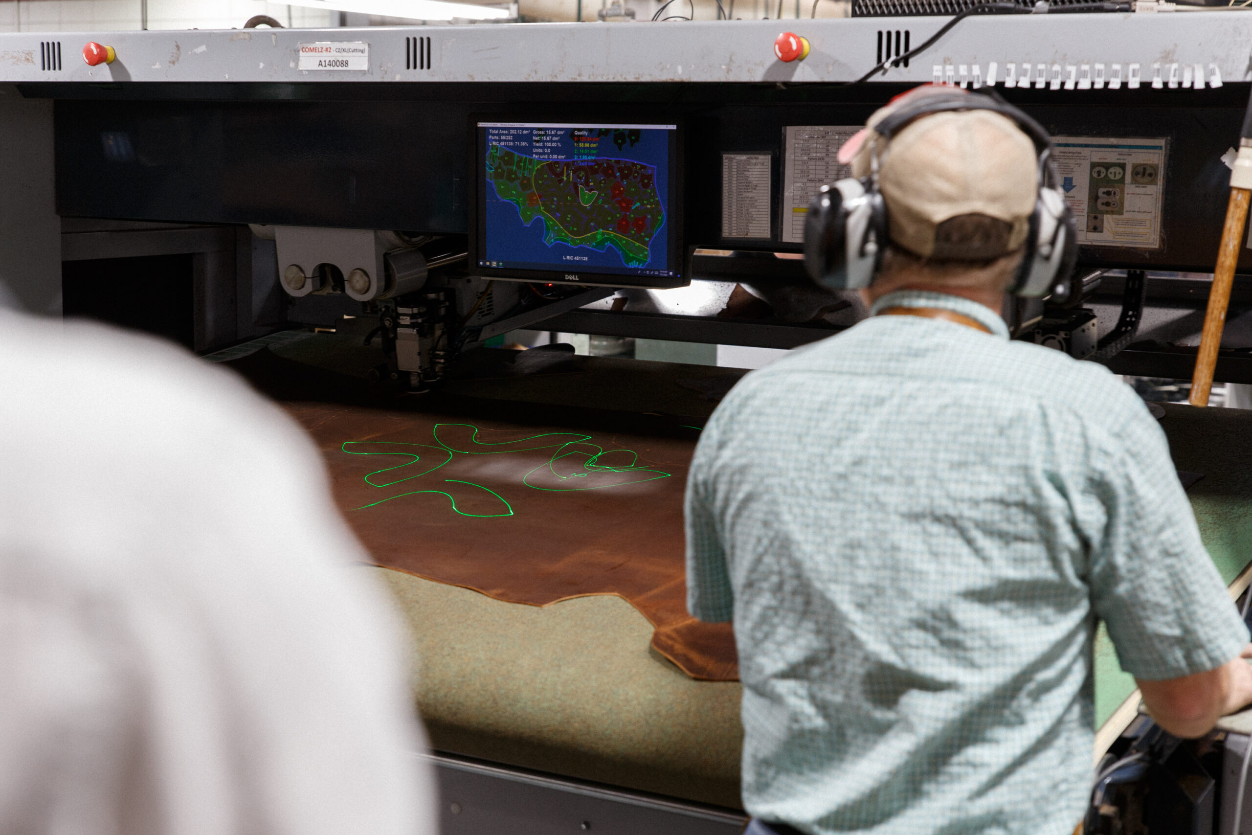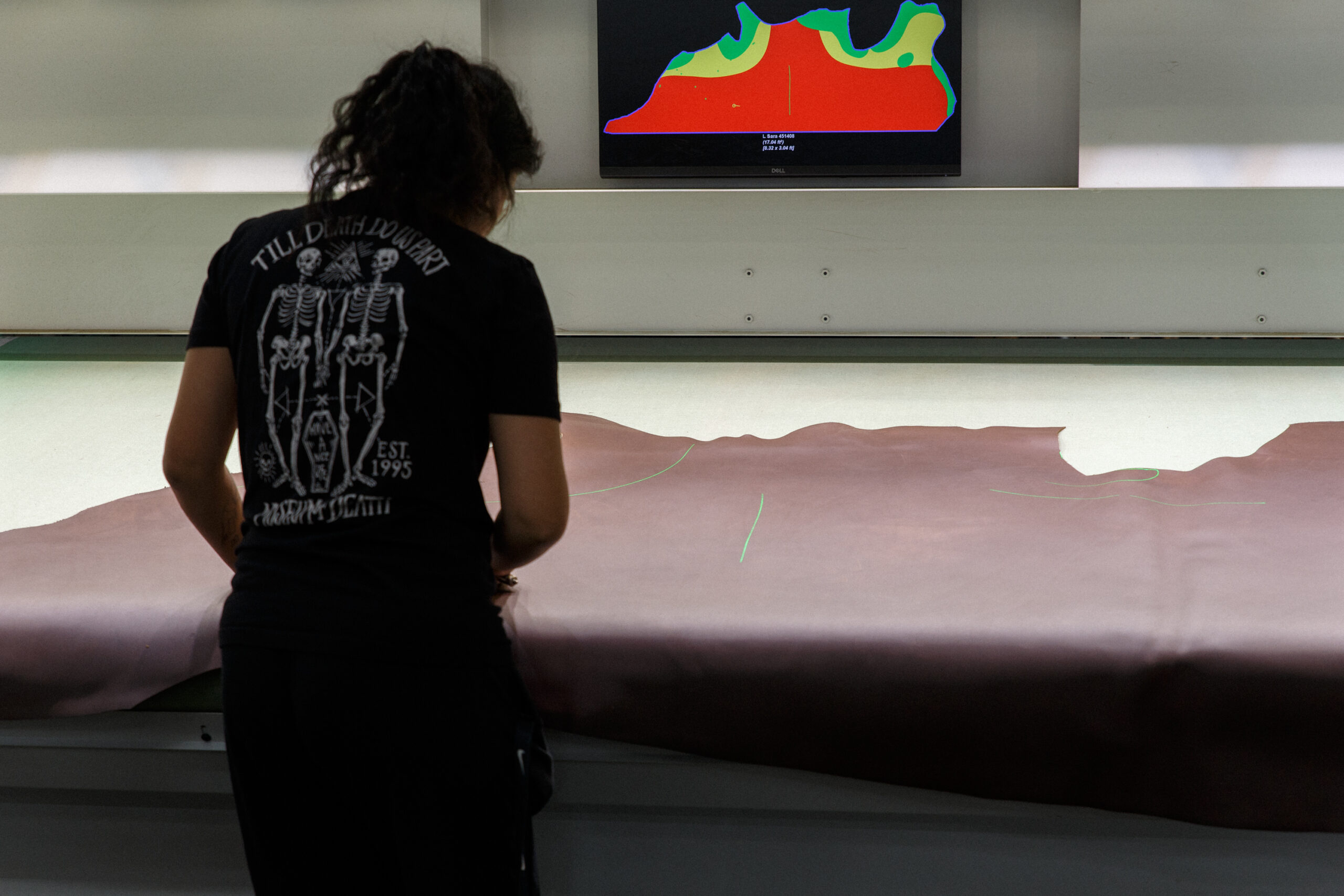 在数字化下料工位,操作员将一块皮革放在罩子下面,用激光笔标出伤疤或其他缺陷的位置。她还用这支笔对皮革的不同区域进行分级,以确定应该从哪里切割特定的皮革–两侧帮面、鞋舌、鞋头皮面等。然后,皮革被送到一台半自动切割机上,这台机器上有带刀的机械臂。这台切割机从数字化下料机获取信息,然后根据正在制作的靴子版面测量数据,切割每一块皮革。这台机器以最高效的方式切割每一块皮革,几乎不会留下任何废料,非常先进的技术