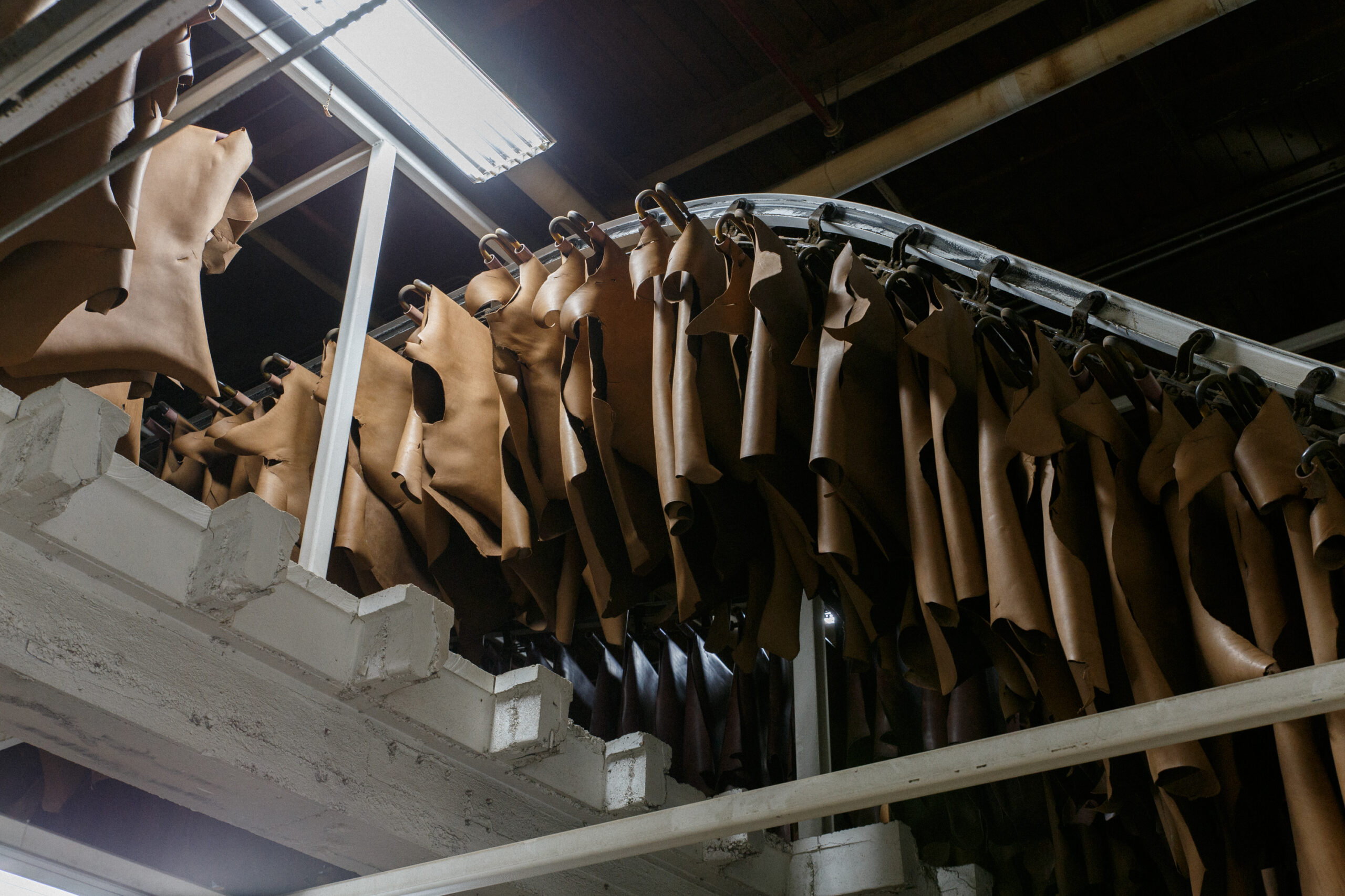 接下来是更彻底的干燥过程,看着这个过程,不禁让人联想到巨大的干洗作业车间。一个装有巨大钢板的真空干燥器用来压缩和加热皮革,将皮革的含水量降至 25% 左右。最后一道干燥工序更为简单:将每块皮革挂在一个巨大的衣架上,衣架在下层制革厂的多个房间中穿梭。