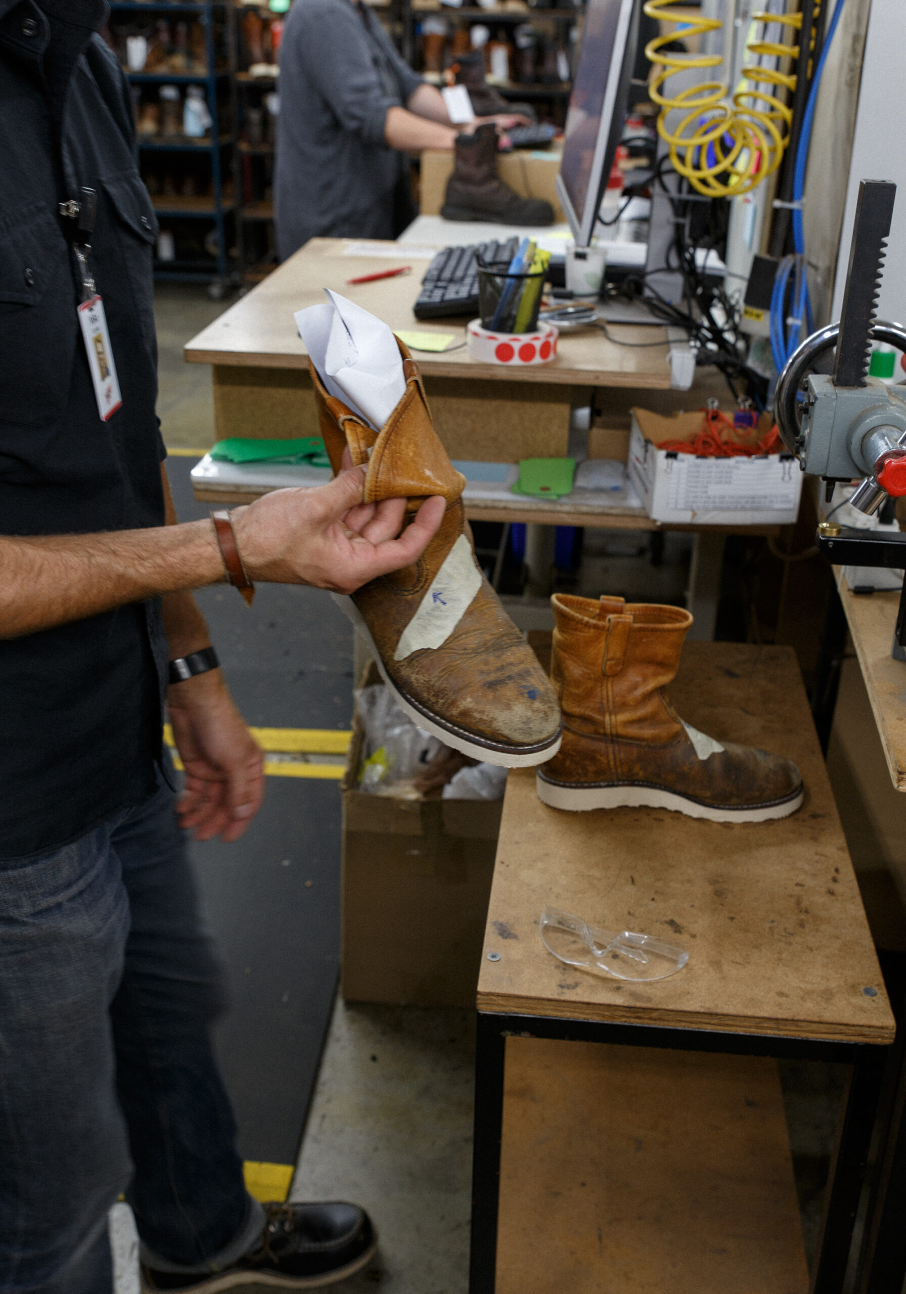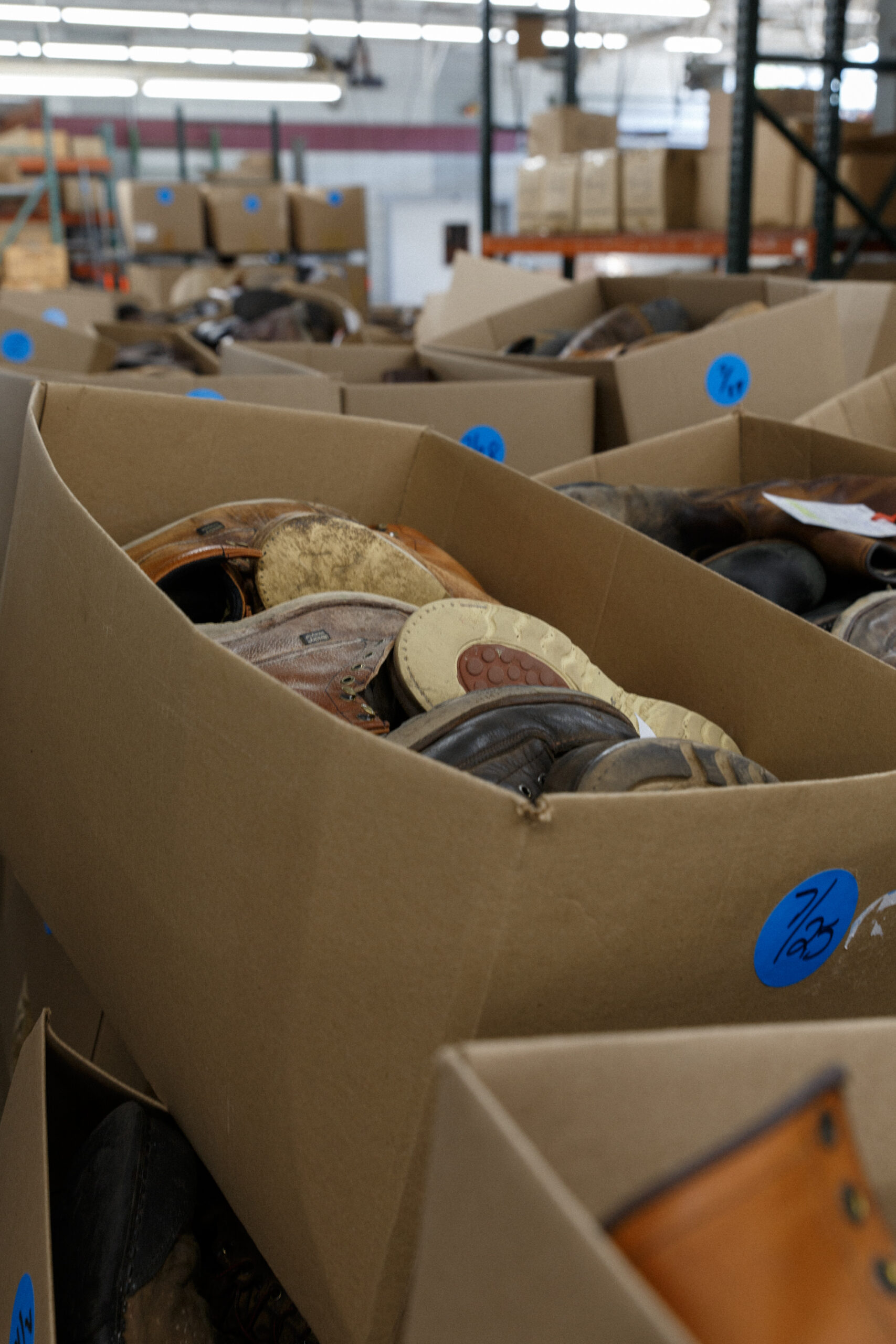 许多从 Burnside 厂里发出的靴子,有朝一日可能会被送回来进行换底或者其他修理。虽然 Red Wing 的一些独立经销商会将客户的靴子送到当地的修鞋店,但许多靴子还是会被送回 Burnside 工厂。红翼的维修部门位于宽阔的生产车间一角,当我们走到那里时,我惊掉下巴:堆积如山的纸箱,每一个都装满了靴子,等待着焕发新生。不知如何,我很想打开箱子看看有哪些独特的旧靴子等待被修复,但我忍住了。迈克拿起放在附近台面上的一双深受人们喜爱的Pecos,上面的印章显示这双靴子是 2000 年生产的,这双靴子刚换被换上Wedge Sole发泡底。