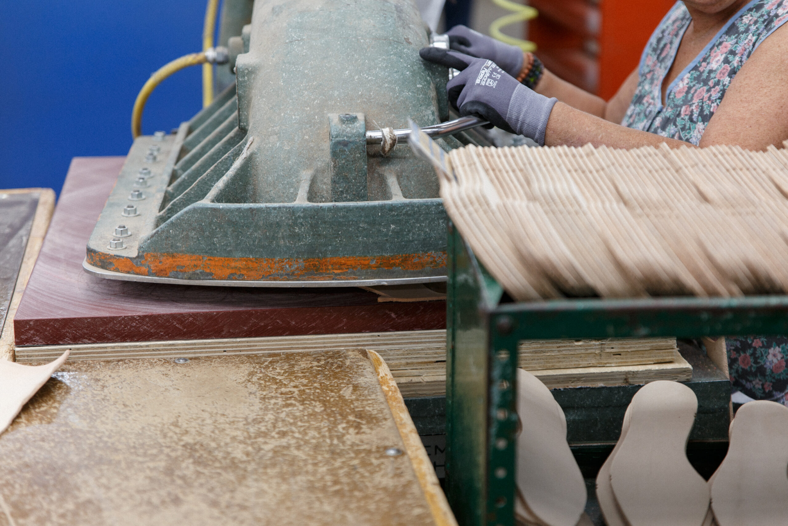 接下来就是上沿条(通过沿条机把沿条与内底上贴着的帆布条结合),放入勾心,以及填充软木。我们看到一位操作员在内底上涂抹了一团软木,然后用烙铁将其摊开。这有点像在看别人做花生酱三明治,但没那么有食欲。
